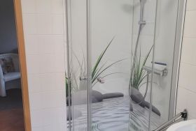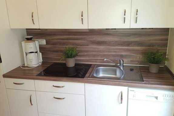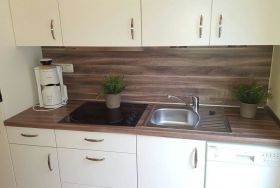 Die Ferienwohnungen mit Terrasse haben ein gemütliches Wohnzimmer mit Sitzecke (Schlafsofa), TV und einen Essbereich. Die Küche ist praktisch eingerichtet mit ausreichendem Geschirr, Besteck und Gläser. Zum Inventar gehören auch ein Wasserkocher, Toaster, Kaffeemaschine, Geschirrspüler und Mikrowelle. Das Schlafzimmer ist mit einem Doppelbett (2x90x200cm) und großzügigem Kleiderschrank ausgestattet, im zweiten Schlafzimmer stehen zwei Einzelbetten (90x200cm) und ein Kleiderschrank (100cm breit). Das Badezimmer mit Fenster hat eine Dusche und WC. Hier steht auch die Waschmaschine.