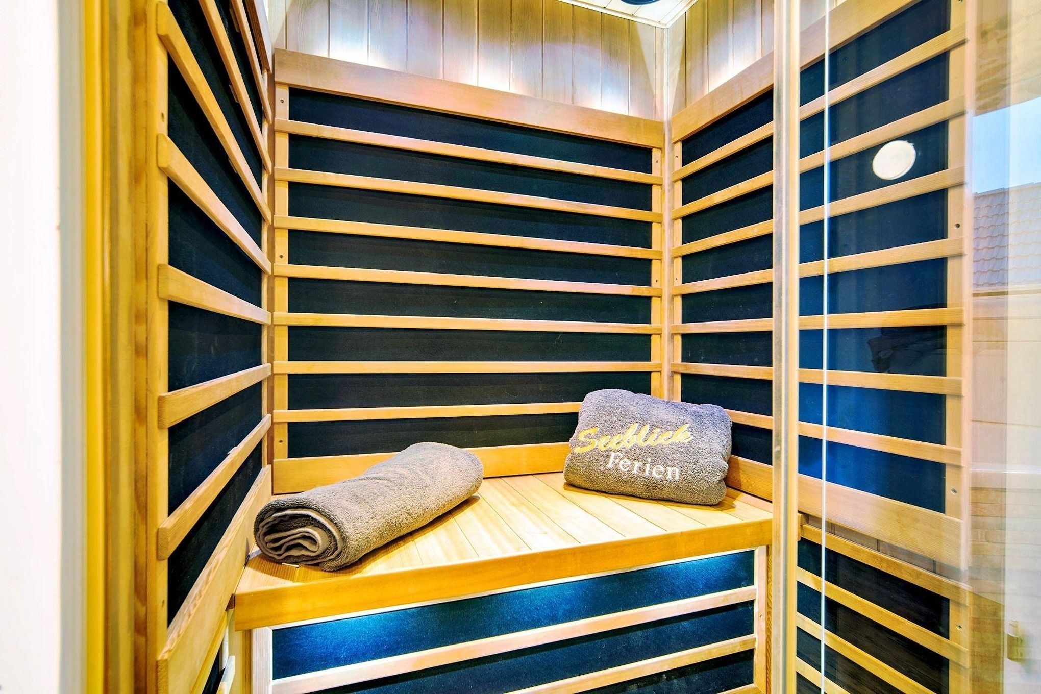 Das Obergeschoss bietet zudem ein vollausgestattetes Bad mit Whirlpoolwanne, bodengleicher Dusche, Infrarotsaunakabine mit LED-Farblichttherapie und HiFi-System mit Anschluss für MP3-Player, USB, Radio und Lautsprecher – ein wahrer Wellnessbereich mit Blick auf das Wasser und das ganze mit samtweichem Wasser, denn das Haus verfügt über eine Entkalkungsanlage.
