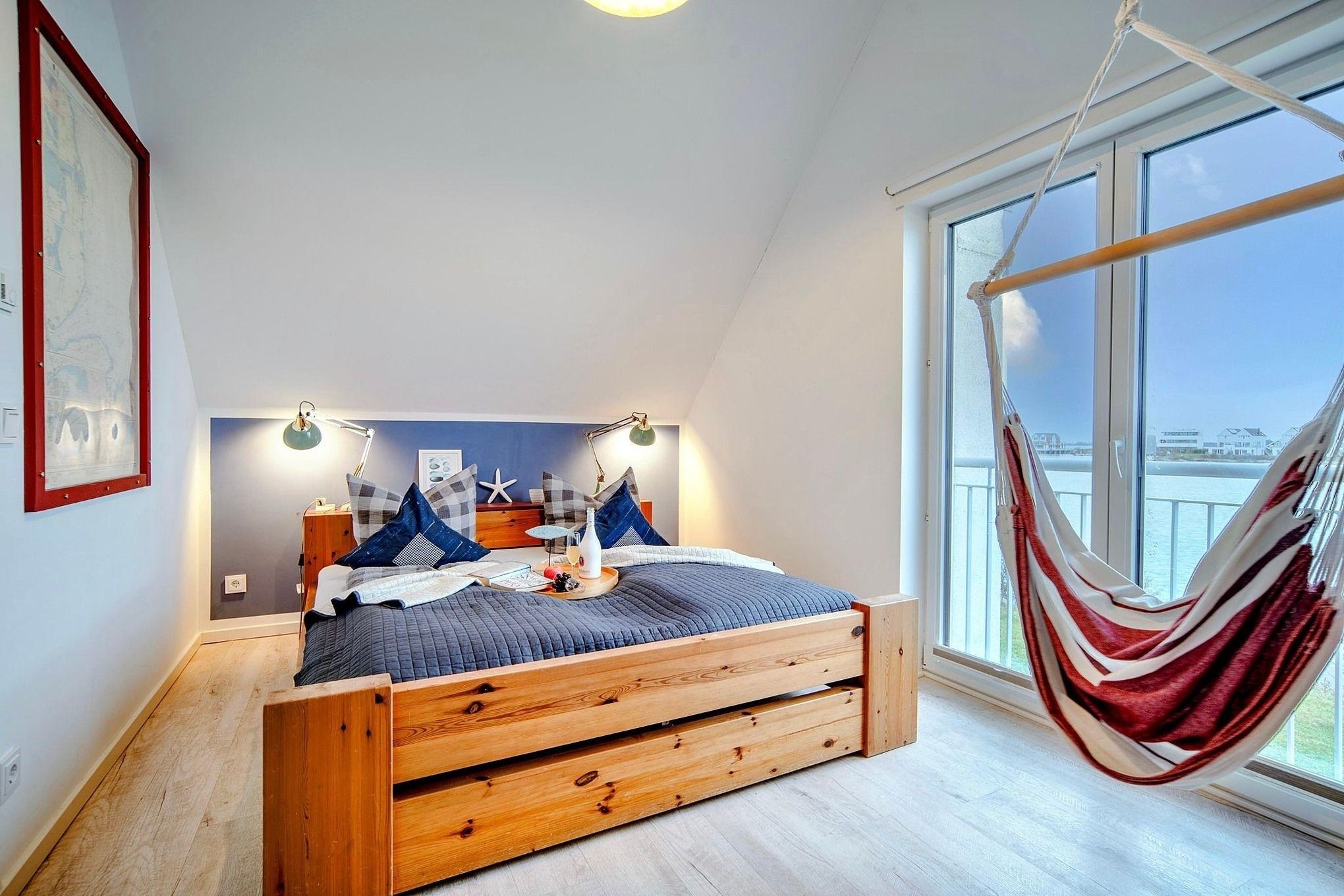 Im Obergeschoss des Ferienhauses finden Sie zwei Schlafzimmer vor, die zum Träumen einladen. Der Masterbedroom verwöhnt Sie mit einem komfortablen Doppelbett und einem atemberaubenden, direkten Wasserblick. Mit einem CD Player für Ihre Lieblingsmusik beginnen Sie den Tag. Das zweite Schlafzimmer verfügt über zwei Einzelbetten, die bei Bedarf auch zu einem Doppelbett umfunktioniert werden können, sowie ein hochwertiges Schrankbett.