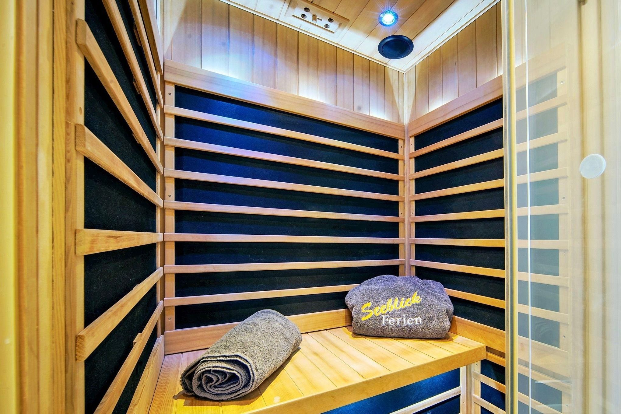 Das Obergeschoss bietet zudem ein vollausgestattetes Bad mit Whirlpoolwanne, bodengleicher Dusche, Infrarotsaunakabine mit LED-Farblichttherapie und HiFi-System mit Anschluss für MP3-Player, USB, Radio und Lautsprecher – ein wahrer Wellnessbereich mit Blick auf das Wasser und das ganze mit samtweichem Wasser, denn das Haus verfügt über eine Entkalkungsanlage.