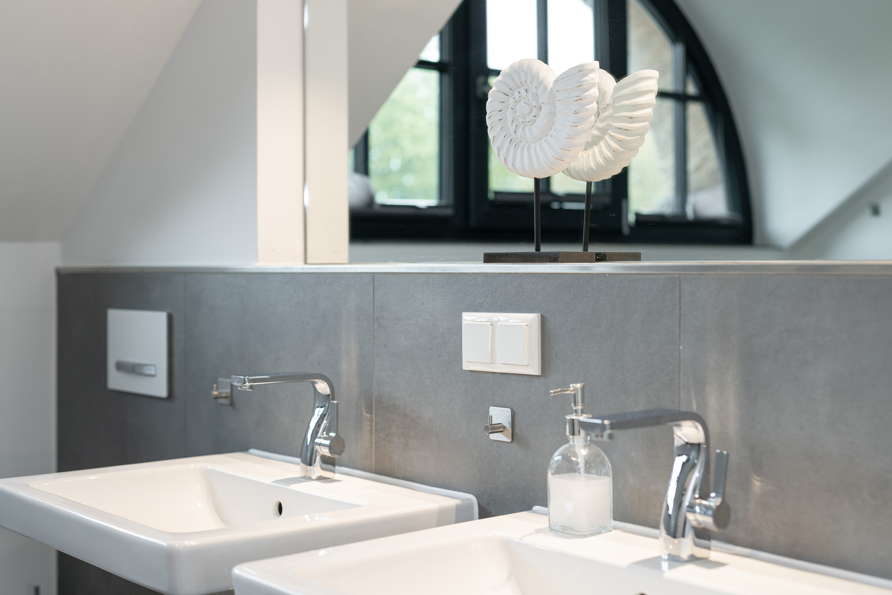 Die Bade-Lounge ist direkt vom großen Schlafzimmer aus zu begehen und bietet mit Badewanne, WC und zwei Waschbecken alle Annehmlichkeiten. Ein zusätzliches Bad mit Dusche, WC und zwei Waschbecken lässt auch bei voller Belegung des Hauses keine Engpässe entstehen.