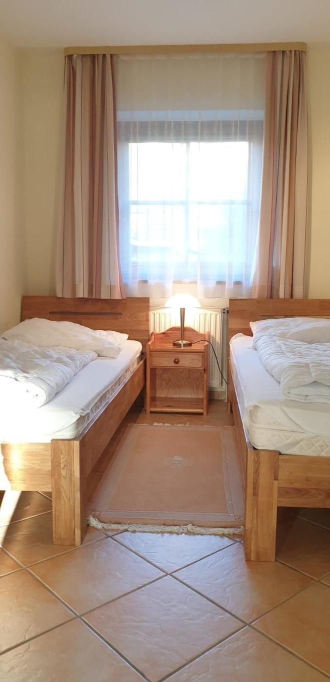 Die Ferienwohnungen mit Terrasse haben ein gemütliches Wohnzimmer mit Sitzecke (Schlafsofa), TV und einen Essbereich. Die Küche ist praktisch eingerichtet mit ausreichendem Geschirr, Besteck und Gläser. Zum Inverntar gehören auch ein Wasserkocher, Toaster, Kaffeemaschine, Geschirrspüler und Mikrowelle. Das Schlafzimmer ist mit einem Doppelbett (2x90x200cm) und großzügigem Kleiderschrank ausgestattet, im zweiten Schlafzimmer stehen zwei Einzelbetten (90x200cm) und ein Kleiderschrank (100cm breit). Das Badezimmer mit Fenster hat eine Dusche und WC. Hier steht auch die Waschmaschine.