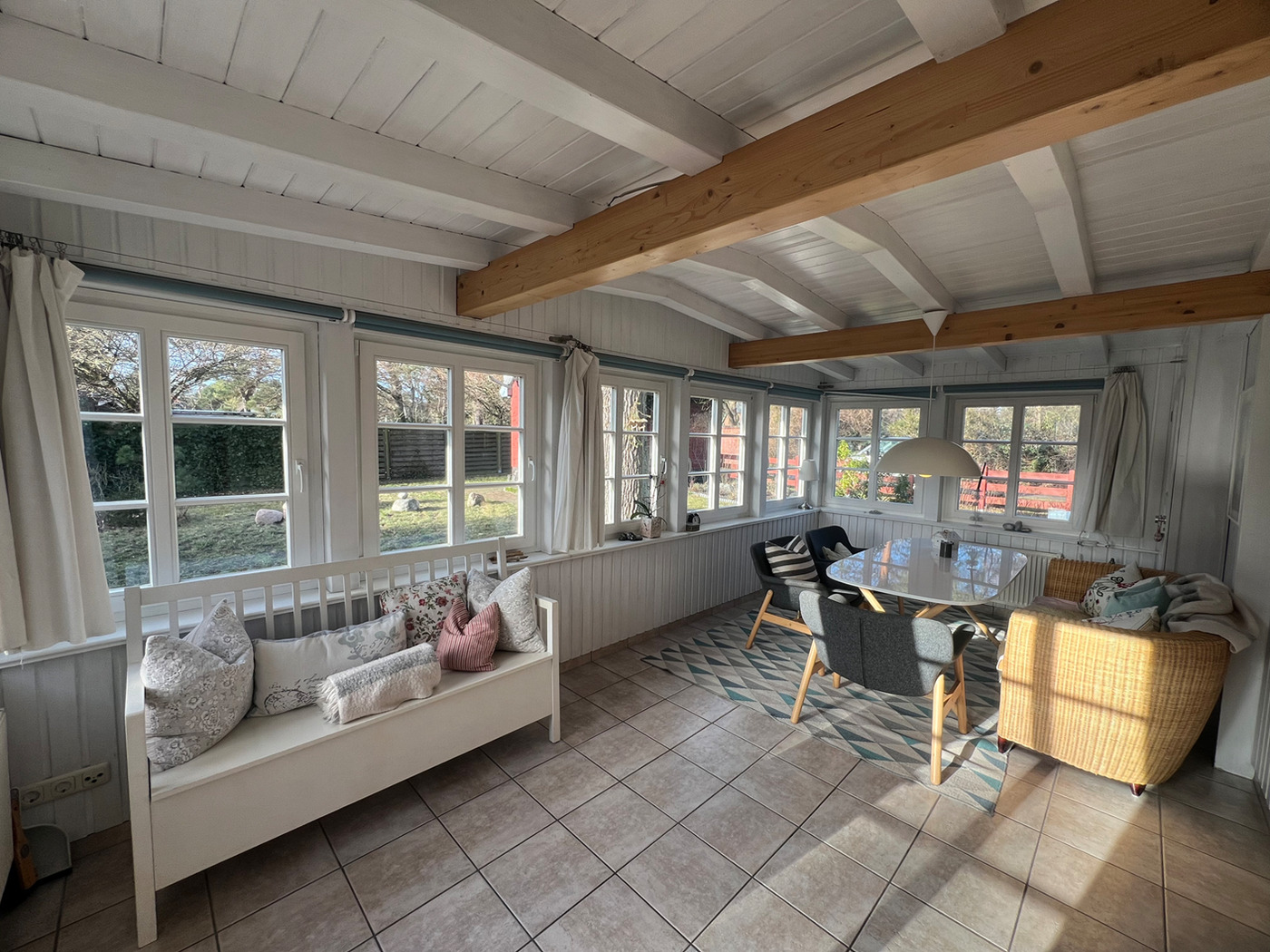 Die große Darß-Veranda mit Schaukelstuhl und 5 weiteren Sitzgelegenheiten am großen Esstisch ist der wohl gemütlichste Platz im Haus.