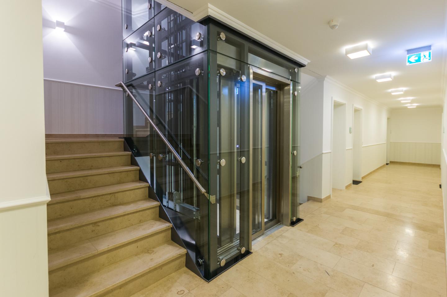 Ihre Suite in der 2. Etage mit Blick zur Ostsee (Oktober bis Mai) erreichen Sie vom Tiefgaragenplatz im Untergeschoss über einen gläsernen Fahrstuhl.
