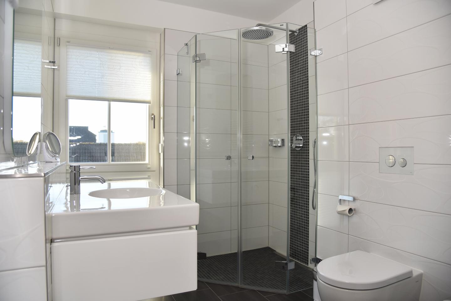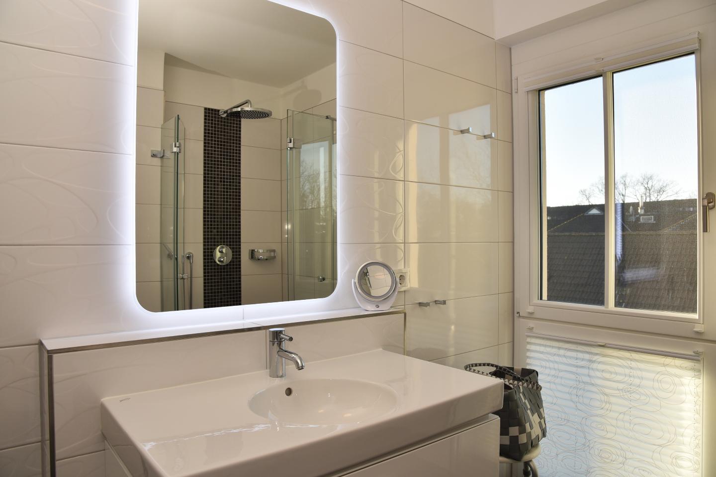 Auch das geräumige Bad mit Fenster, ebenerdiger Wellnessdusche, großem beleuchteten Spiegel und Handtuchheizkörper ist luxuriös eingerichtet.