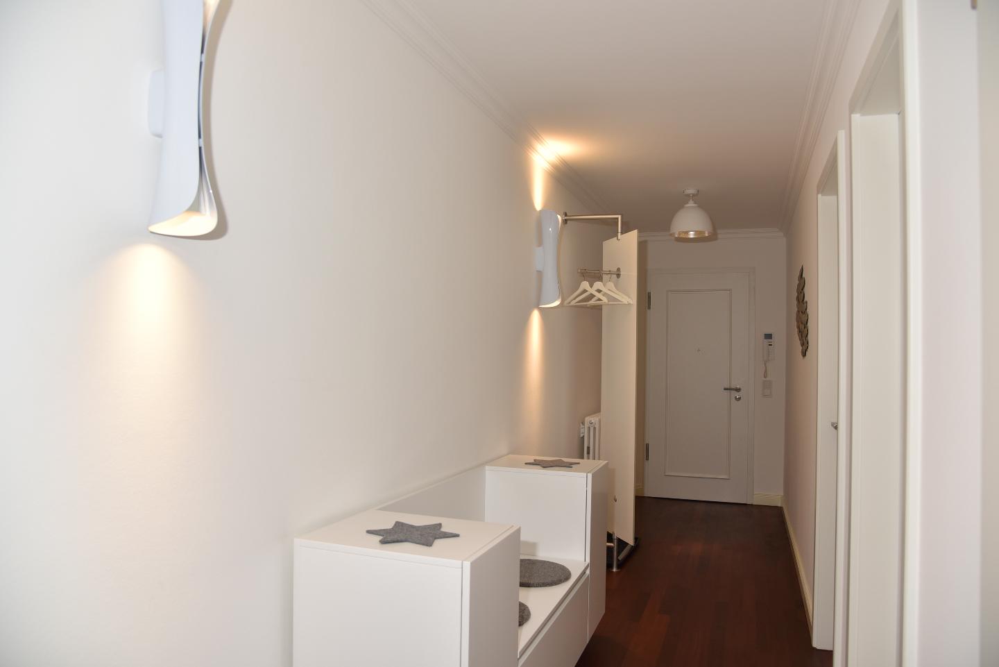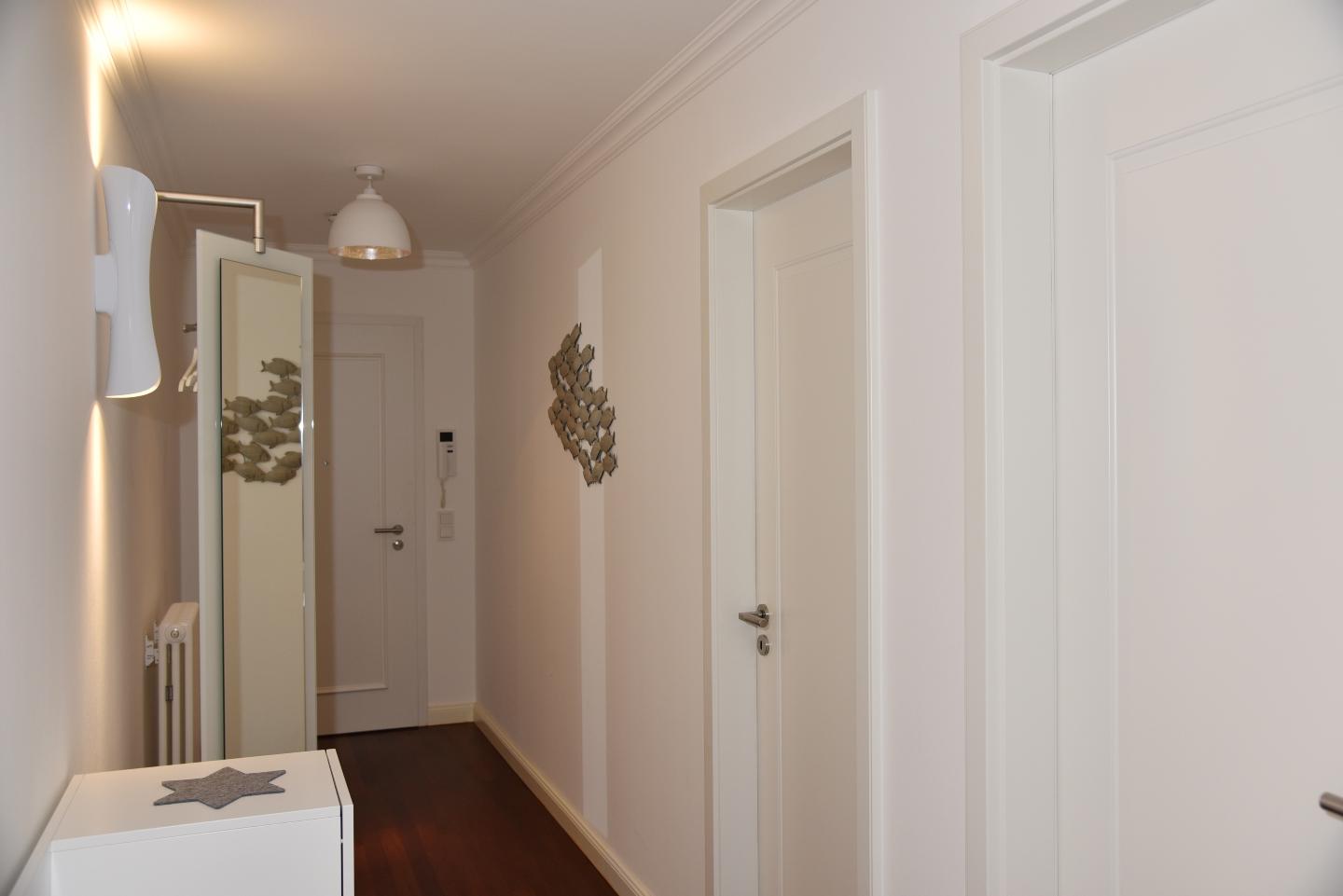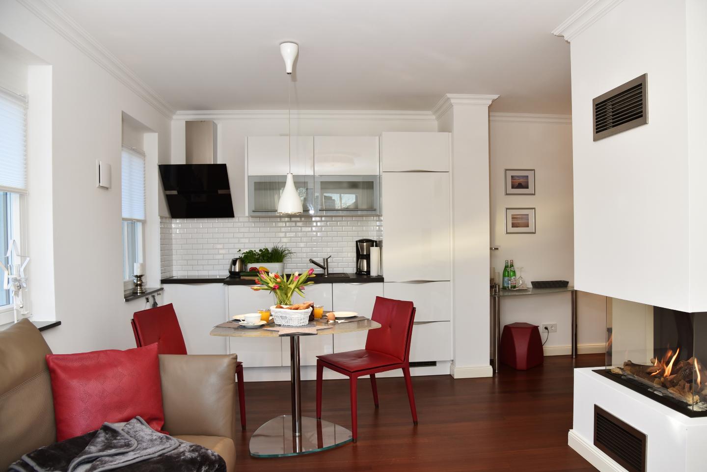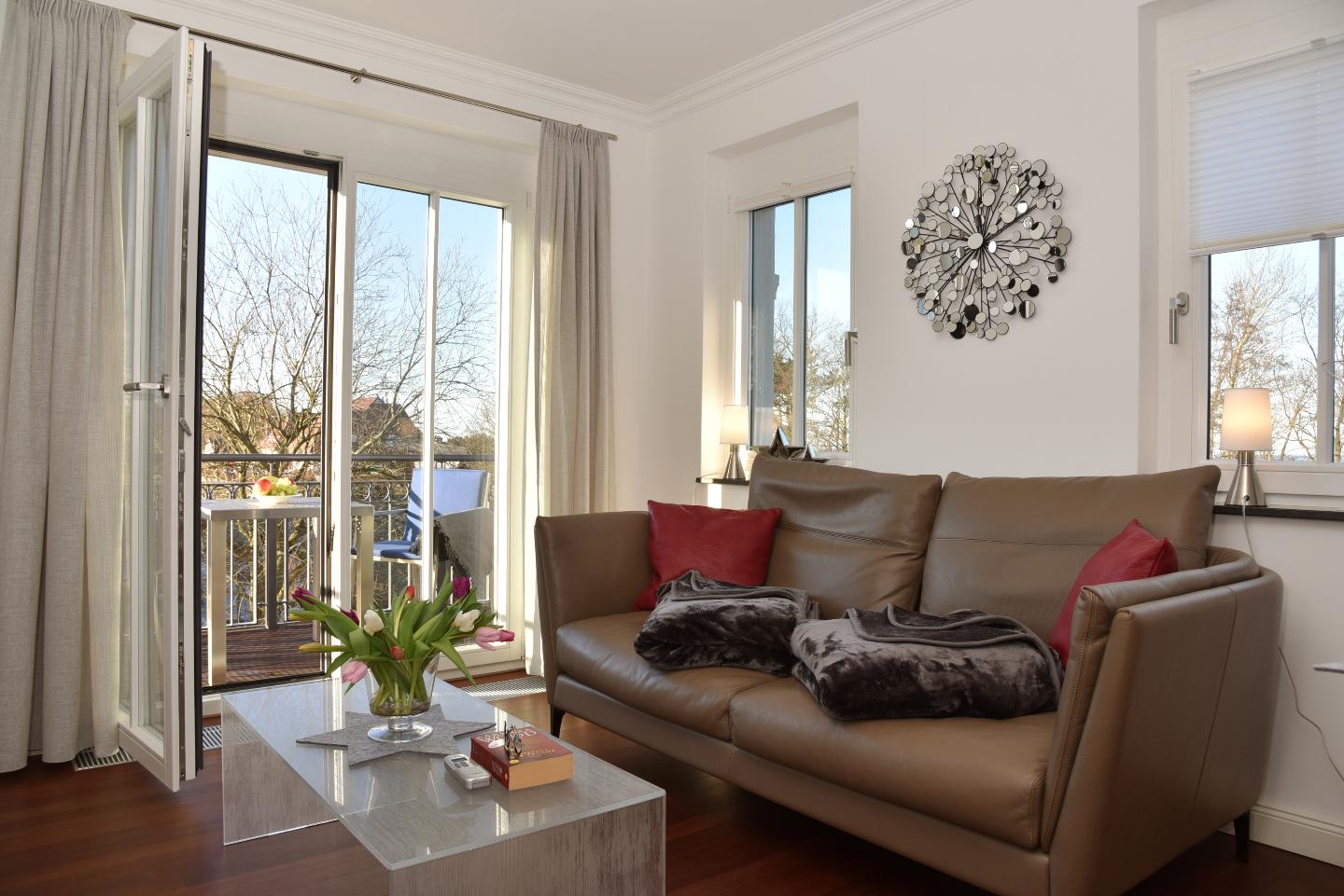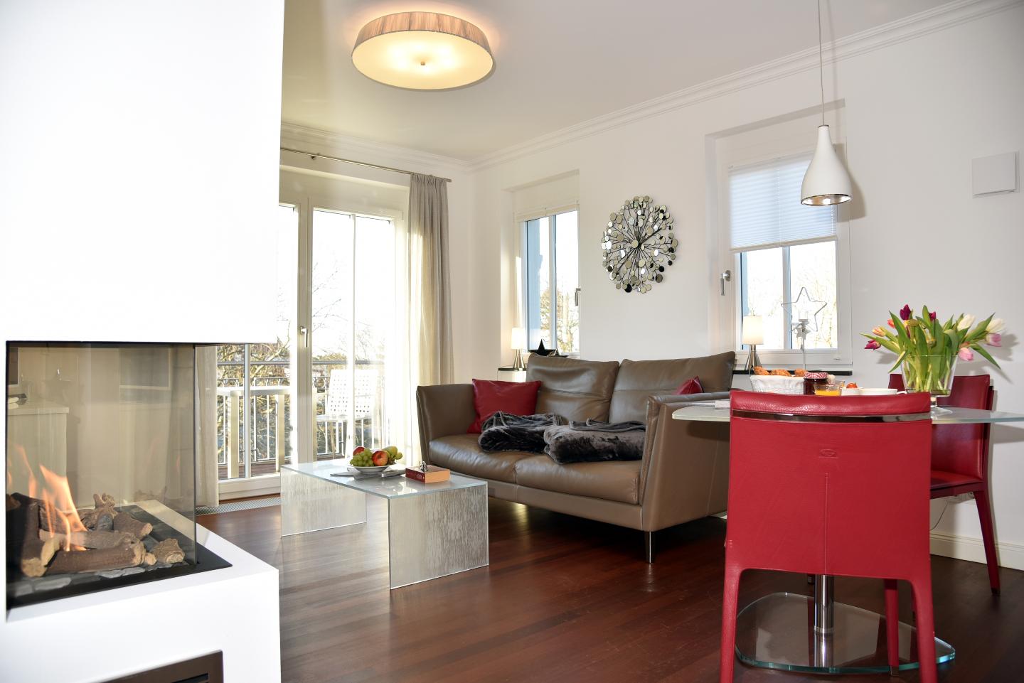 Am Gaskamin im lichtdurchfluteten Wohn-/ Essbereich entspannen Sie auch bei kühler Witterung in behaglicher Wohlfühlatmosphäre. Vom zeitlos möblierten nach Westen ausgerichteten Balkon blicken Sie auf die Promenade in Richtung Seebrücke und genießen den Sonnenuntergang.