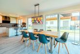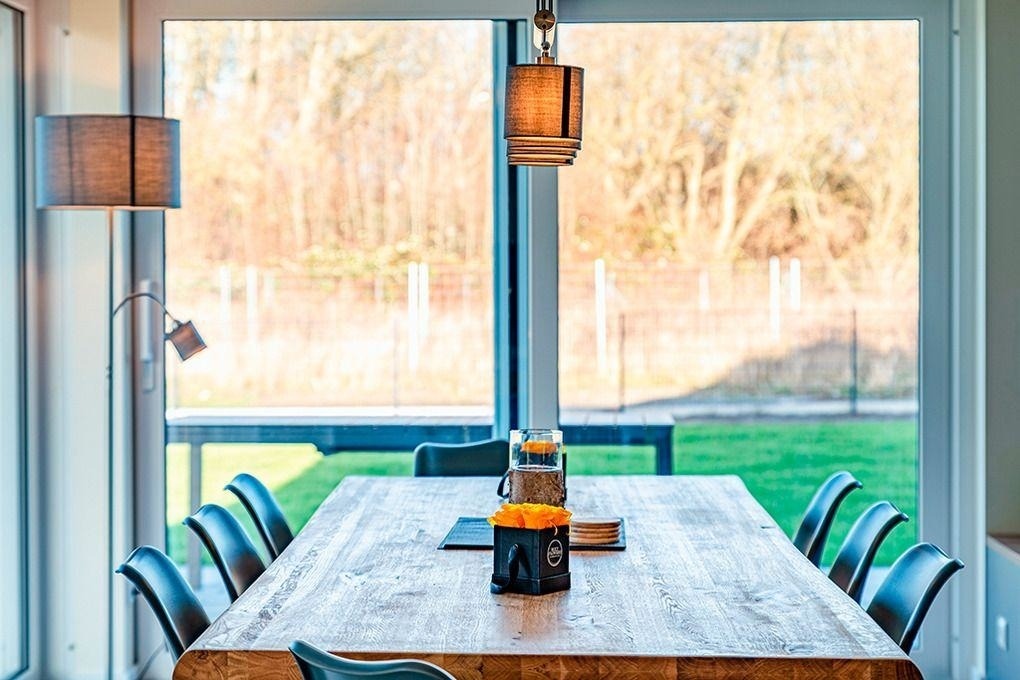 Das lichtdurchflutete Wohnzimmer ist mit einem langen Esstisch, großer Wohnlandschaft, Sitzfenster, einem großen Fernseher und Kamin ausgestattet.