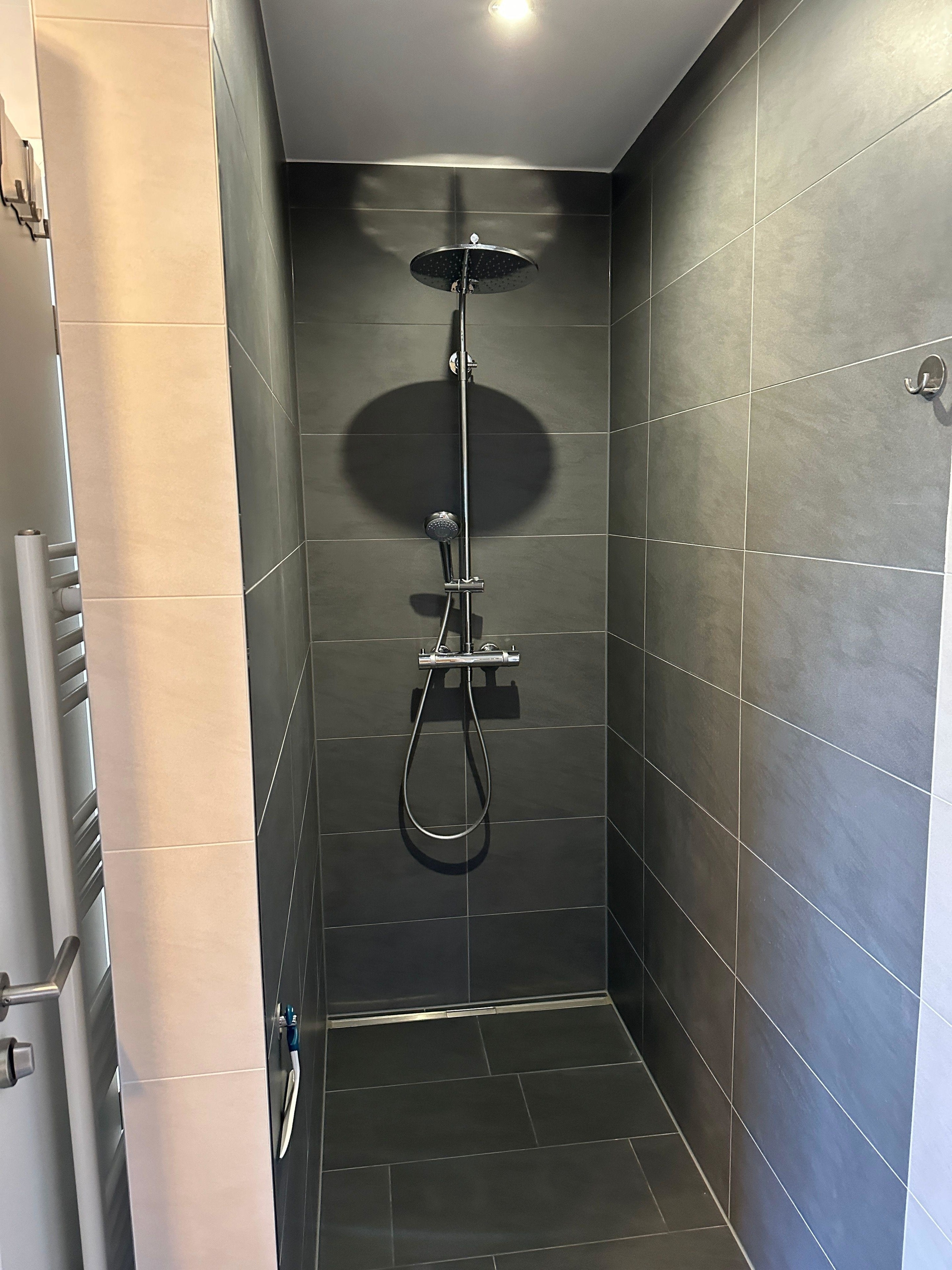Duschbad mit integrierter Sauna und direkten Zugang in den Garten