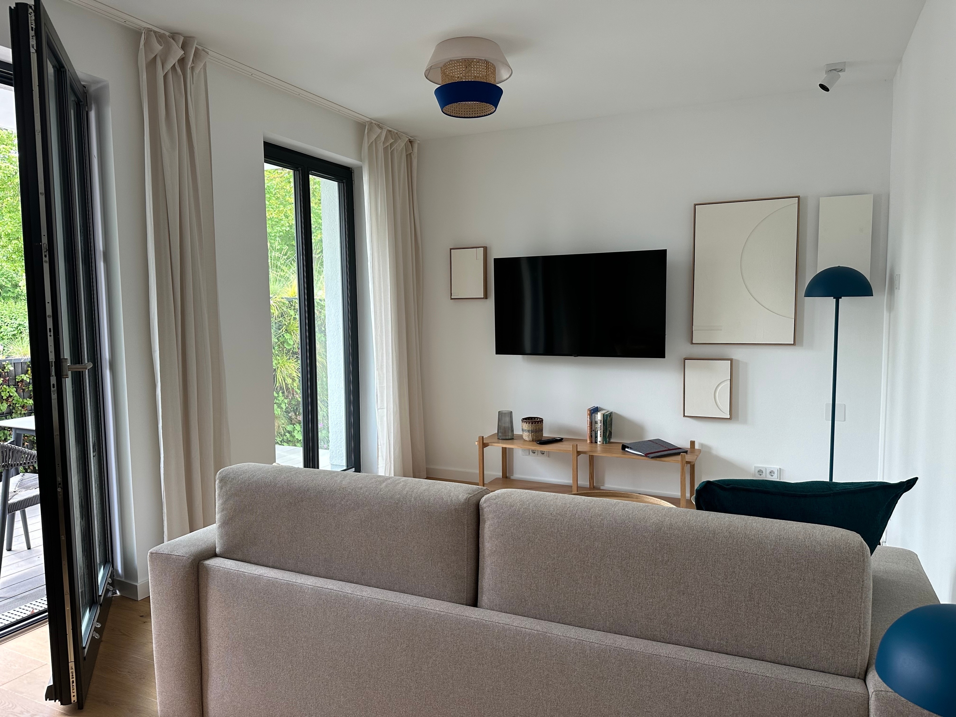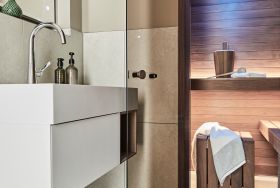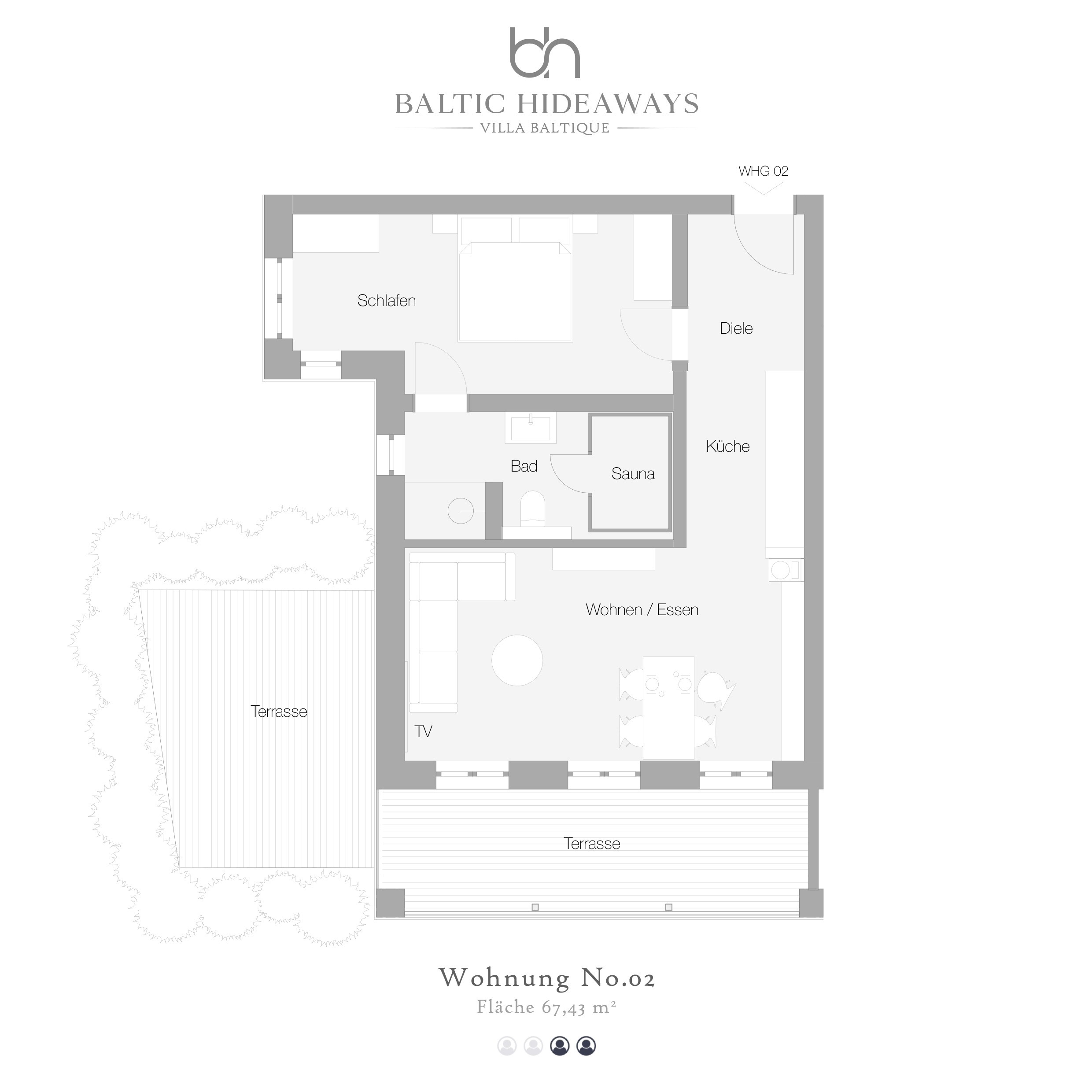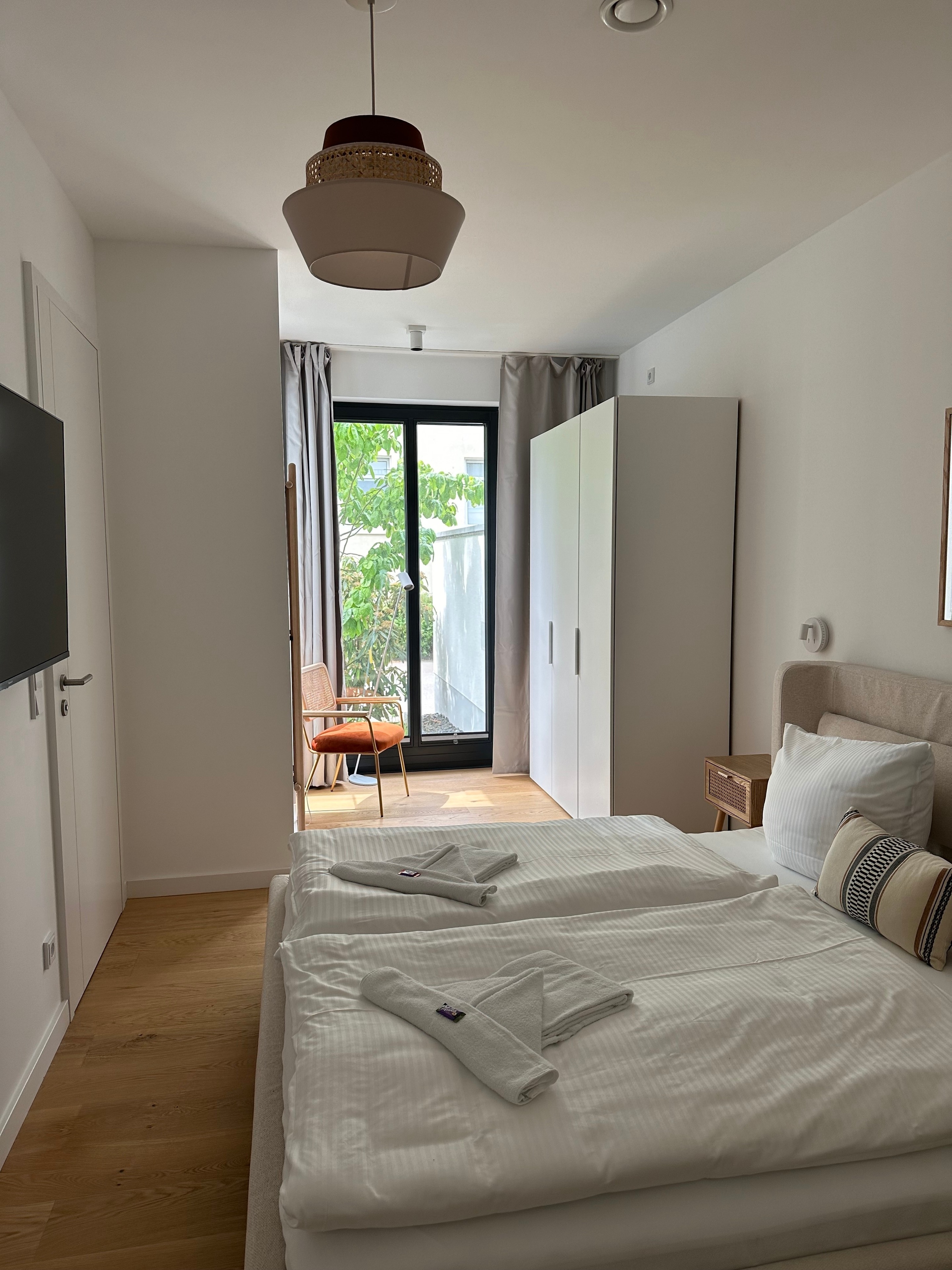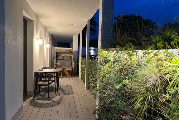 Die Garden Suite mit Terasse befindet sich im Erdgeschoss und verfügt über geräumige ca. 67 qm, über einen separaten Schlaf-/Wohnraum, eine offene Küchenzeile und ein Badezimmer mit Dusche sowie einer Sauna.