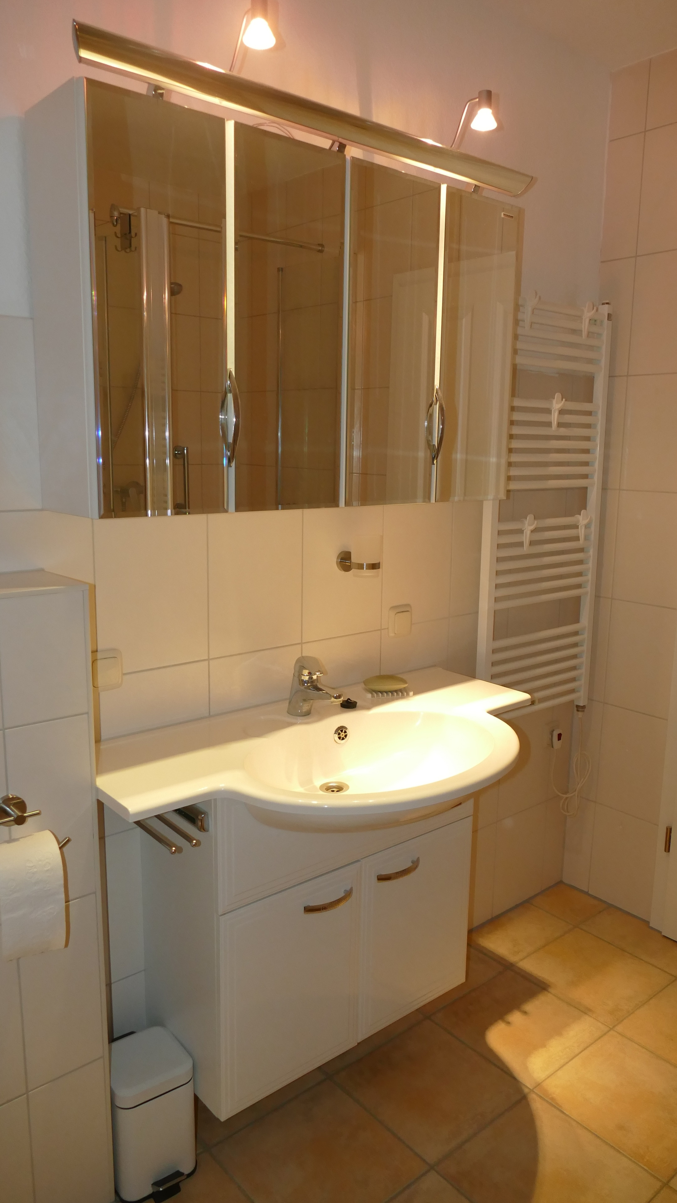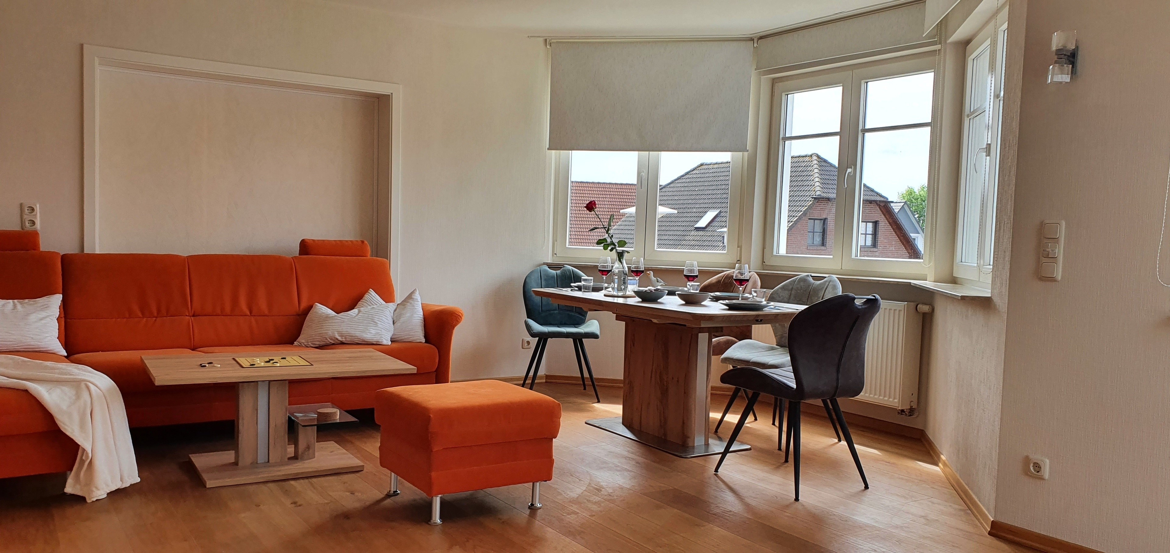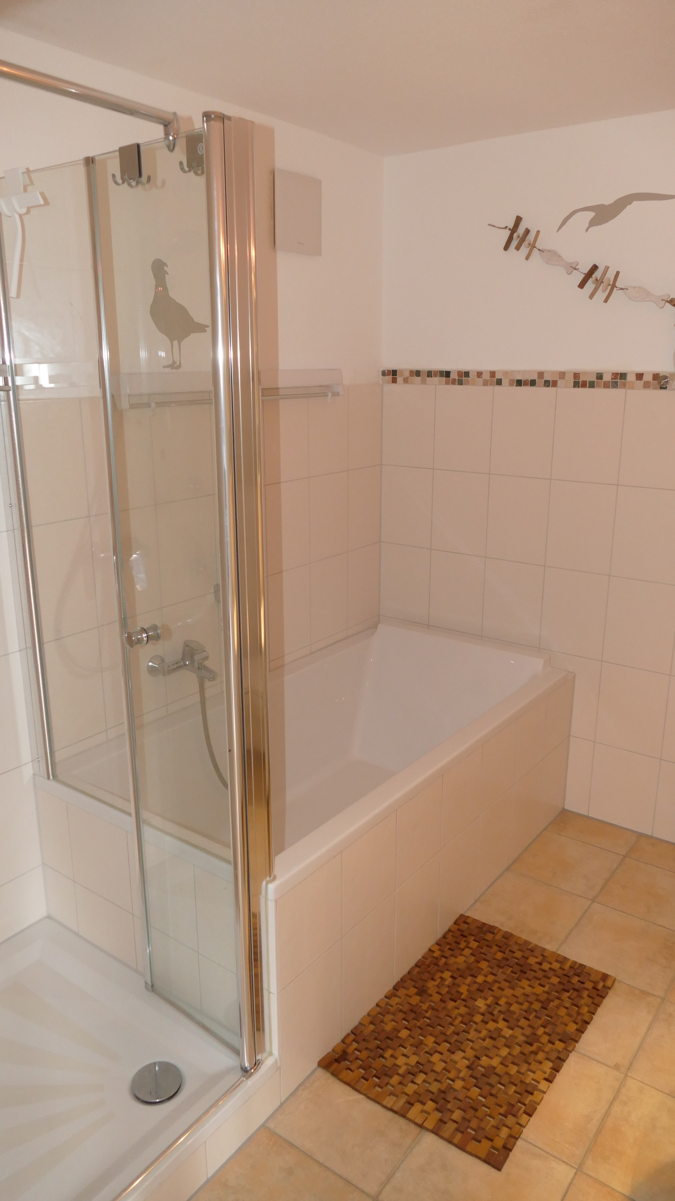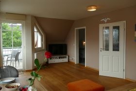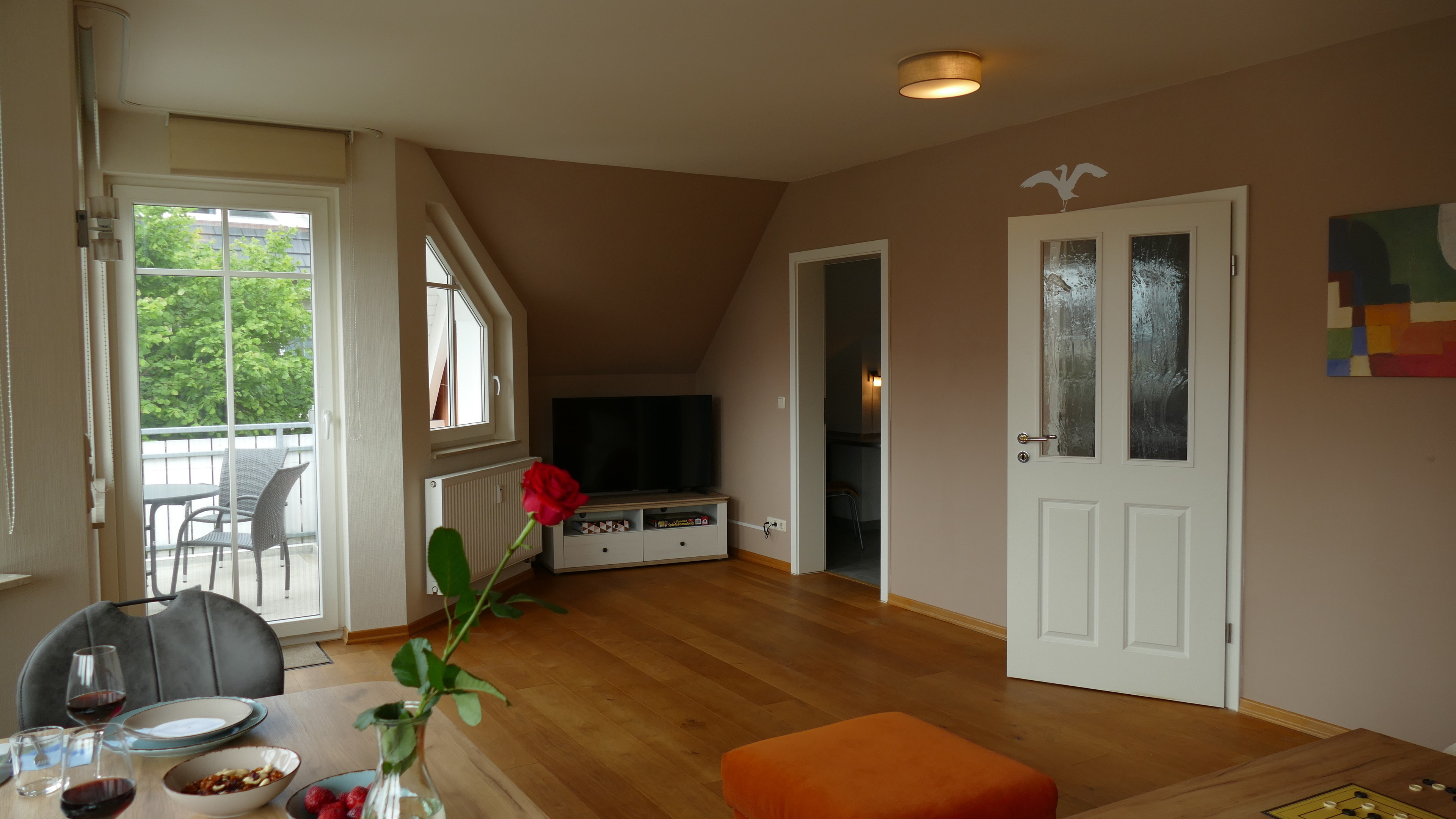 Über einen geräumigen Flur gelangt man in das Schlafzimmer mit Doppelbett. Im Badezimmer sind eine Glasdusche mit Sitz, Badewanne, Handtuchheizkörper, Föhn, WC und Waschbecken zu finden. Im Wohnzimmer befindet sich ein großes Sofa, ein ausziehbarer Esstisch und ein großer Smart-TV. Der große Süd-West-Balkon bietet Abendsonne und ist mit Tisch und Stühlen sowie Sonnenschirm ausgestattet. Die Küche ist ausgestattet mit Herd, Backofen, Spülmaschine, Kühlschrank, Gefrierschrank und Waschmaschine. Ein kleiner Fahrradraum steht zur Verfügung. In allen Räumen gibt es kostenloses WLAN sowie Fliegengitter und Rollos bzw. Gardinen.