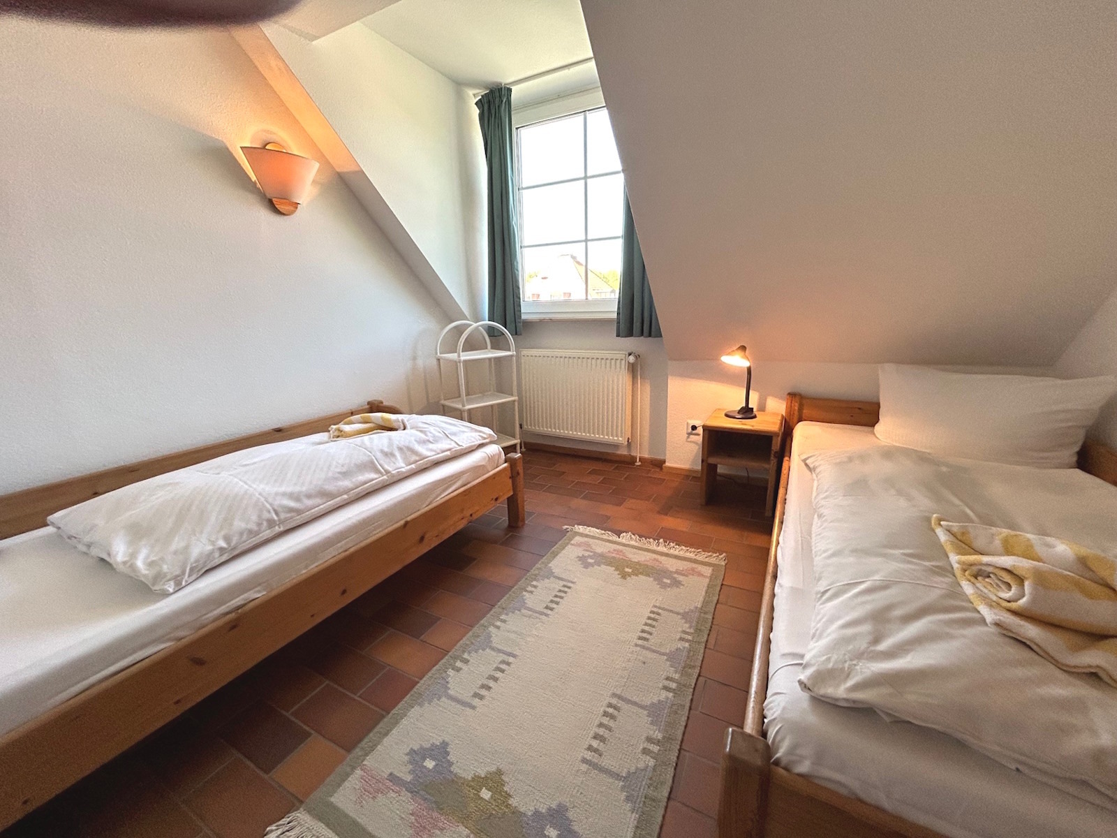 3 Zimmer-Maisonette ca. 75 qm für 2-6 Personen, Haus P in der Residenz Kormoran, Grüne Straße 45A-R, Ostseebad Prerow. 1.OG: Wohnzimmer mit Schlafcouch, Sitzgarnitur, Kleiderschrank, SAT-TV/Radio, WLAN, Duschbad/WC, Balkon, Essecke mit Küchenzeile (Spülmaschine). 2.OG: 2 Schlafzimmer, 1x Doppelbett, 1x 2 Einzelbetten, Dusche/WC