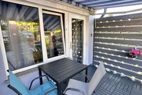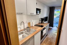 Im Nebenhaus dahinter erwarten sie vier Sparferienwohnungen mit einer Größe von 22qm, Schlafplätze für bis zu 3 Personen und kleiner Terrasse. Hier gilt das Motto: klein aber fein und ist für alle die gedacht, die viel unterwegs sind und fast nur zum Schlafen in die Unterkunft kommen. Eine Sparwohnung, Nr.1 ist mit Einzelbetten und drei, Nr.2, 3 und 4, mit Doppelbett ausgestattet.