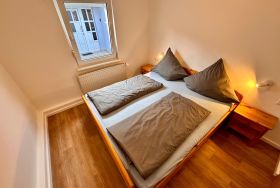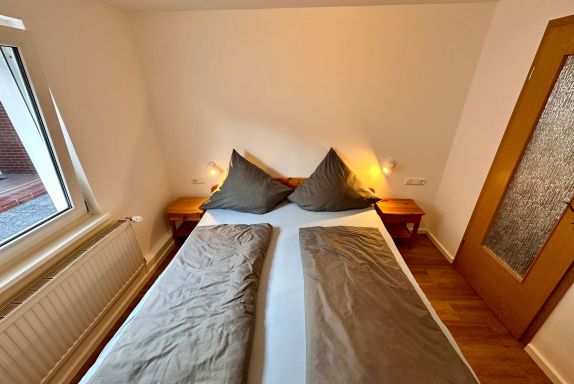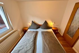 Im Nebenhaus dahinter erwarten sie vier Sparferienwohnungen mit einer Größe von 22qm, Schlafplätze für bis zu 3 Personen und kleiner Terrasse. Hier gilt das Motto: klein aber fein und ist für alle die gedacht, die viel unterwegs sind und fast nur zum Schlafen in die Unterkunft kommen. Eine Sparwohnung, Nr.1 ist mit Einzelbetten und drei, Nr.2, 3 und 4, mit Doppelbett ausgestattet.