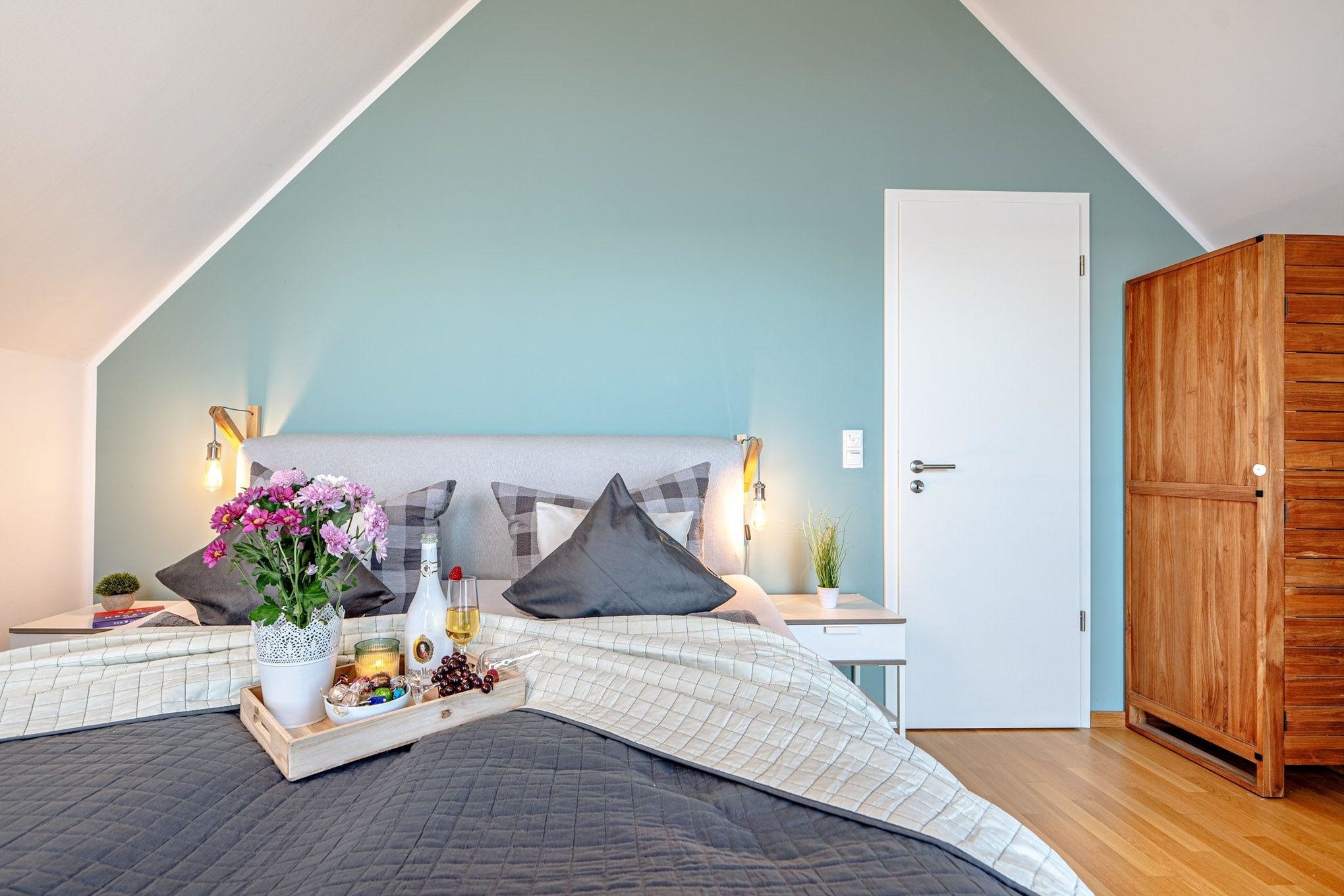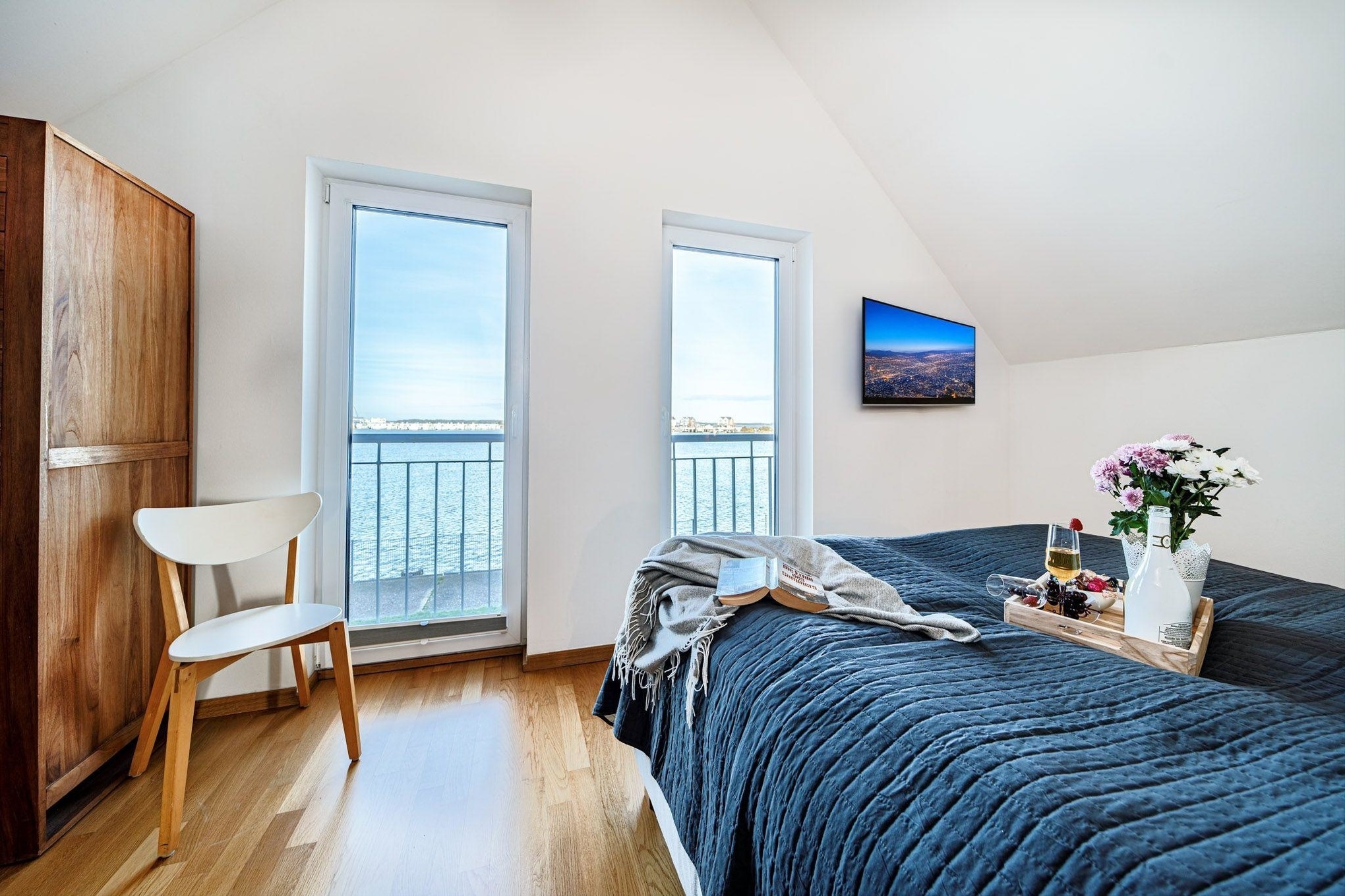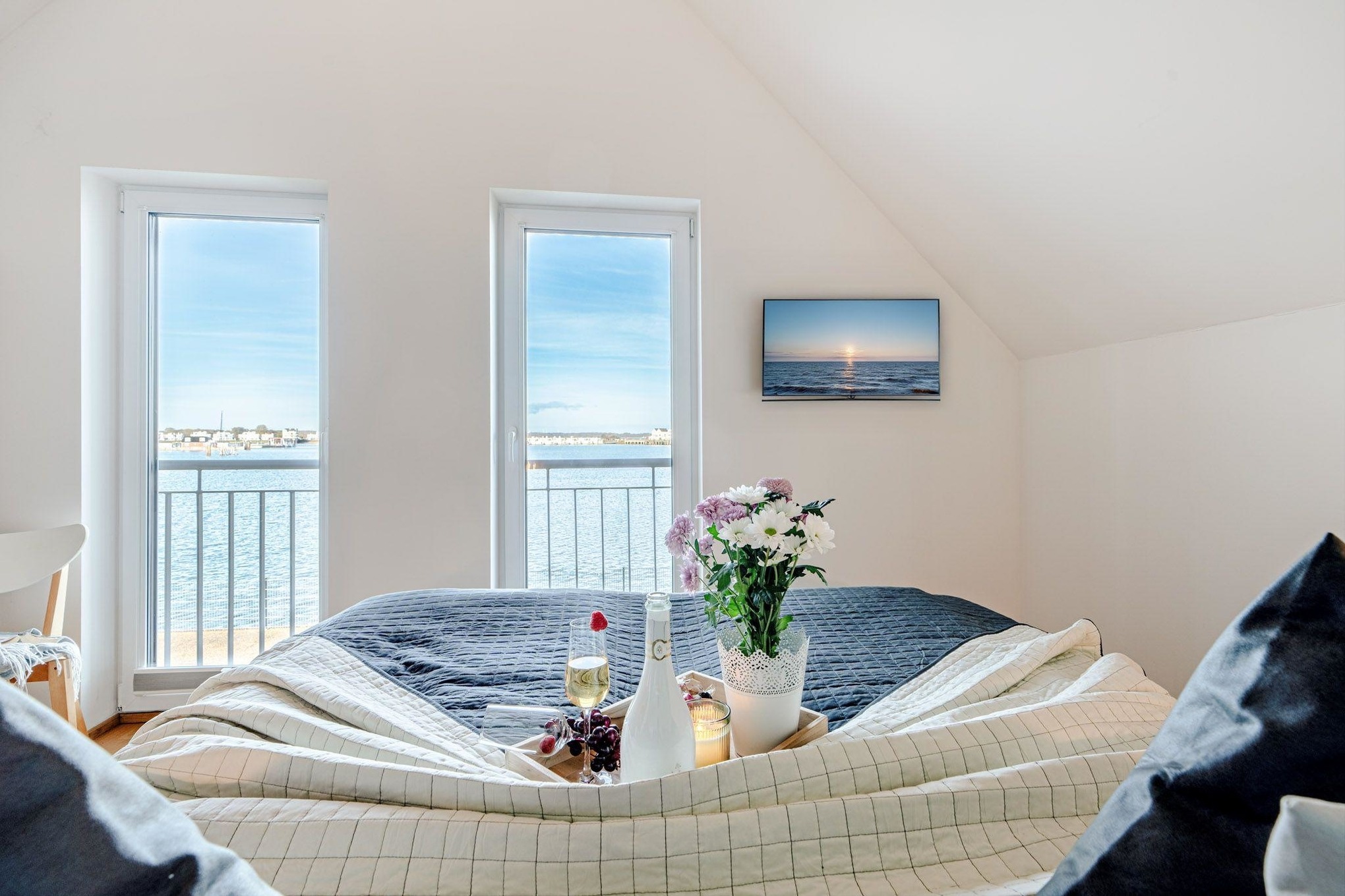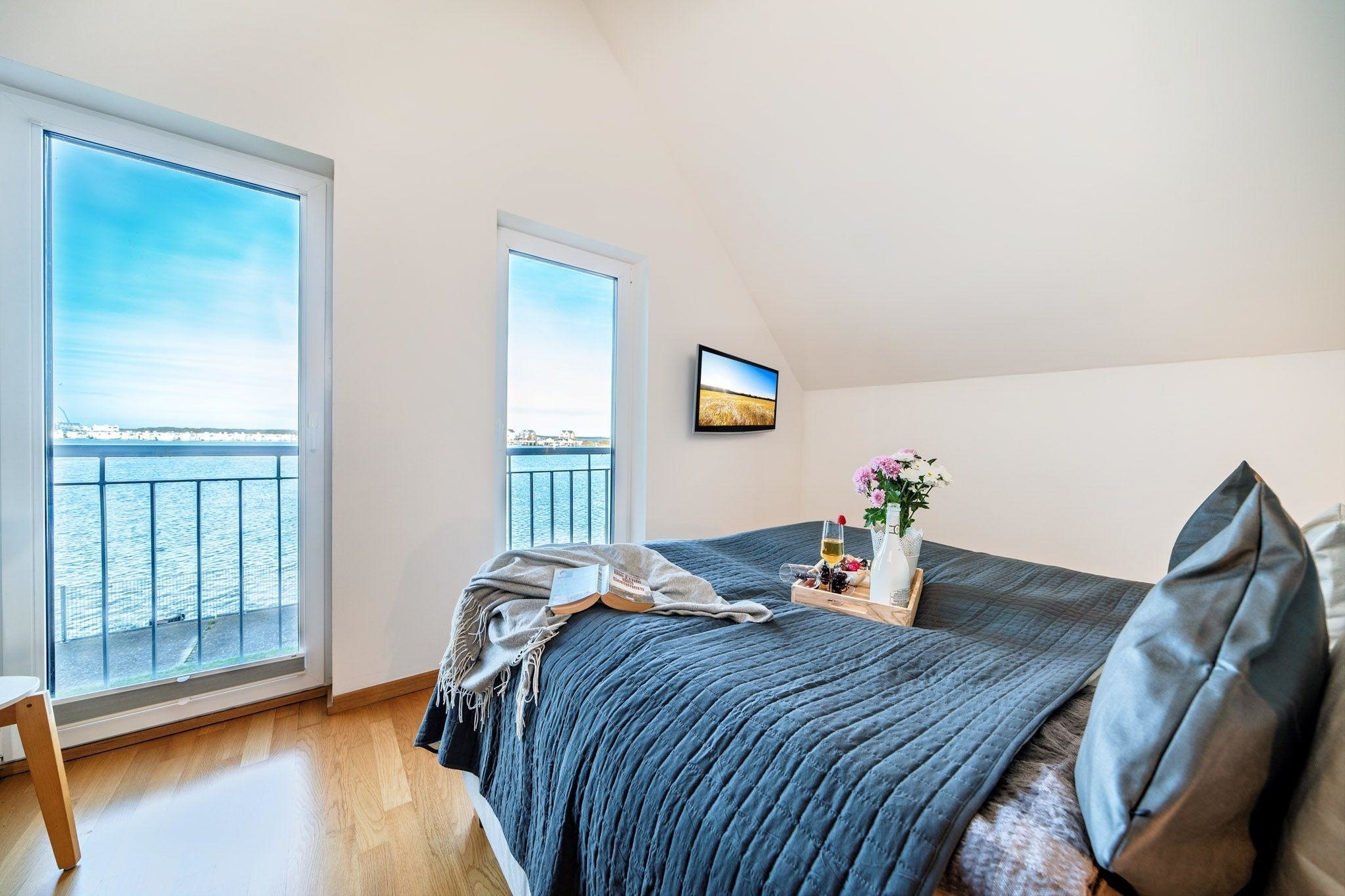 Im ersten Obergeschoss erwartet Sie ein Ruhebereich mit beeindruckendem Meerblick. Das Hauptschlafzimmer ist mit einem komfortablen Boxspringbett ausgestattet, während im zweiten Schlafzimmer zwei Einzelbetten zur Verfügung stehen. Für unsere kleinsten Gäste stellen wir gerne ein Babybett bereit.