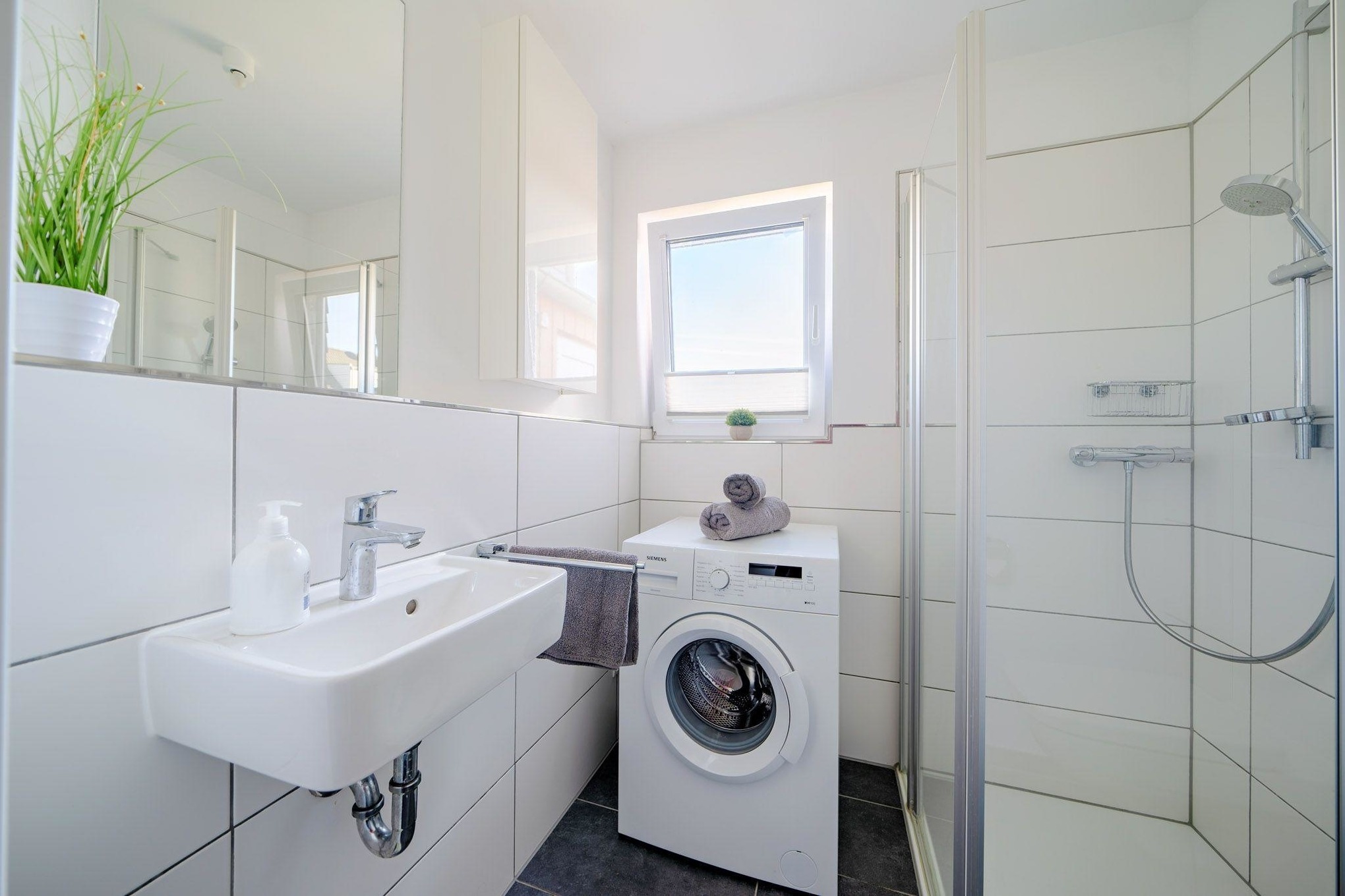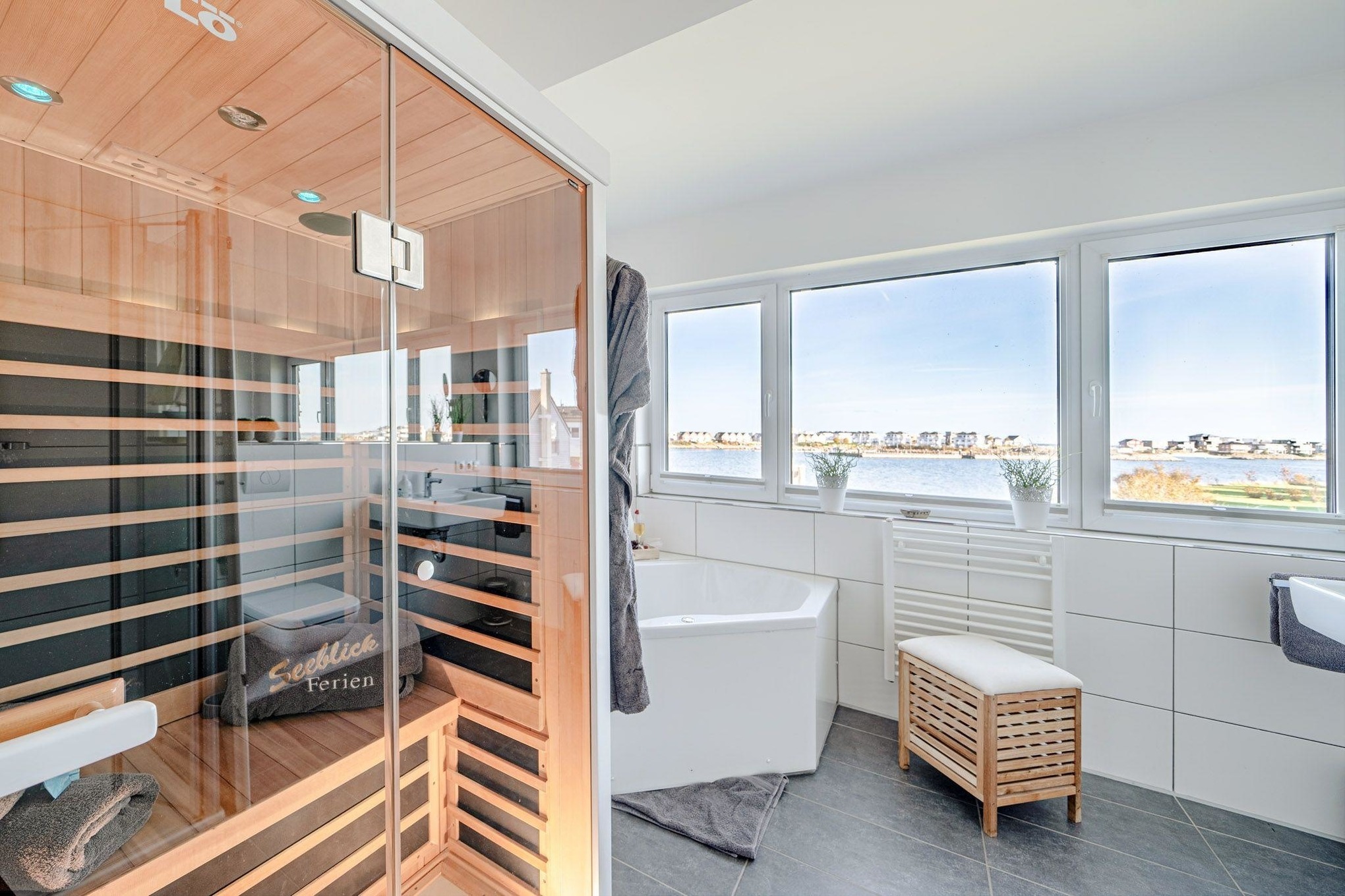 Zwei stilvolle Badezimmer, jeweils eines auf jeder Wohnebene, sorgen für höchsten Komfort. Das Highlight des ersten Obergeschosses ist die Infrarot-Sauna und der Badewanne mit Whirlpoolfunktion mit Wasserblick – hier können Sie entspannen und die Seele baumeln lassen.