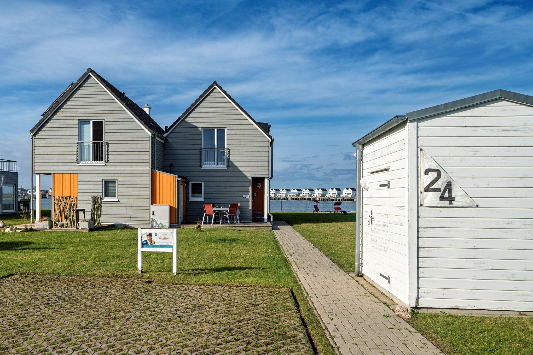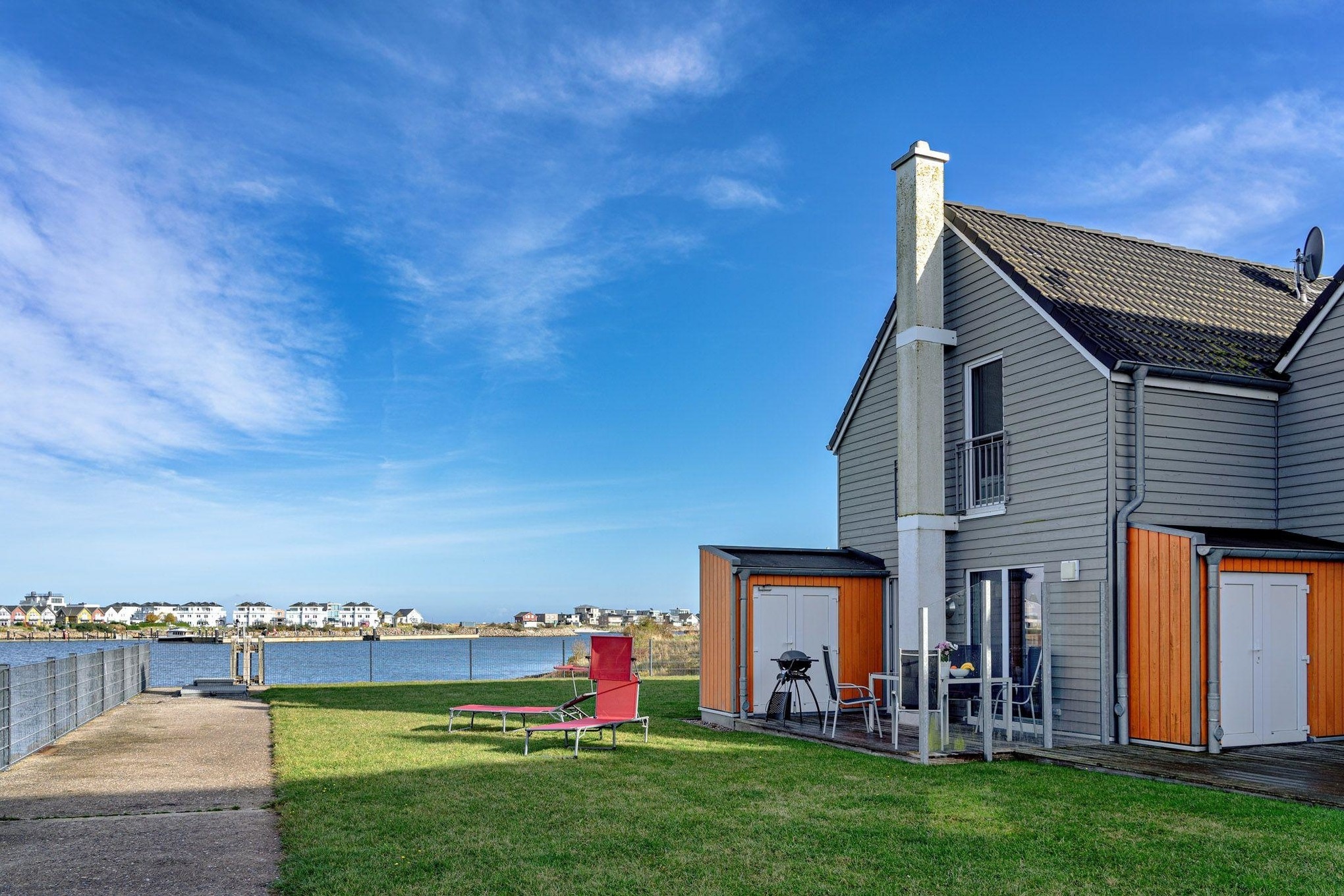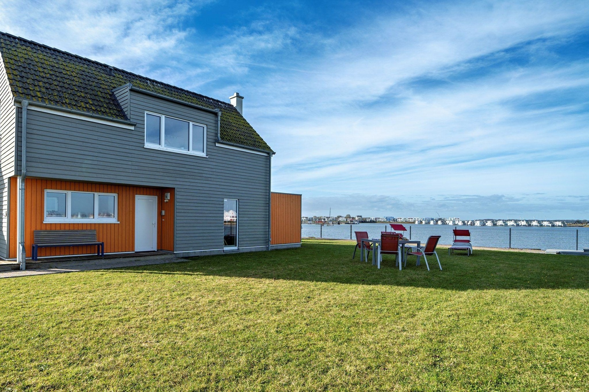 Das Ferienhaus Am MEER by Seeblick Ferien ORO verfügt über eine Terrasse vor und hinter dem Haus. Von hier aus können Sie das „Hafenkino“ mit vorbeifahrenden Segel- und Sportbooten hautnah erleben. Der eigene Garten lädt zum Verweilen und Spielen ein – der perfekte Ort für erholsame Stunden im Freien.