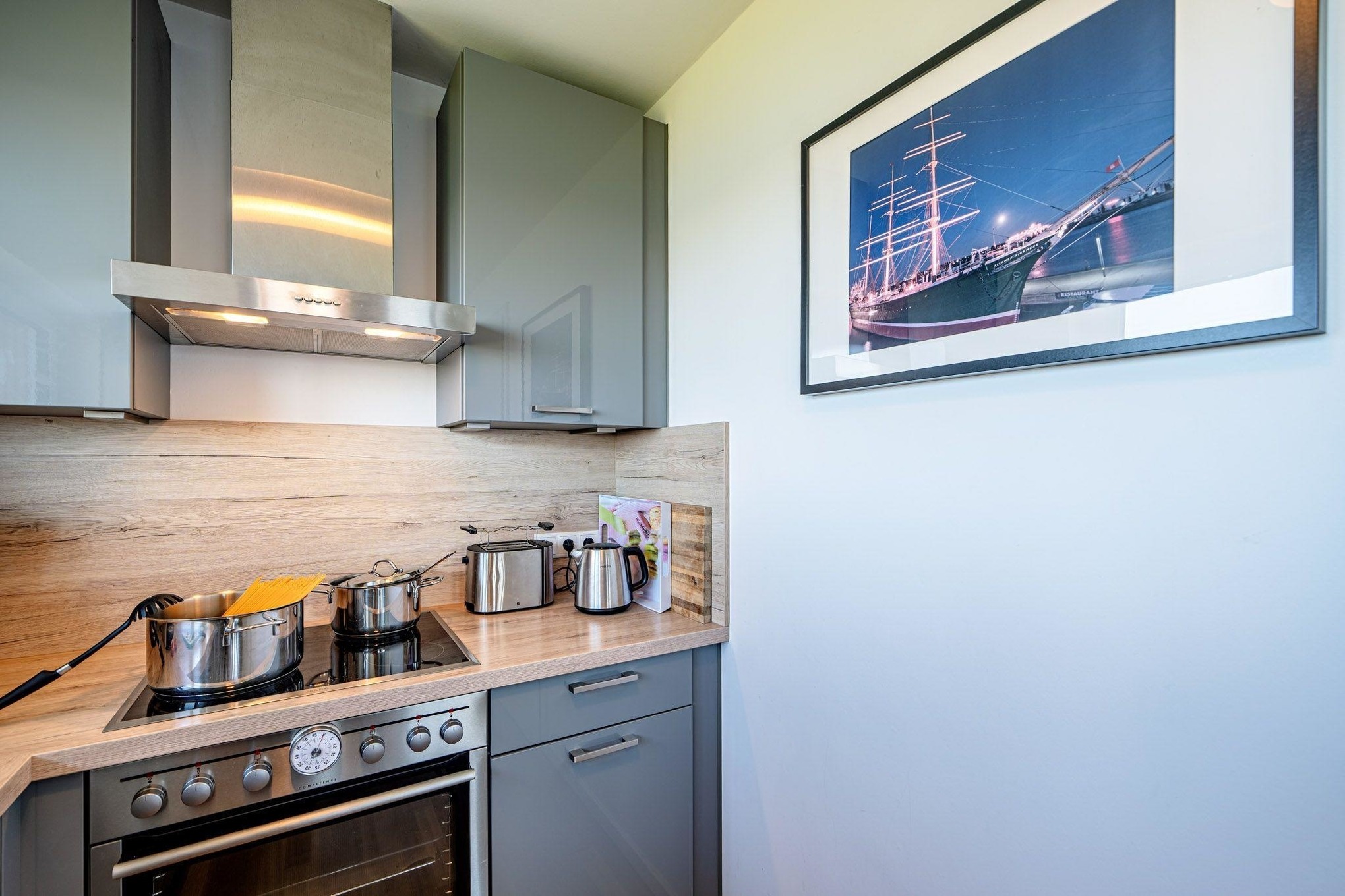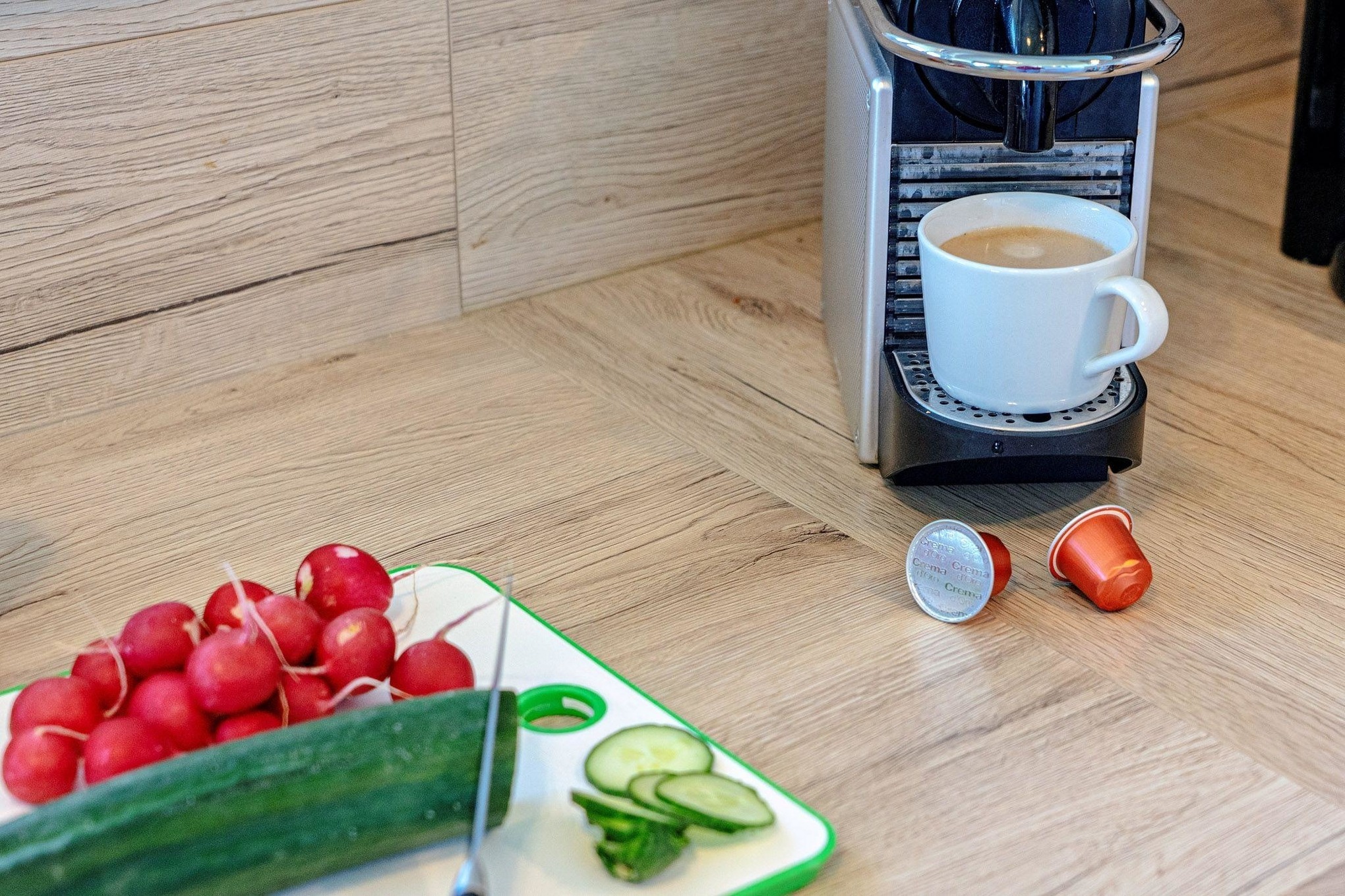 Die hochwertig ausgestattete Küche lässt keine Wünsche offen. Hier finden Sie moderne Geräte, darunter eine Nespresso- und eine Senseo-Padmaschine, die Ihren Kaffeegenuss auf höchstem Niveau garantieren.