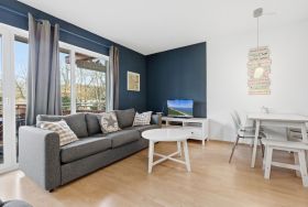 Nur 50 Meter bis zur Ostsee. Großer Balkon. 4 Personen. 58 qm. Abschließbarer separater Fahrradraum. Gratis WLAN, Kinderreisebett/-hochstuhl. Waschmaschine im Bad. Stellplatz direkt am Haus.