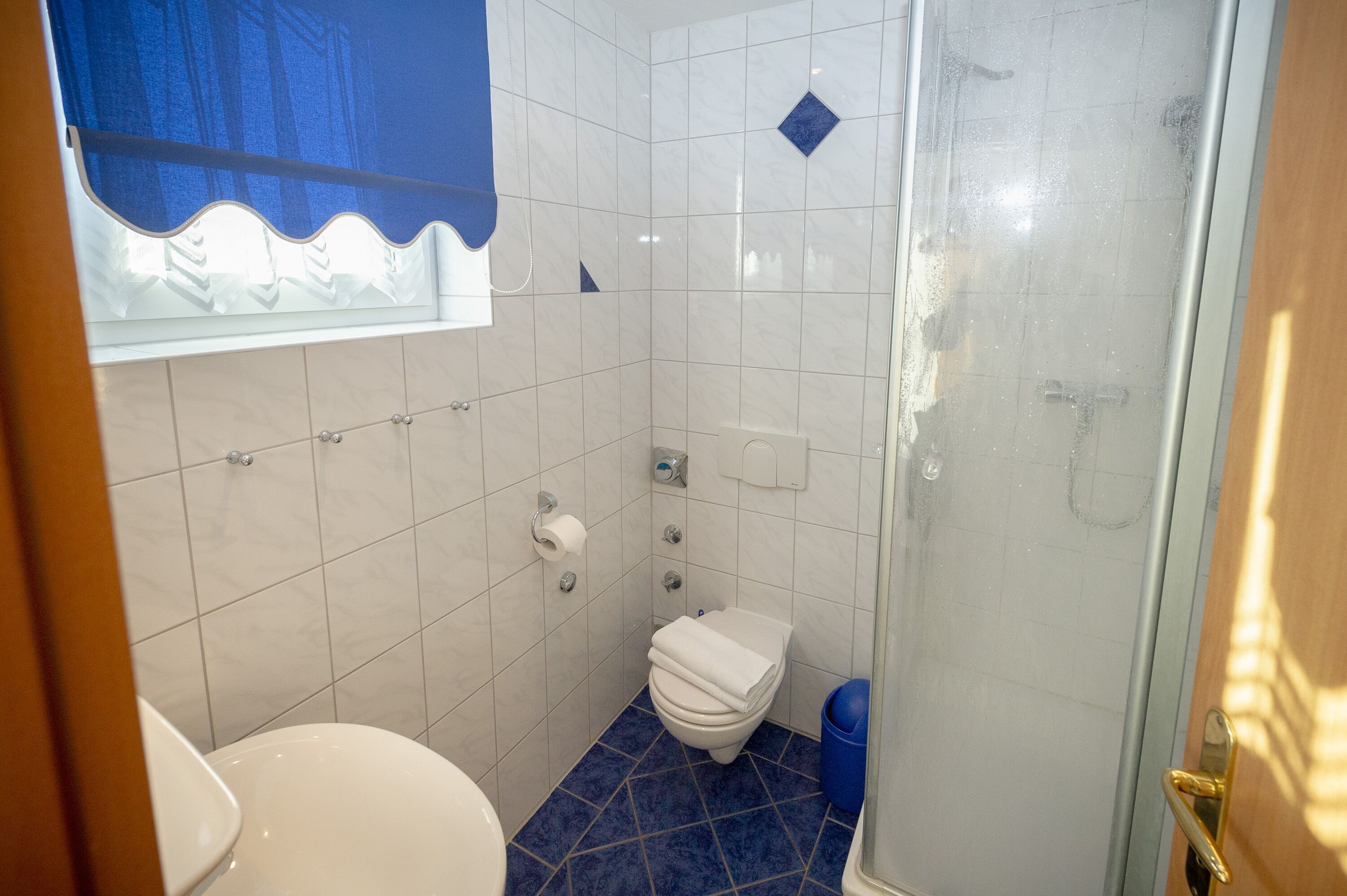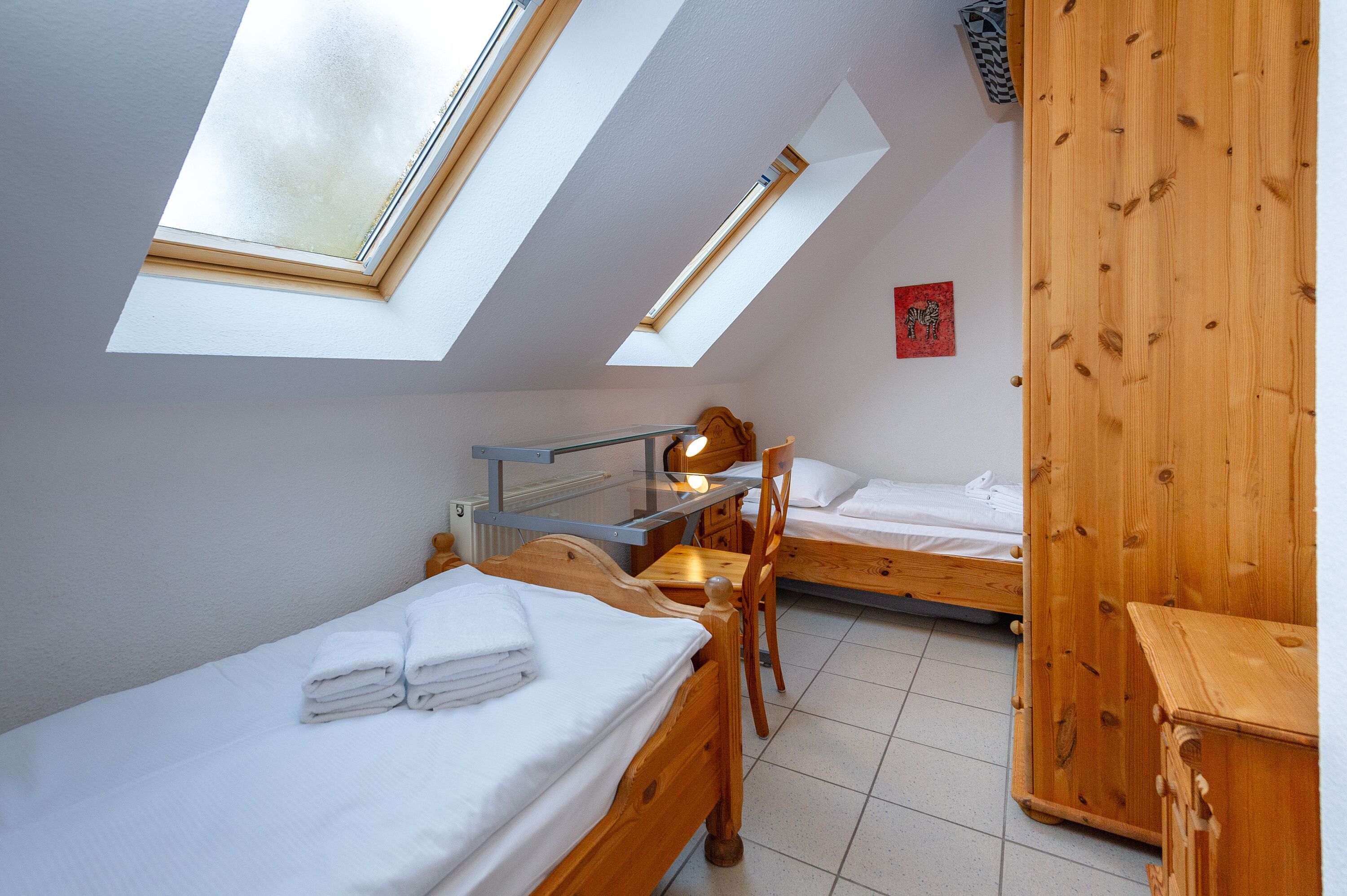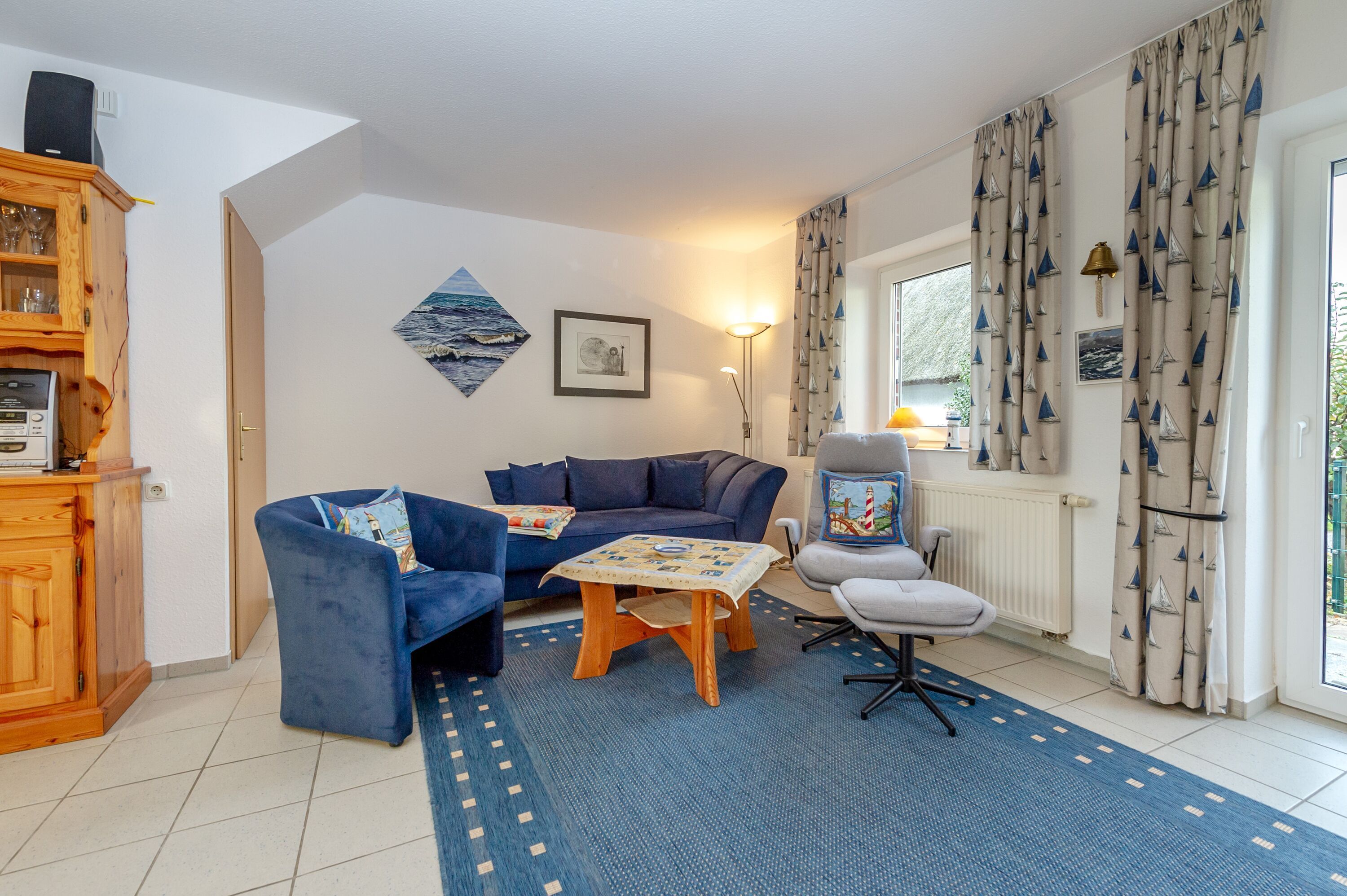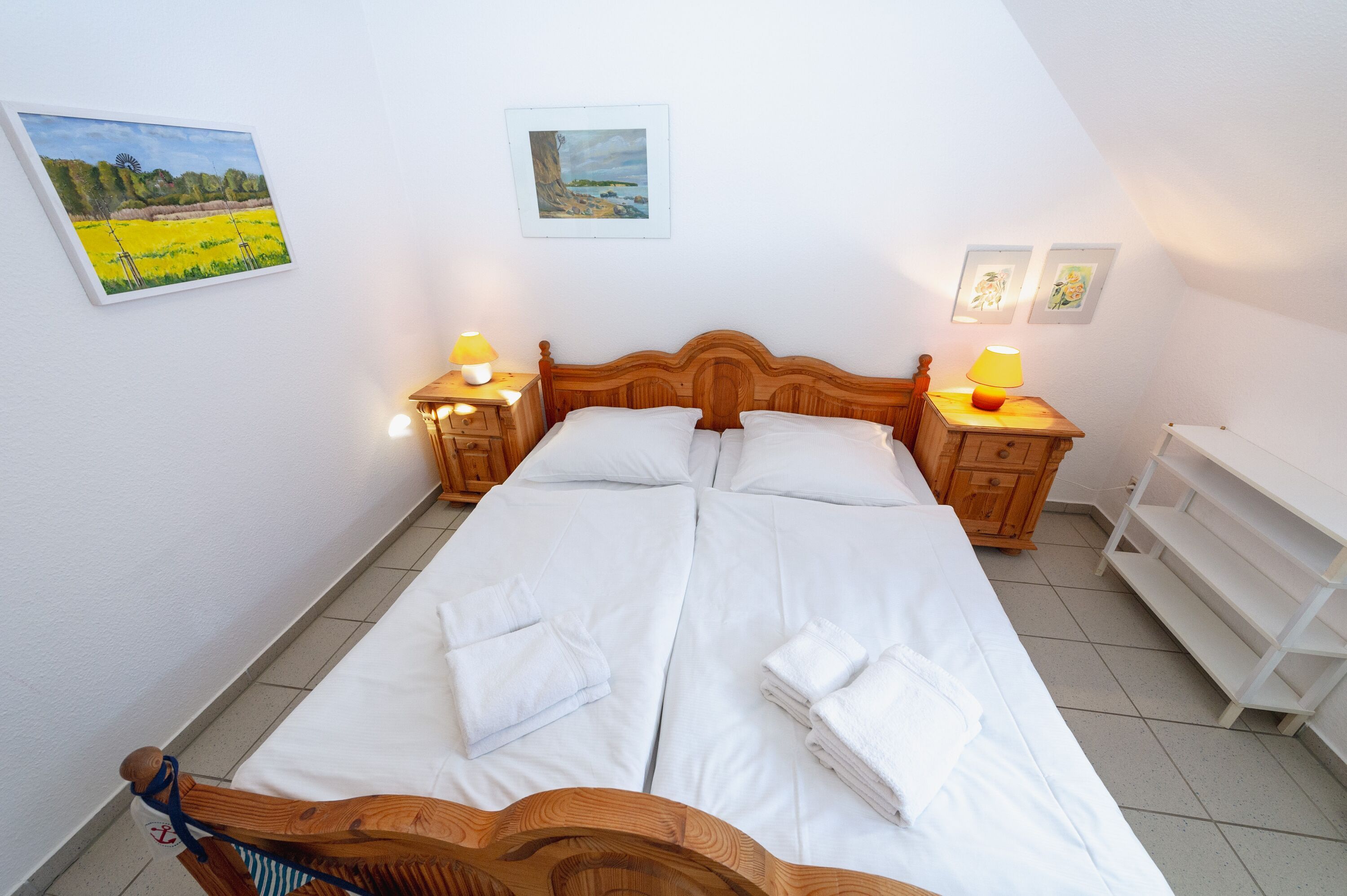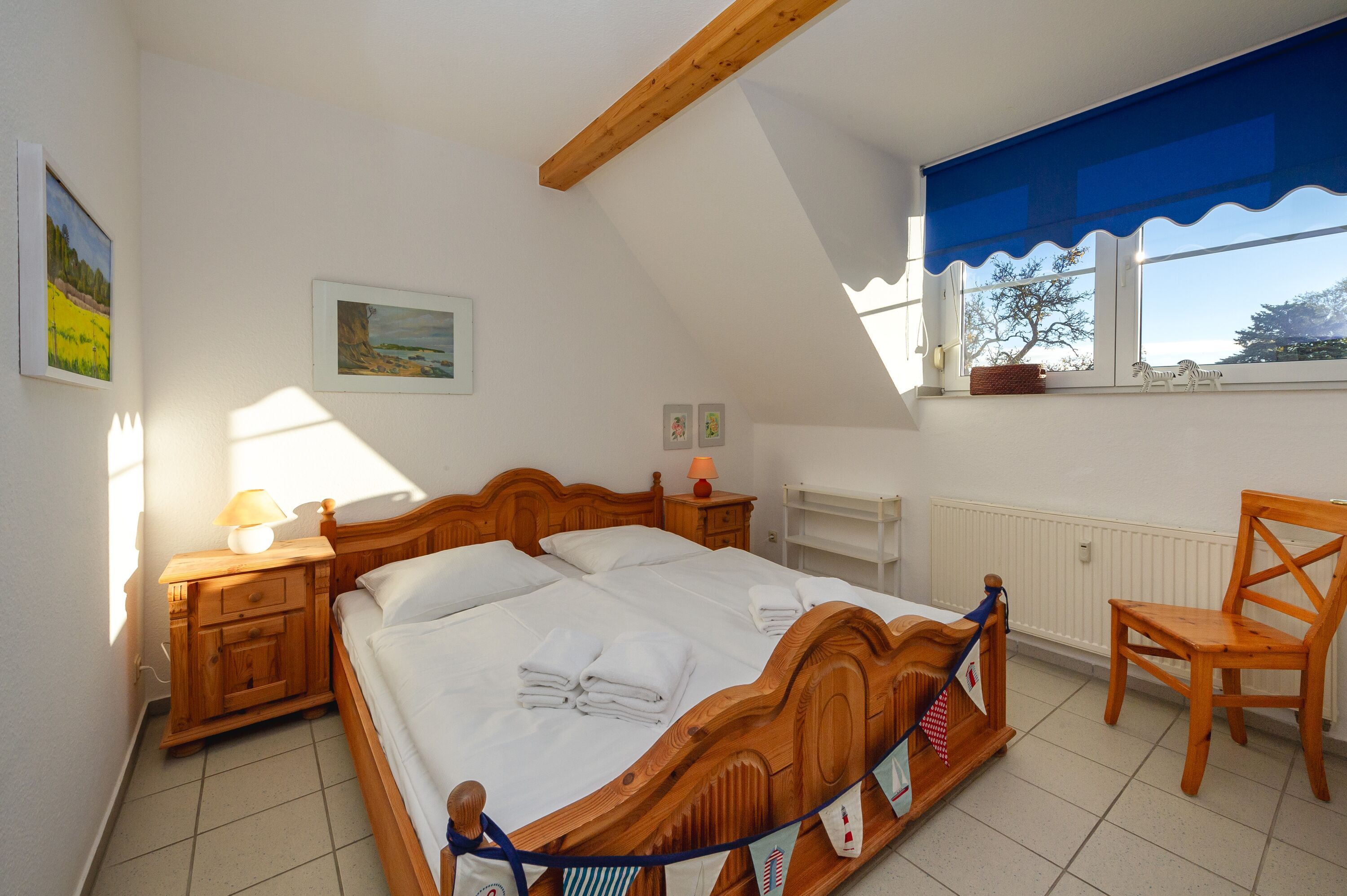 Im größeren der beiden Schlafzimmer finden Sie ein komfortables Doppelbett (1,80 x 2,00 m), das kleinere Schlafzimmer verfügt über zwei Einzelbetten. Die Fenster lassen sich natürlich verdunkeln, damit auch alle Langschläfer voll auf ihre Kosten kommen.