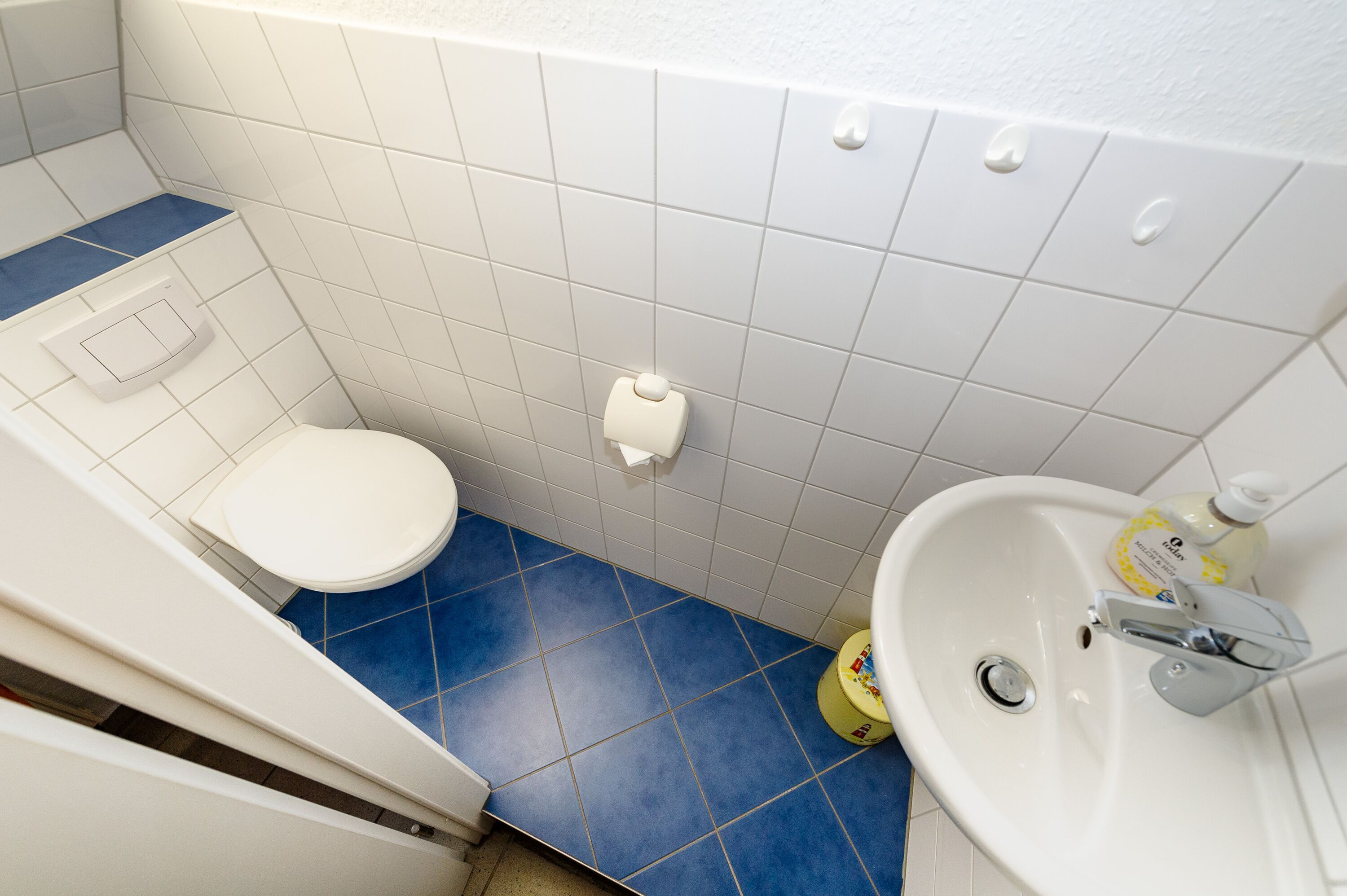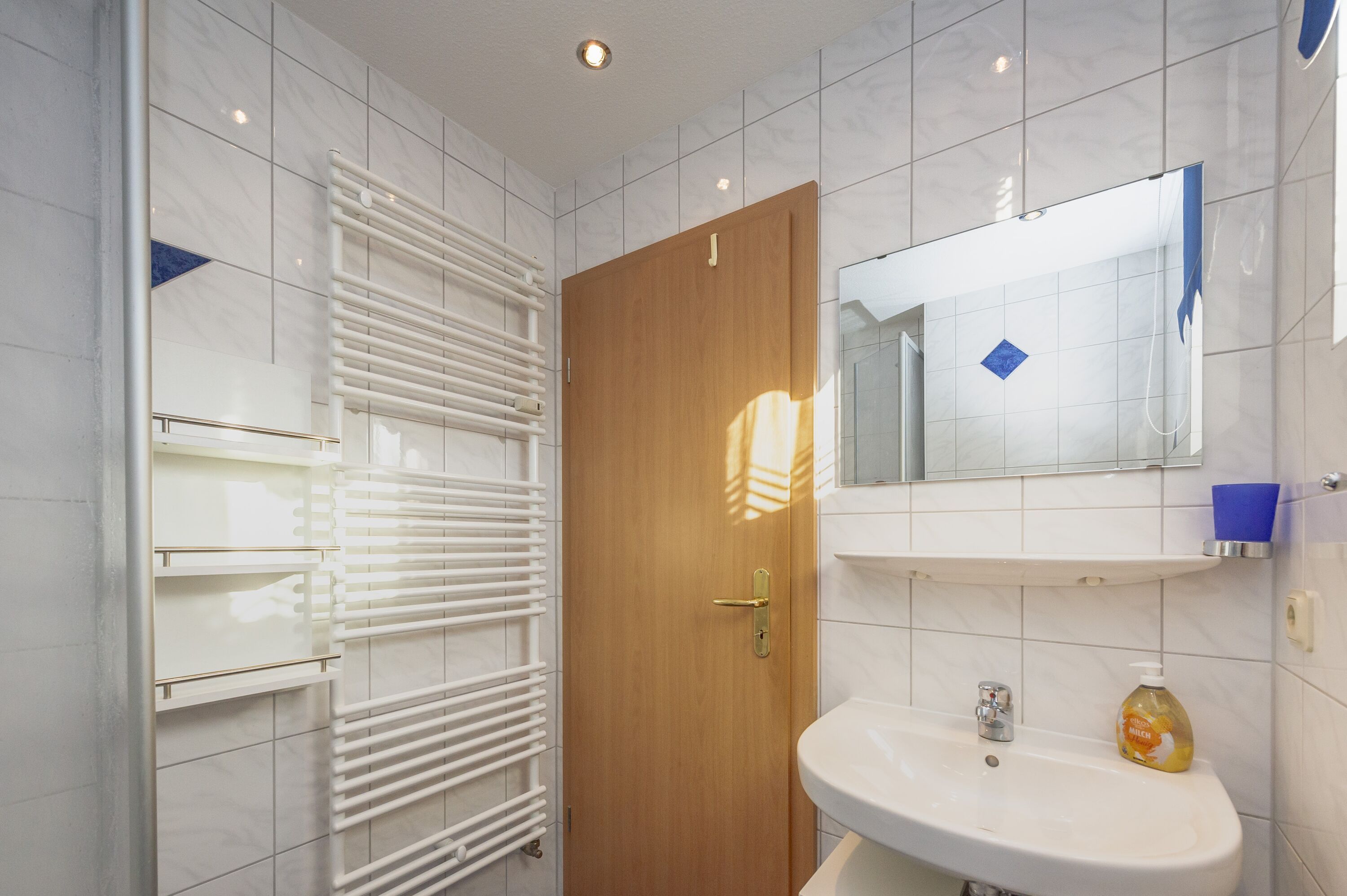 Das Badezimmer im Erdgeschoss ist mit Dusche/WC und einem beleuchteten Waschtisch mit Spiegel und Fön ausgestattet. Ein zusätzliches Waschbecken mit Spiegel bietet das Gäste-WC im Obergeschoss.