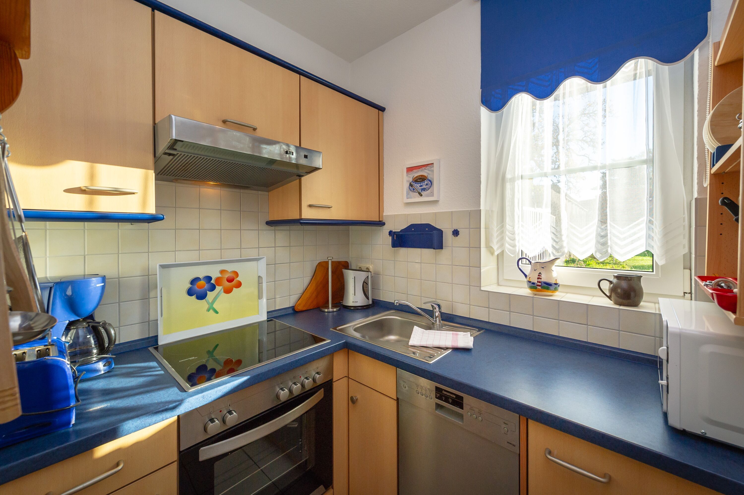 Die Küche ist u.a. mit einem 4-Zonen-Ceranherd inkl. Backofen und Abzugshaube, einer Mikrowelle, einem Kühlschrank, einer Spülmaschine sowie einer Filter-Kaffeemaschine, einem Wasserkocher und einem Toaster ausgestattet. Selbstverständlich sind auch das nötige Koch- und Essgeschirr in ausreichender Stückzahl sowie viele nützliche Kleinteile vorhanden.