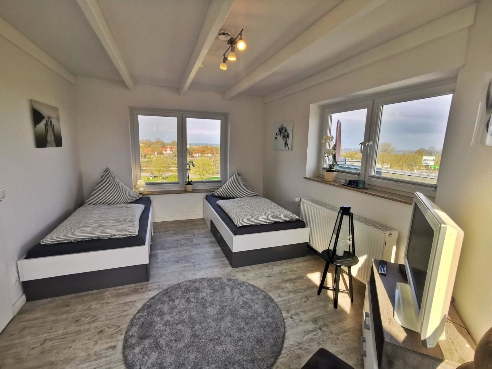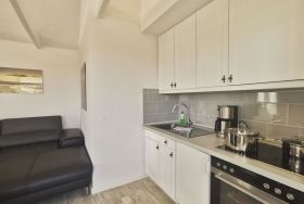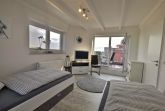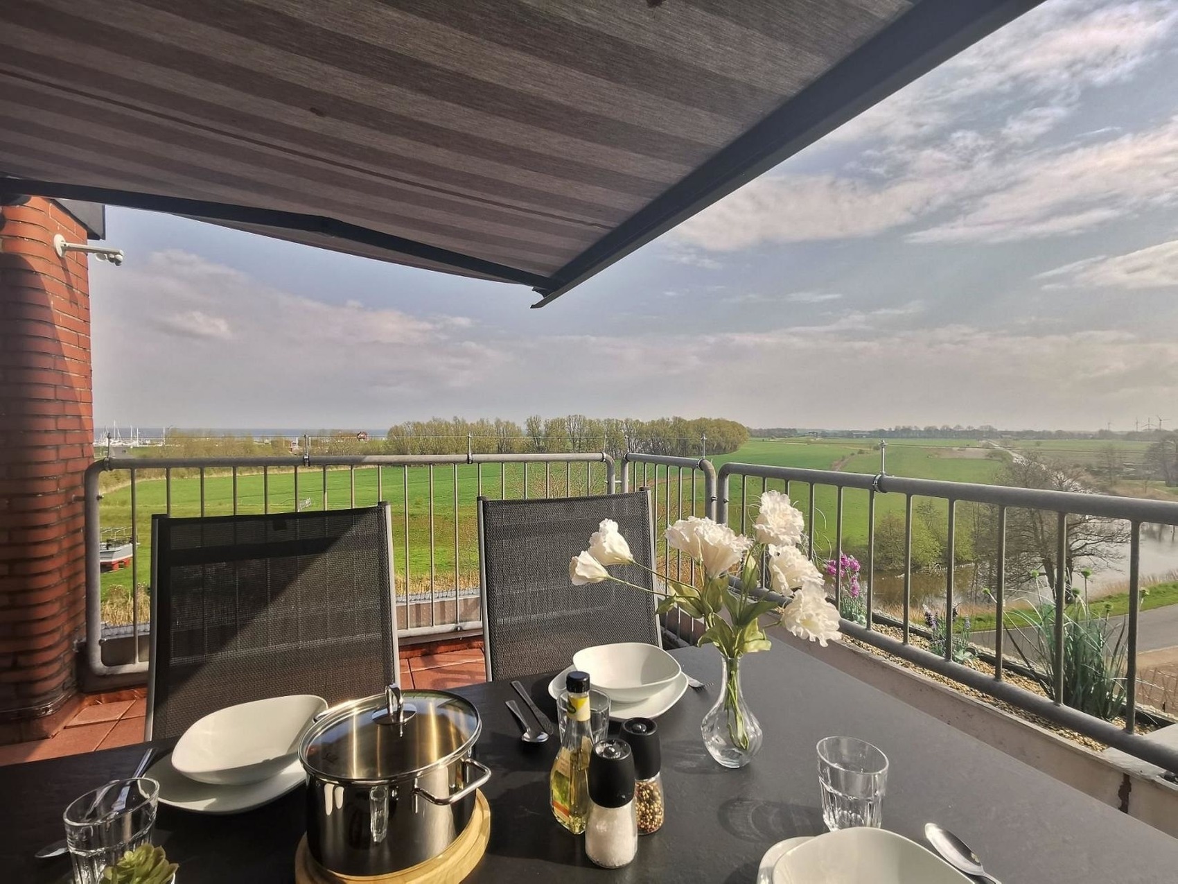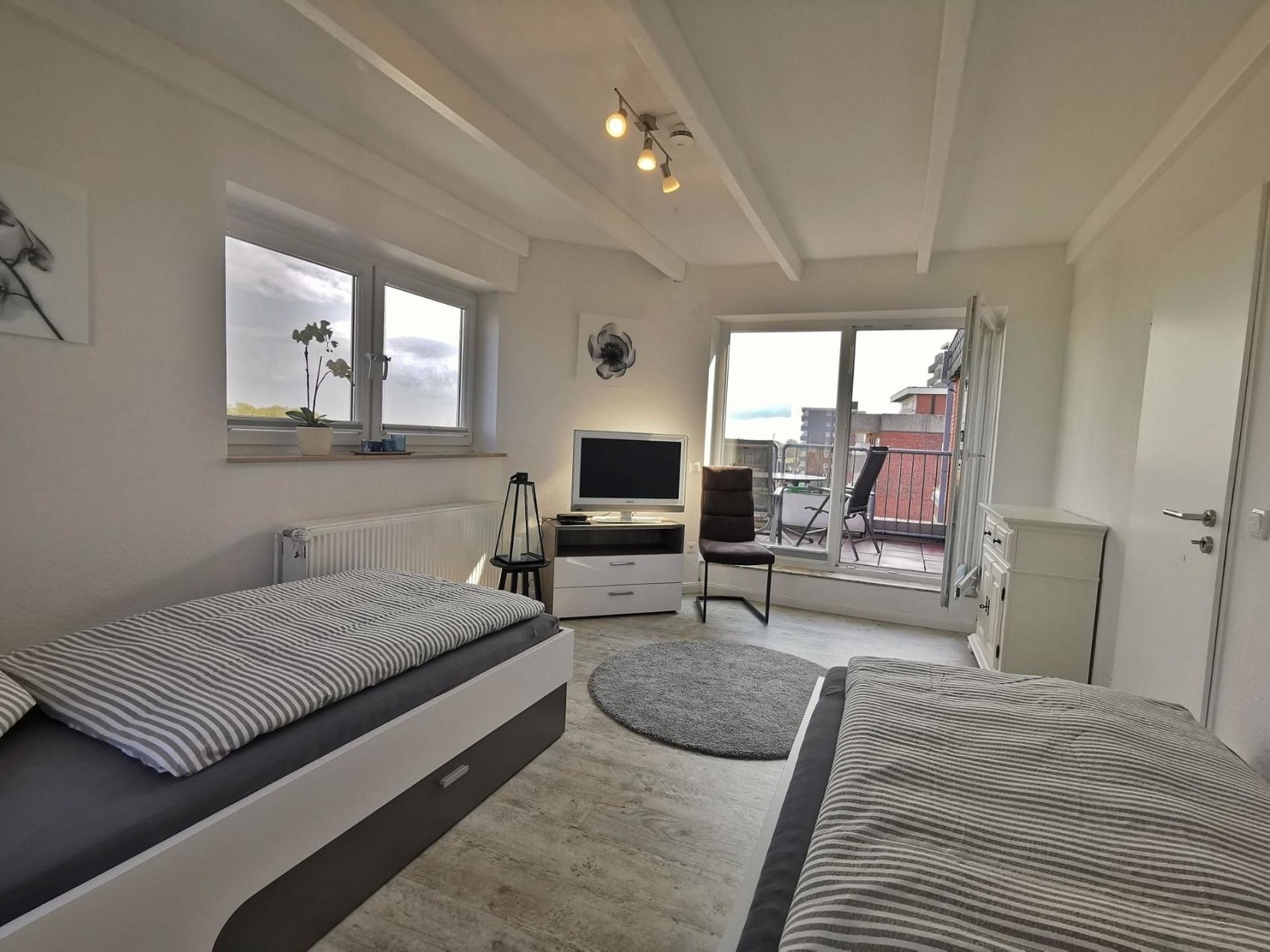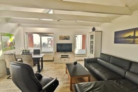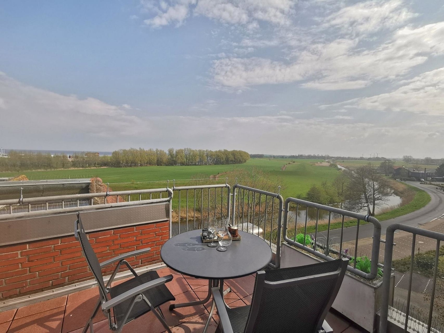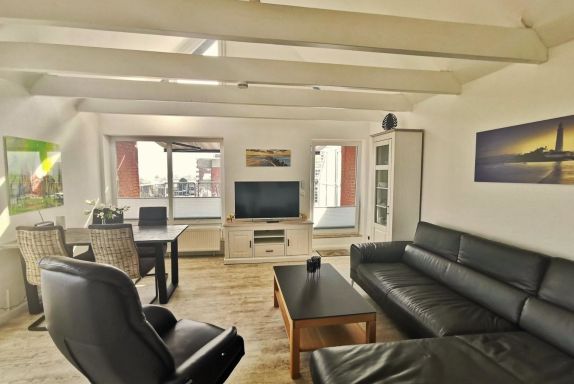 Über den Dächern von Horumersiel liegt diese, sehr geschmackvoll renovierte, Penthaus-Wohnung mit traumhaften Blick auf die Nordsee und die Inseln vor Horumersiel. Sie fahren mit dem Aufzug in die 5. Etage und helle, sonnendurchflutete Zimmer im Landhausstil bieten Ihnen auf 75 qm in diesem einmaligen Objekt Erholung mit besonderem Flair. 2 Dachterrassen laden zum Sonnenbaden oder gemütlichen Beisammensein ein. Die Wohnung besteht aus einem großen Doppelschlafzimmer mit Nachtschränken und Kleiderschrank, einem großem Schlafzimmer mit 2 Einzelbetten, Nachtschrank, Kommode und Flachbildschirm. Beide Schlafzimmer mit Fliegen- und Moskitogittern ausgestattet. Das neu renovierte Badezimmer besticht durch die große Designerdusche, modernes Waschbeckenmodul mit großem Spiegel, Einbauspots, Toilette und Handtuchheizkörper. Der gemütliche Wohnraum ist aufgeteilt in großzügigem Essplatz, Couchlandschaft in Leder sowie funktionaler Küchenzeile. Die komplette Wohnung ist mit modernem Vinylboden ausgestattet. Wlan ist selbstverständlich vorhanden. Waschmaschine und Trockner stehen im Haus zur Verfügung. Zur Wohnung gehört eine Doppelgarage mit elektrischem Sektionaltor, ein Fahrradabstellraum und ein Fahrstuhl.