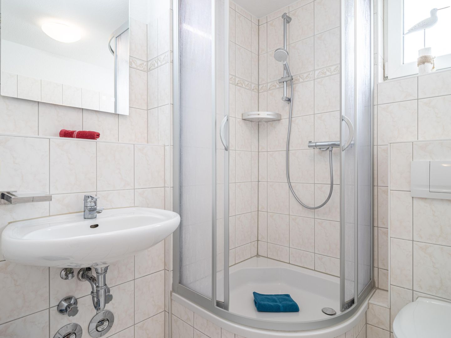 Ein Schlafzimmer mit Doppelbett und ein weiteres mit zwei Einzelbetten und das Badezimmer mit WC und Dusche befinden sich ebenfalls hier.