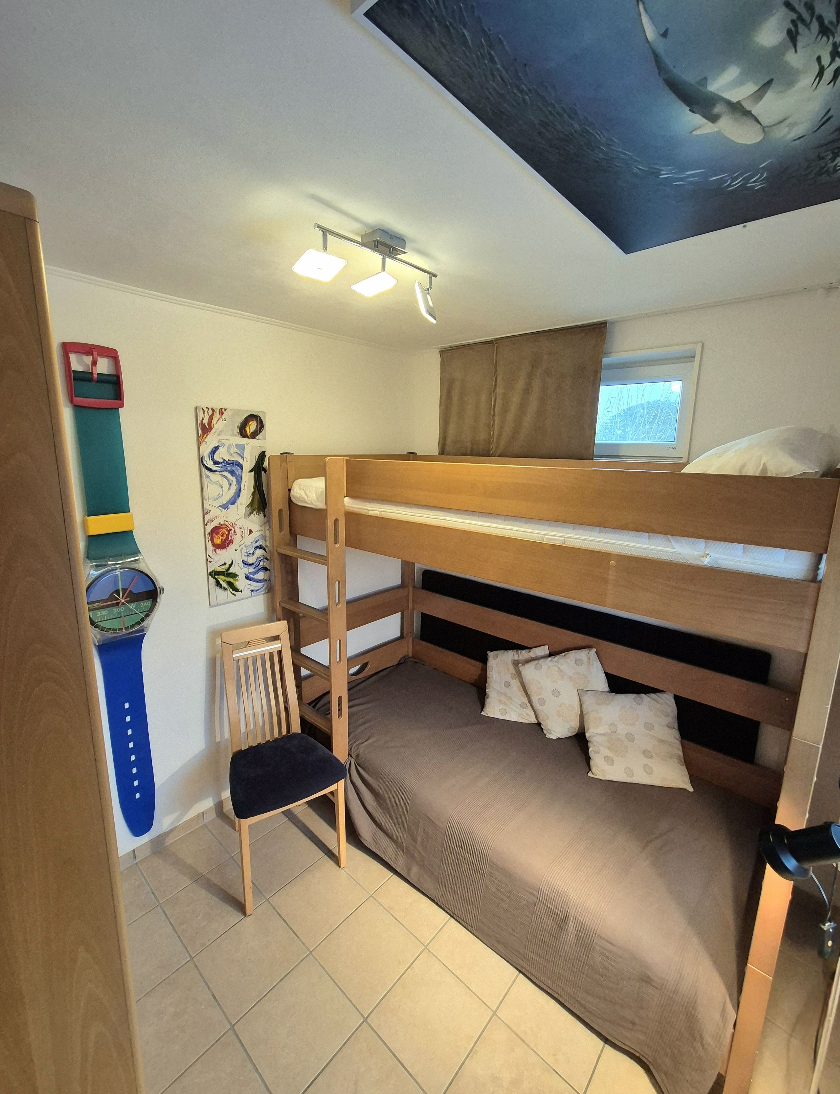 Der große Wohnraum, mit Blick aufs Meer und den schönen Garten, die Essdiele mit gemütlichem Ofenfeuer, die moderne Einbauküche mit allem Komfort, ein Schlafraum mit Doppelbett, ein Schlafraum mit Etagenbetten, im Wohnzimmer ein sehr gutes Schlafsofa, sowie ein modernes Duschbad runden die Ausstattung ab. Der Fußboden des Hauses hat einen Fliesenbelag.