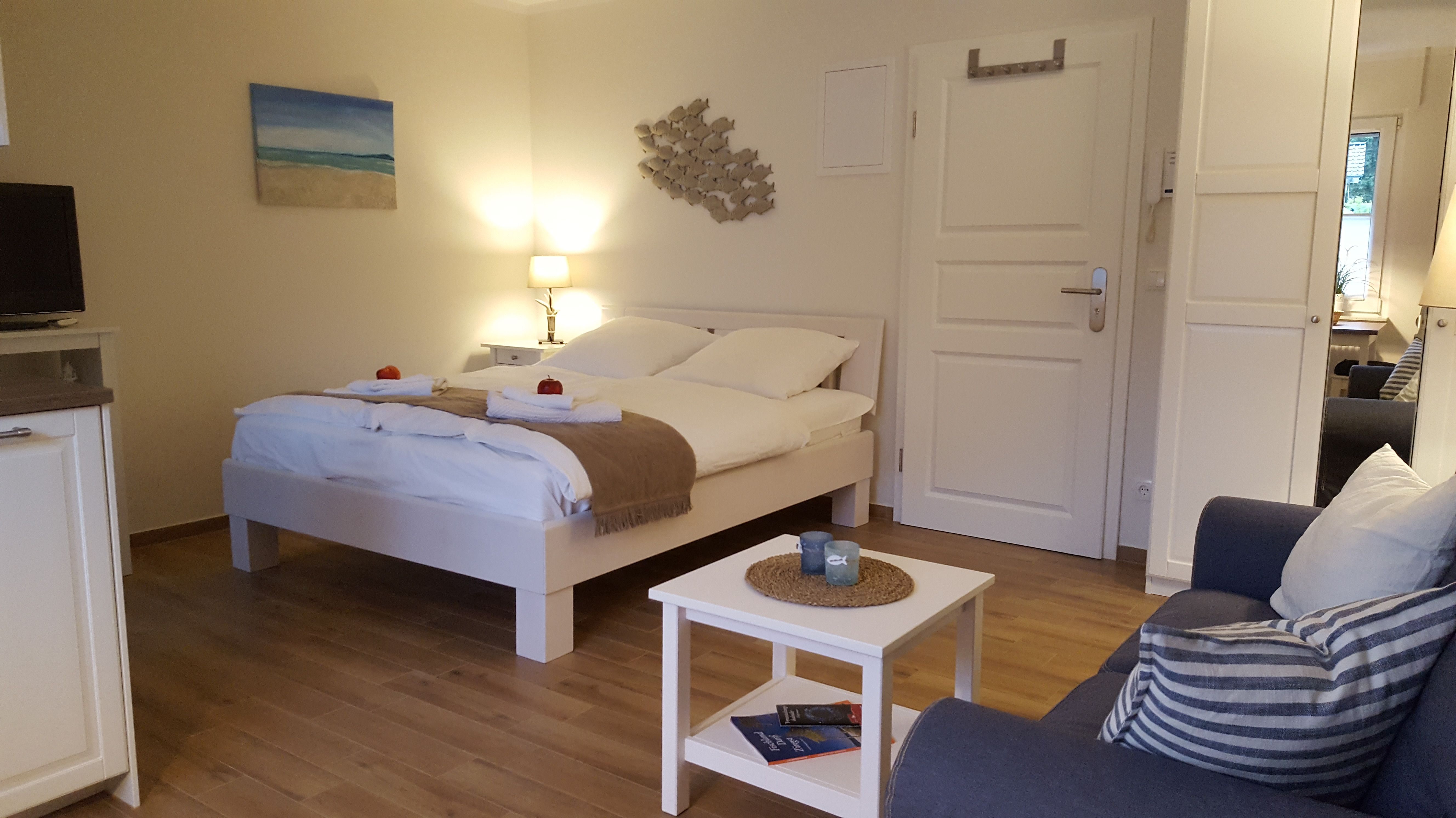 • kombiniertes Wohn- Schlafzimmer mit Doppelbett (1,60 x 2,00 m - durchgehende bett1-Matratze)