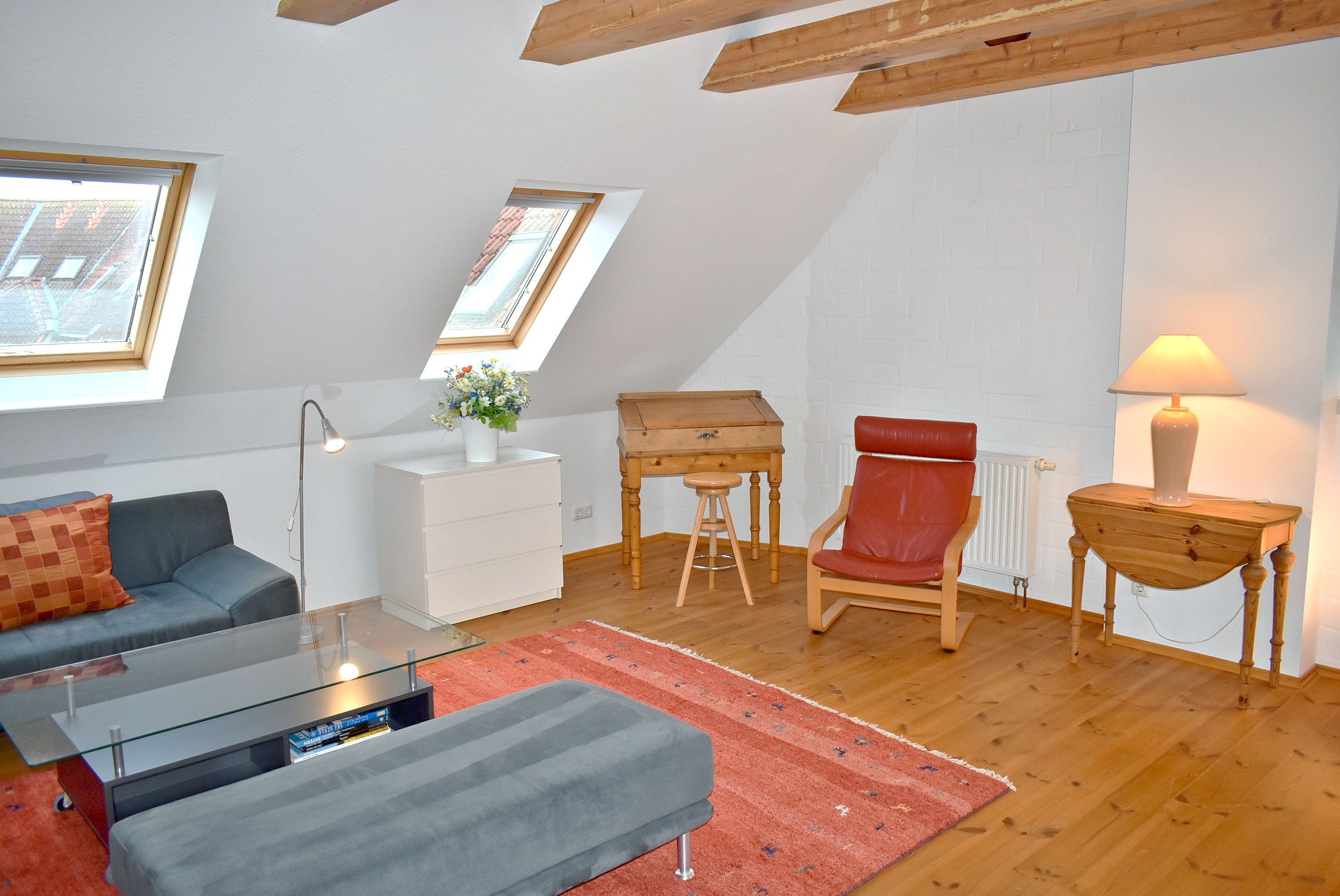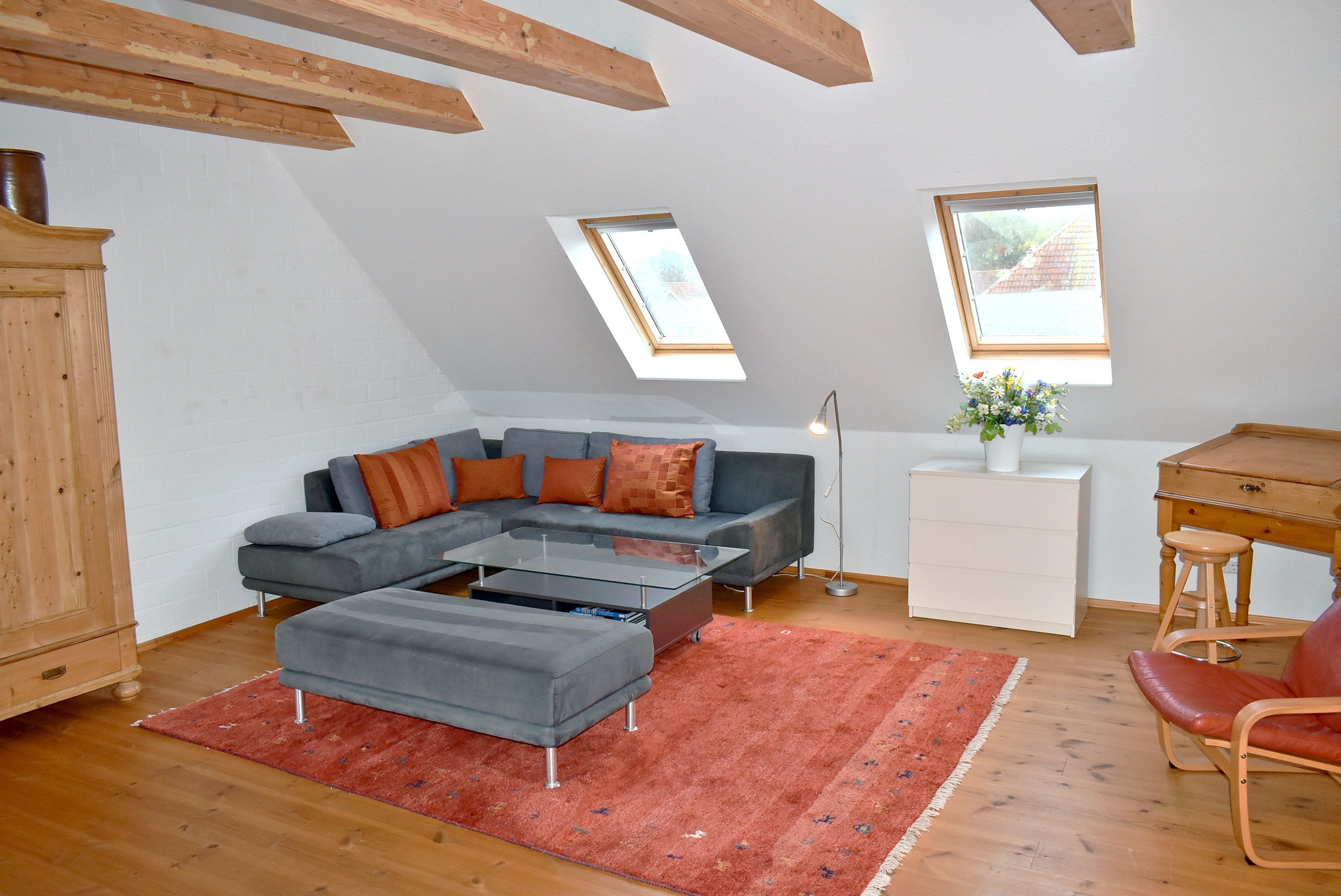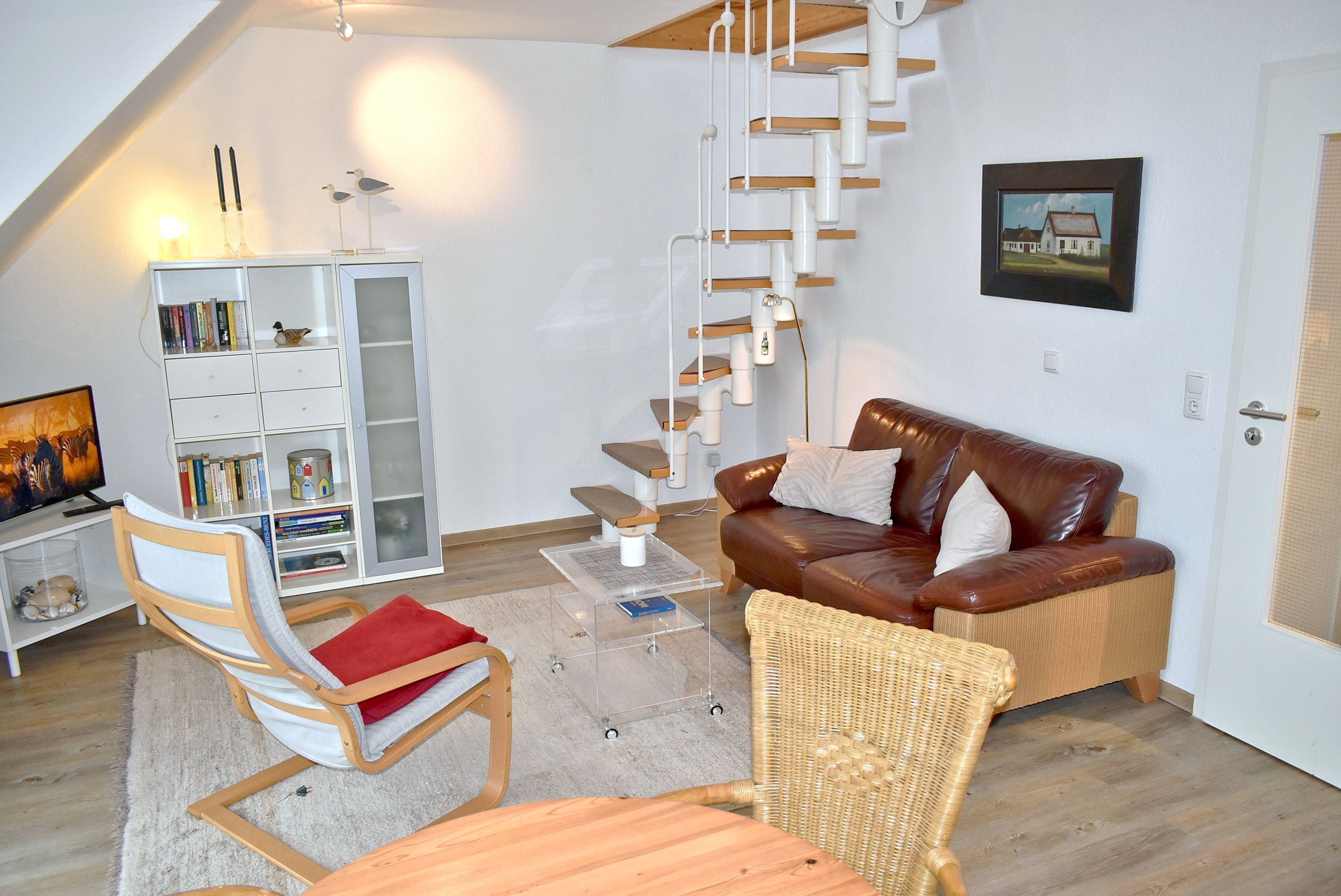 Wohnzimmer: 2 Tischlampen, 4 Plattenherd mit Ceranfeld und Backofen, 4 Stühle, Couch, Couchtisch, Dunstabzugshaube, Ecktisch, Esstisch, Flachbildschirm, Geschirr, Handmixer, Kabel-TV, Kaffeemaschine, Kochtöpfe, Küchenzeile, Kühlschrank, Mikrowelle, Regalschrankwand, Sessel, Spülmaschine, Stehlampe, Stereoanlage mit CD-Player, Toaster, Treppe nach oben, TV-Rolltisch, Wasserkocher