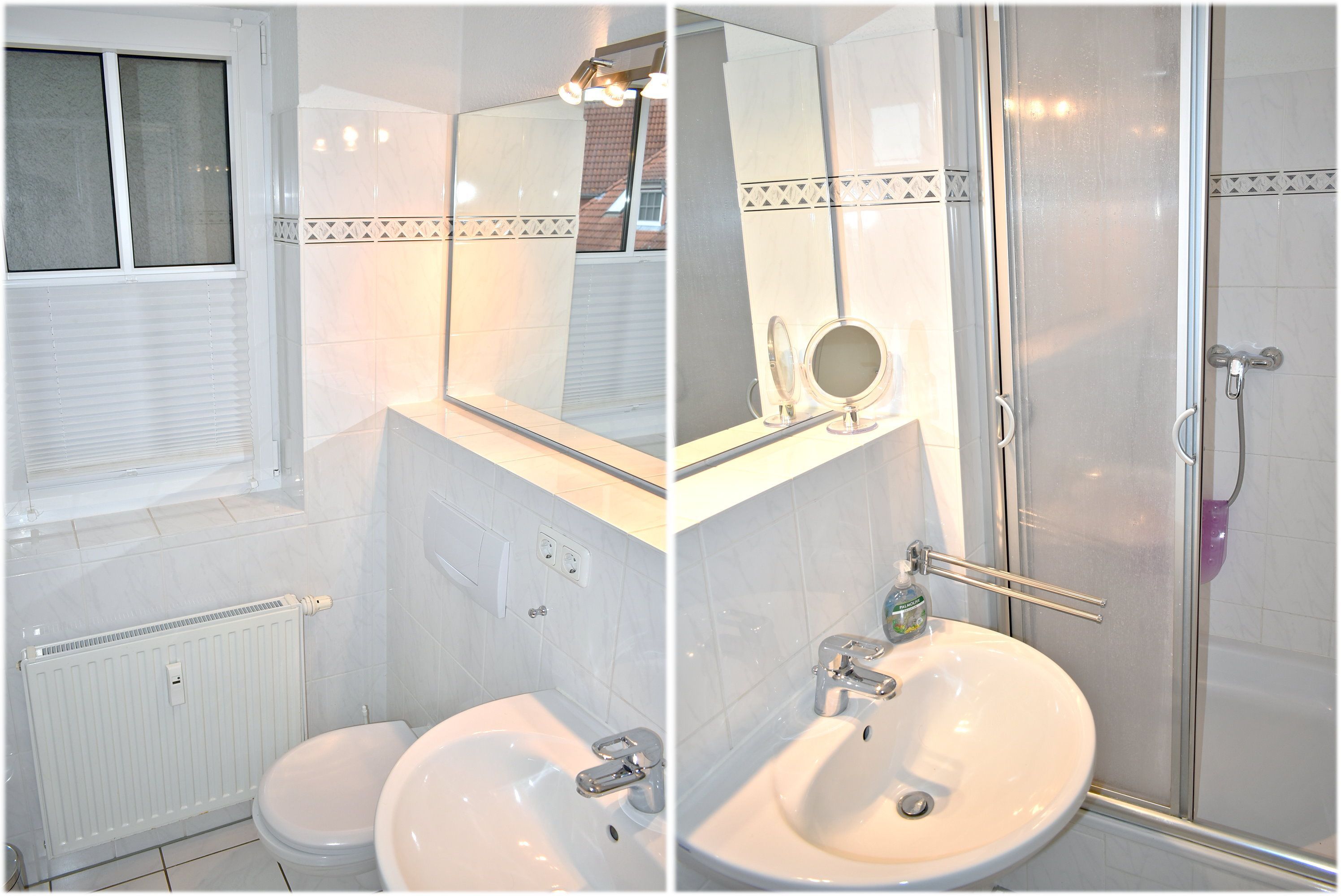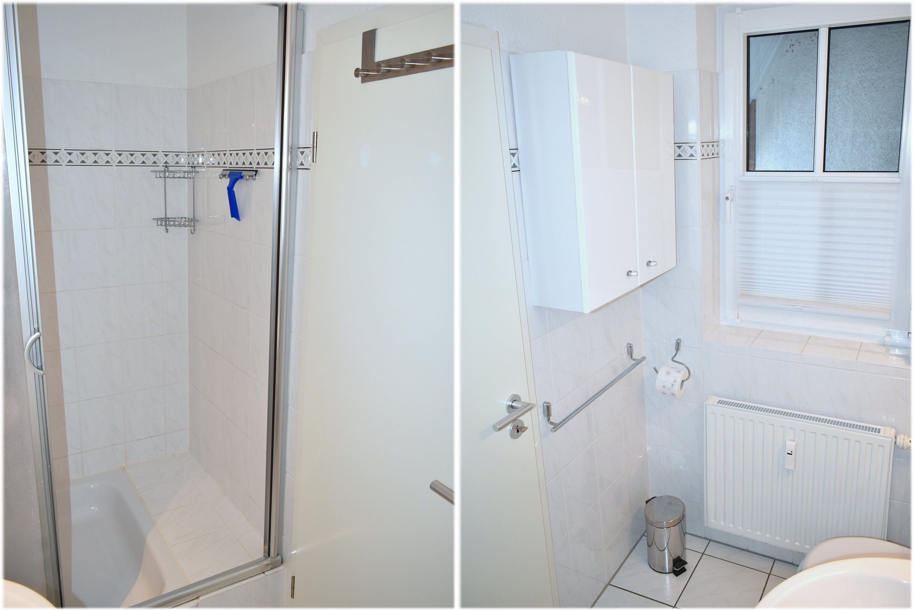 Bad 1: Dusche, Duschkabine, Schrank, Waschbecken, WC