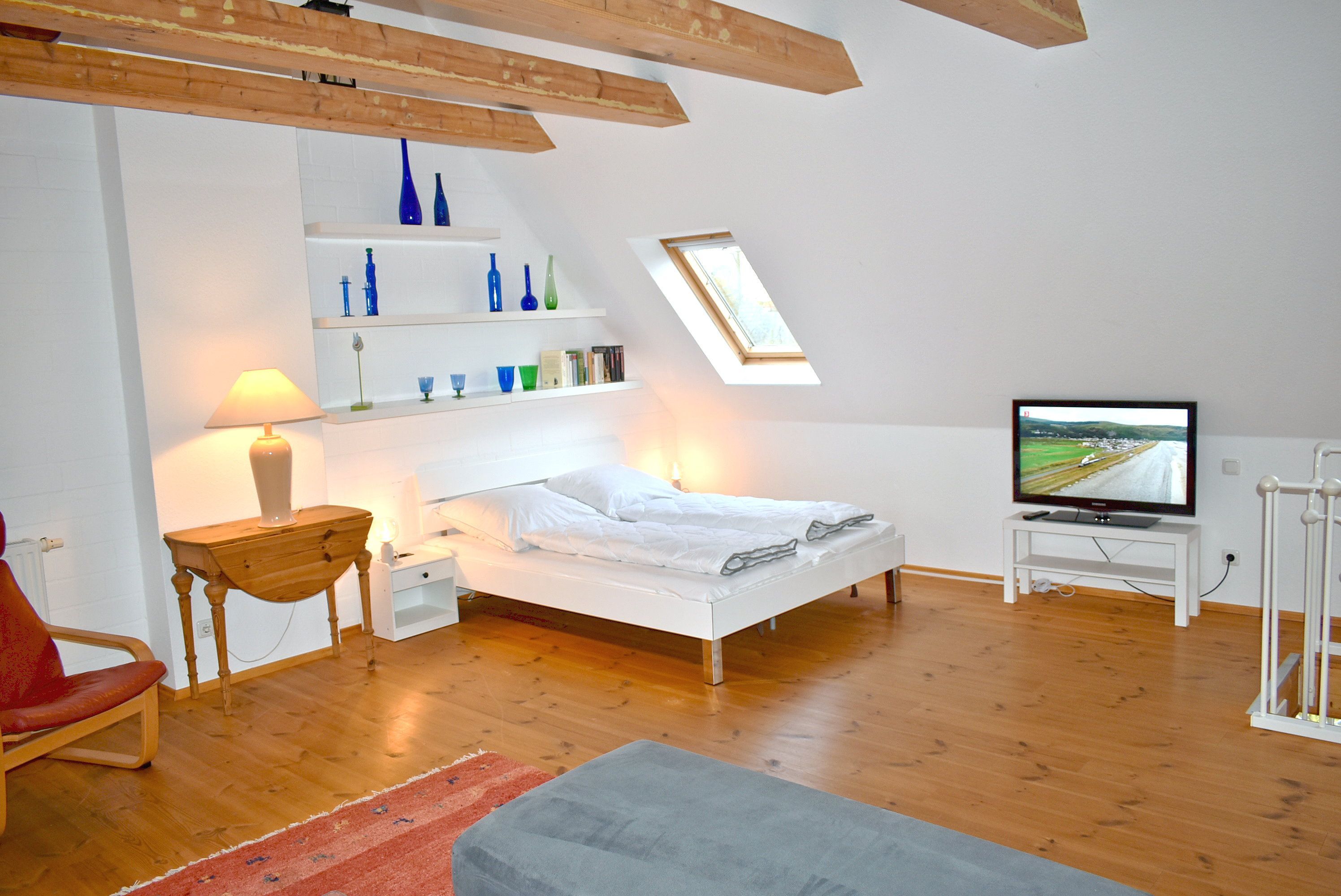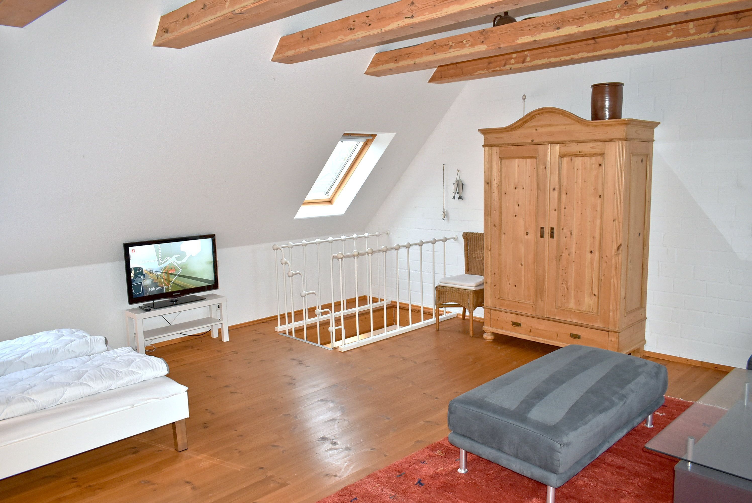 Schlafzimmer 2: 2 Stühle, Bodenlampe, Couchtisch, Doppelbett 2,00 x 1,60 m, DVD-Player, Eckcouch, Hocker, Kabel-TV, Kleiderschrank-Privat, Kommode, Nachttisch, Sekretär, Sessel, Sitzbank, Stehlampe, Stereoanlage mit CD-Player, Tisch, Tischlampe, Treppe nach unten, TV-Tisch