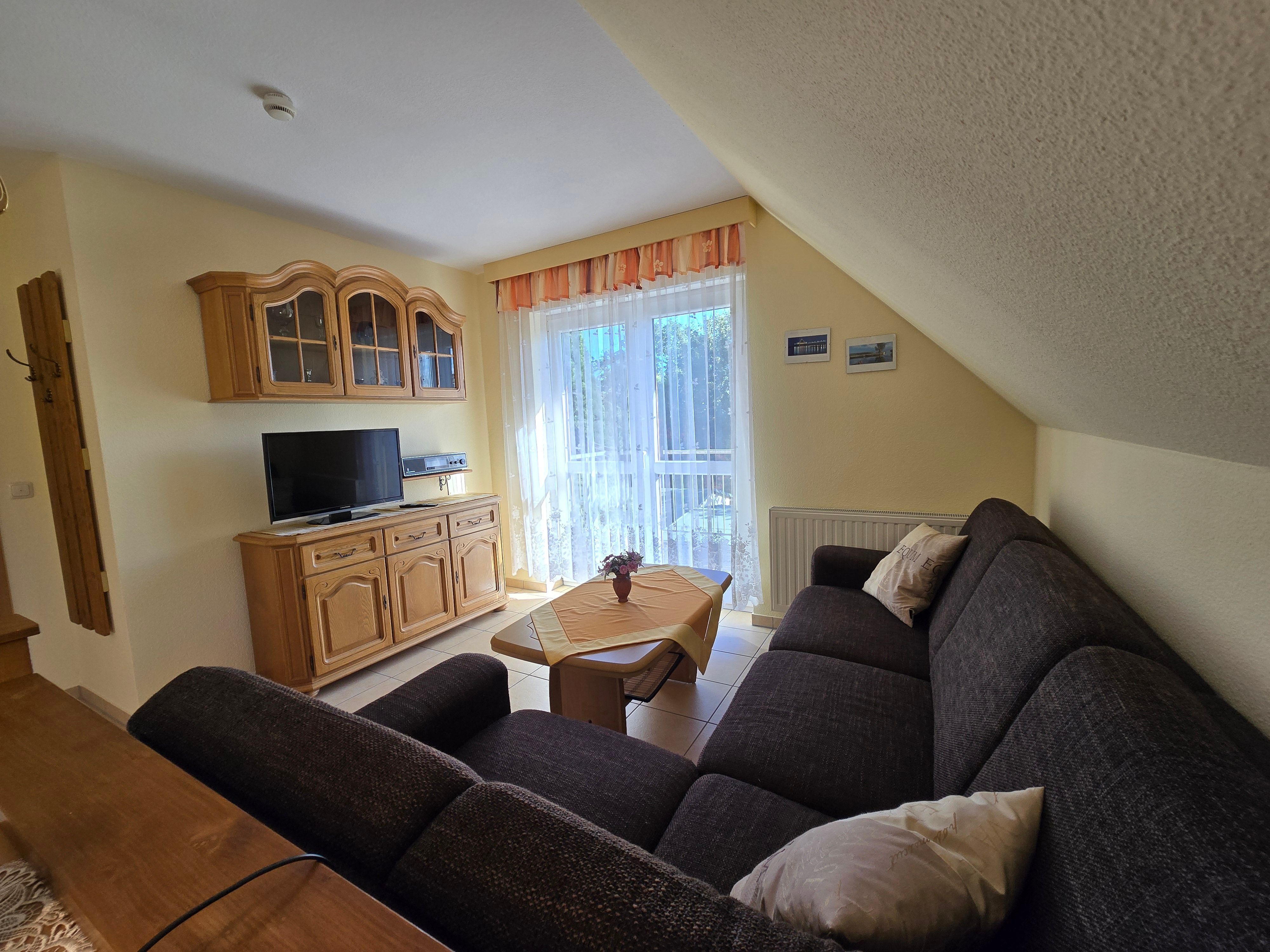Wohnfläche 44 m², Wohnraum mit Balkon, Küchenzeile, Sitzgarnitur, Farb-TV, Radio (SAT-Anlage) Couch mit Schlaffunktion-1 Pers., Schlafzimmer mit Doppelbett, Bad mit Dusche und WC, Stellplätze für PKW und Fahrräder auf dem Grundstück des Einfamilienhauses mit Ferienwohnungen.