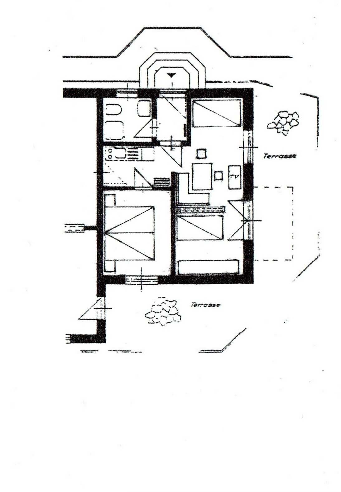 Terrasse, Küchenzeile, Sitzgarnitur, Farb-TV, Radio (SAT-Anlage), Schlafzimmer mit Ehebett.