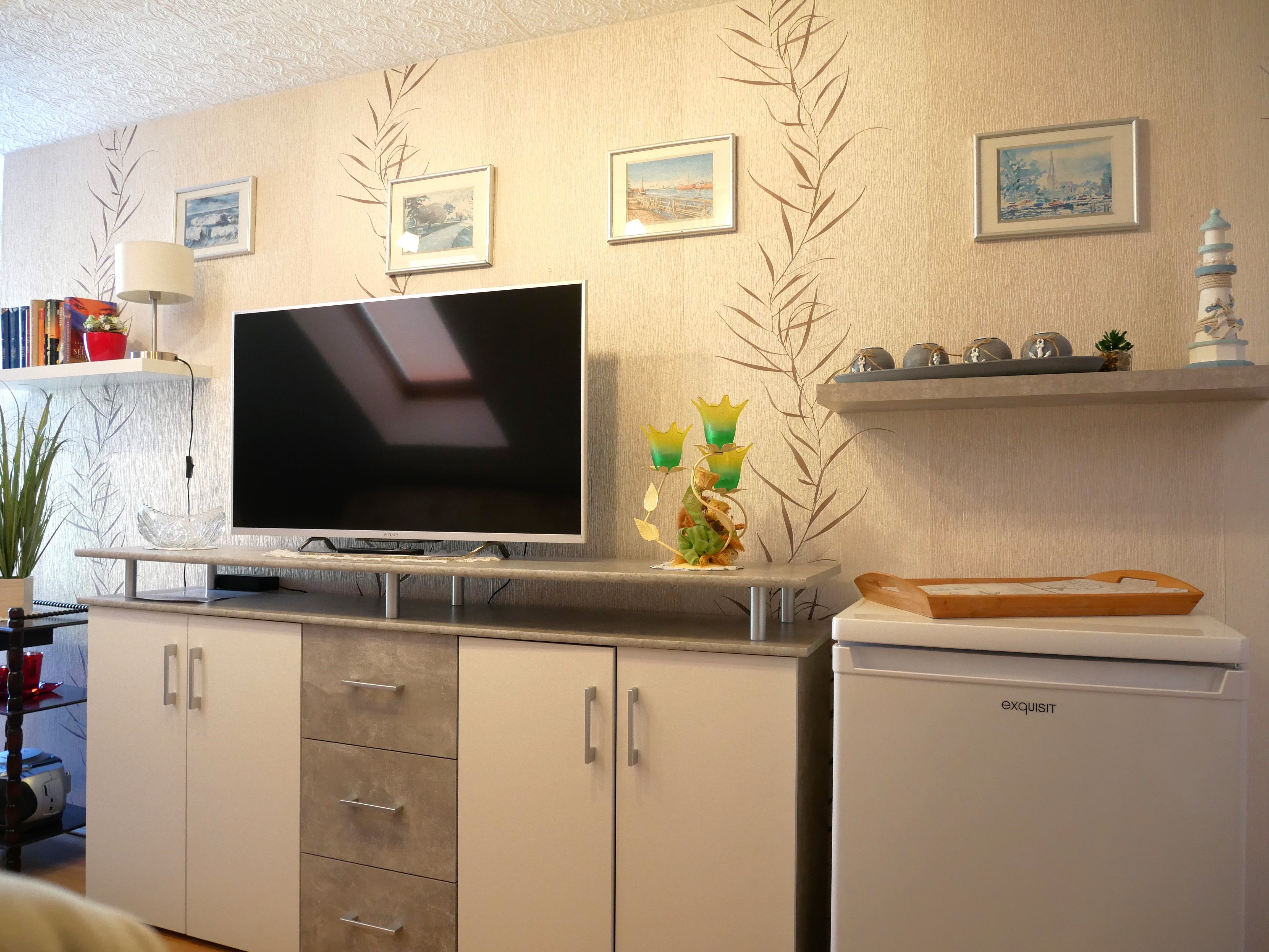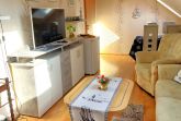 Die familienfreundliche Wohnung besteht aus einem Wohnzimmer mit ausklappbarer Eckcouch, Sessel, Couchtisch, Flachbild-TV, Radio, einer Essecke mit Tisch und Stühlen sowie ein Kühlschrank mit Gefrierfach.