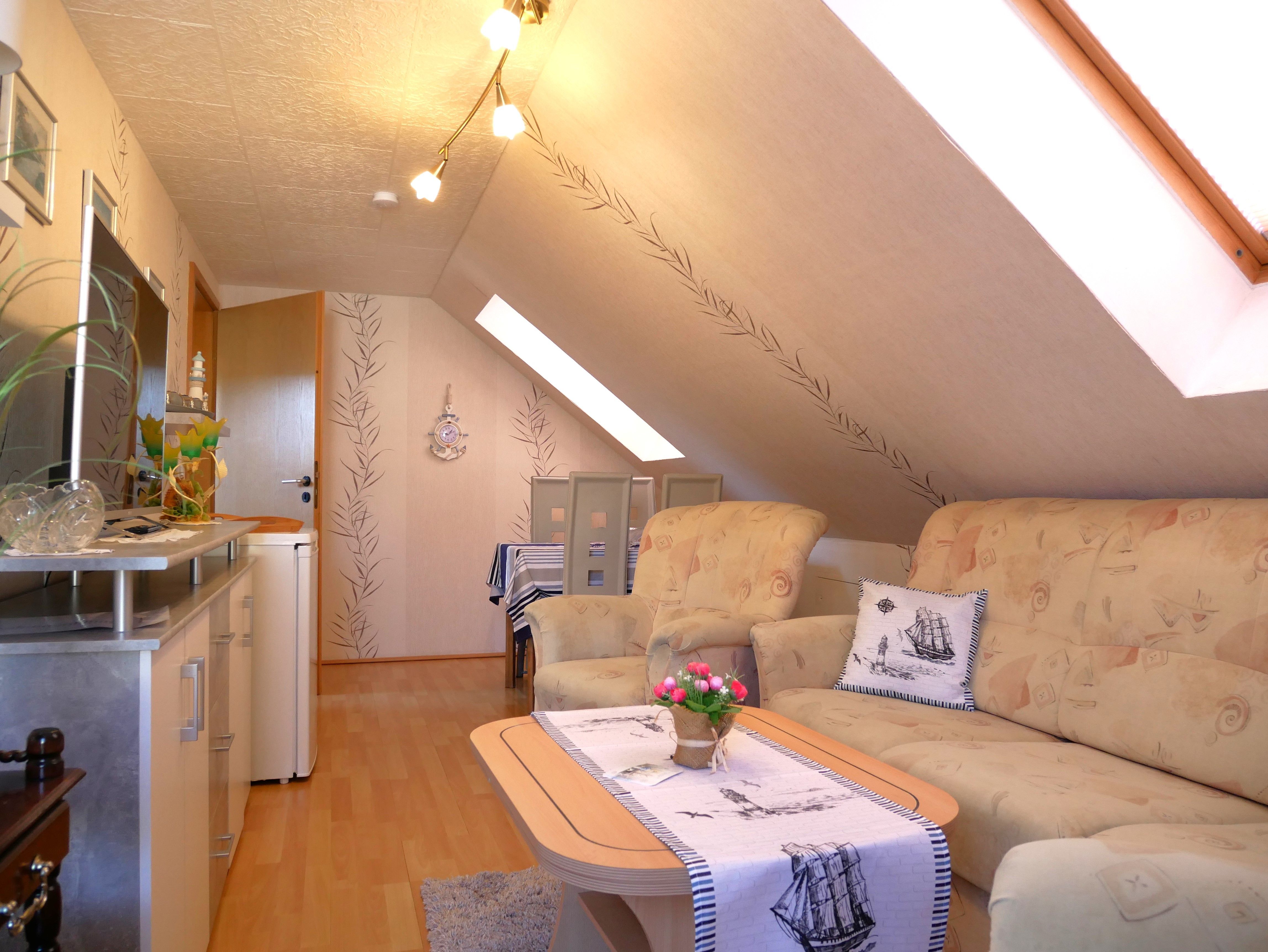 Die 56 qm große 2 Raum Ferienwohnung befindet sich im 1. Obergeschoß mit Dachschrägen. Die Treppe kann durch einen Treppenschutzgitter für Kinder sicher gemacht werden.