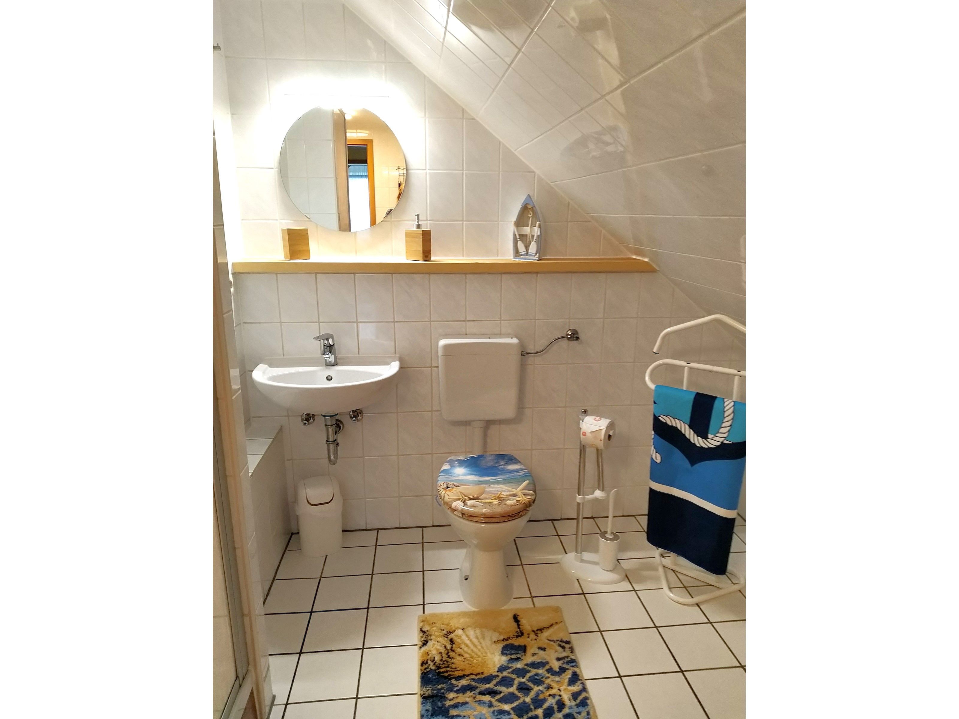 Im großen Schlafzimmer steht Ihnen ein Doppelbett, 2 Einzelbetten, ein Kleiderschrank sowie eine Kommode zur Verfügung. Das Badezimmer verfügt über eine Dusche mit WC (kein Fenster). Ein Haarföhn kann bei den Vermietern ausgeliehen werden. Die Wohnung ist in allen Räumen (außer Bad) mit Laminatfußboden und Teppichen ausgestattet. Die Wohnung ist für Kleinkinder unter 5 Jahren nicht geeignet.