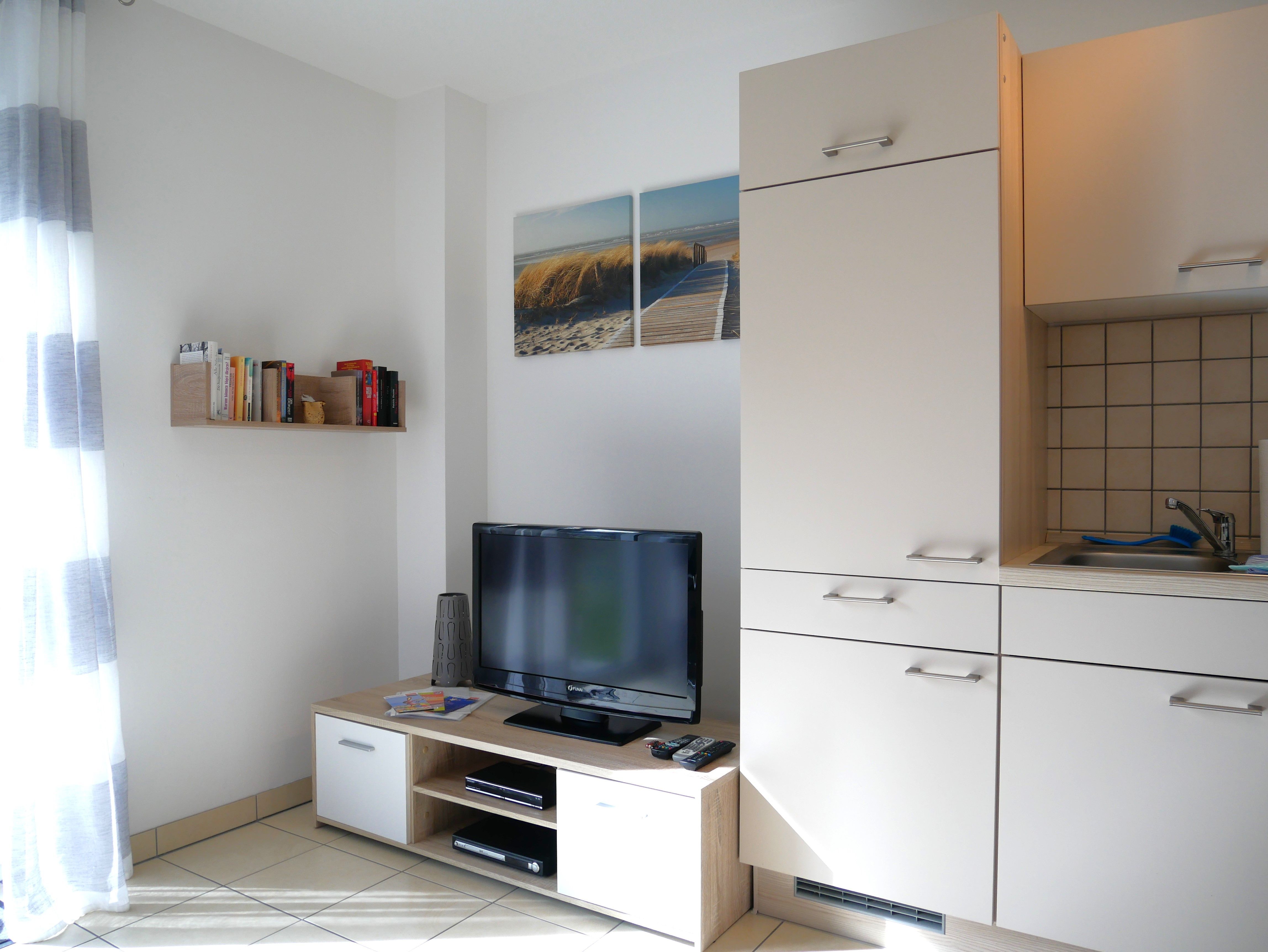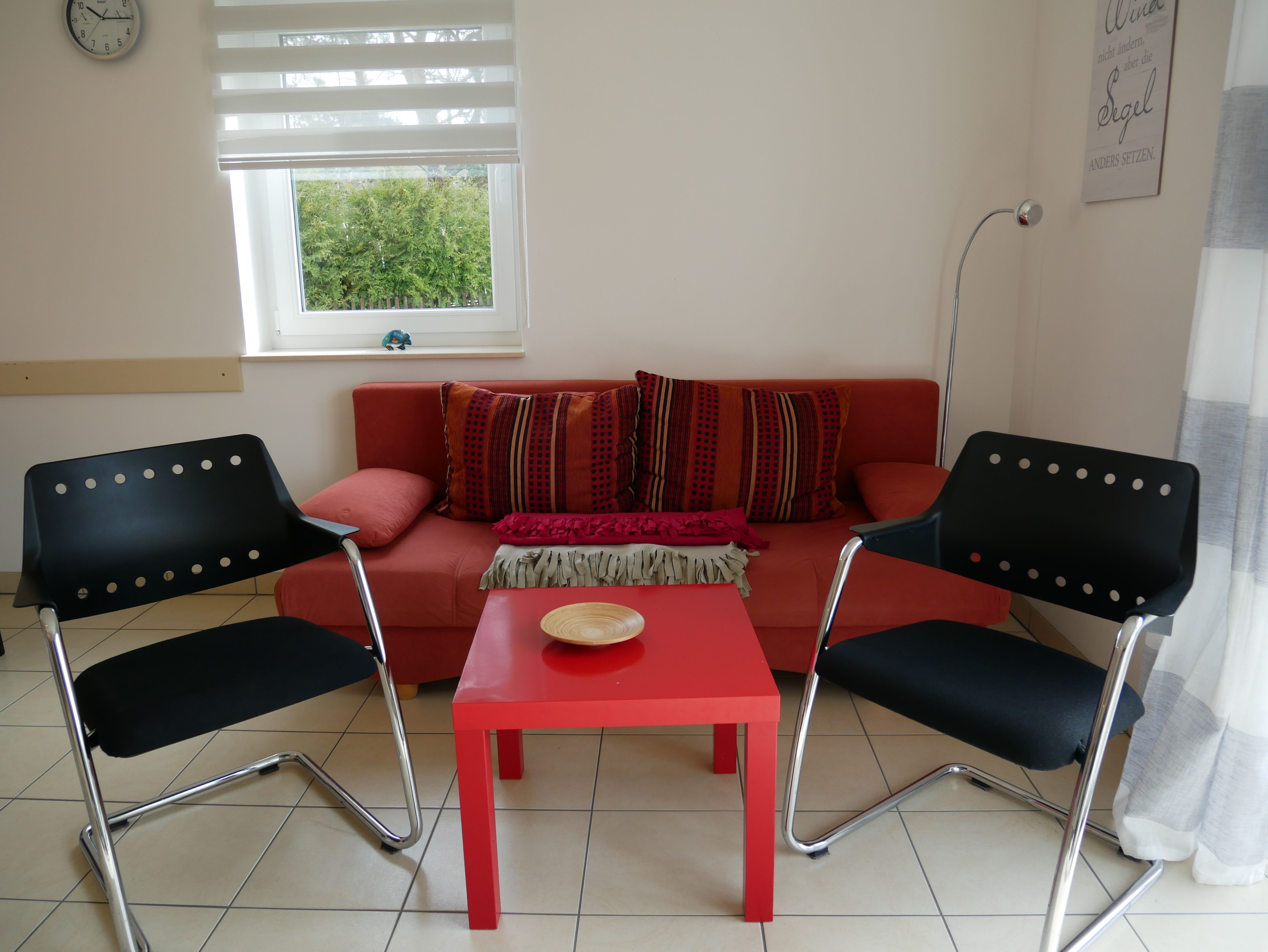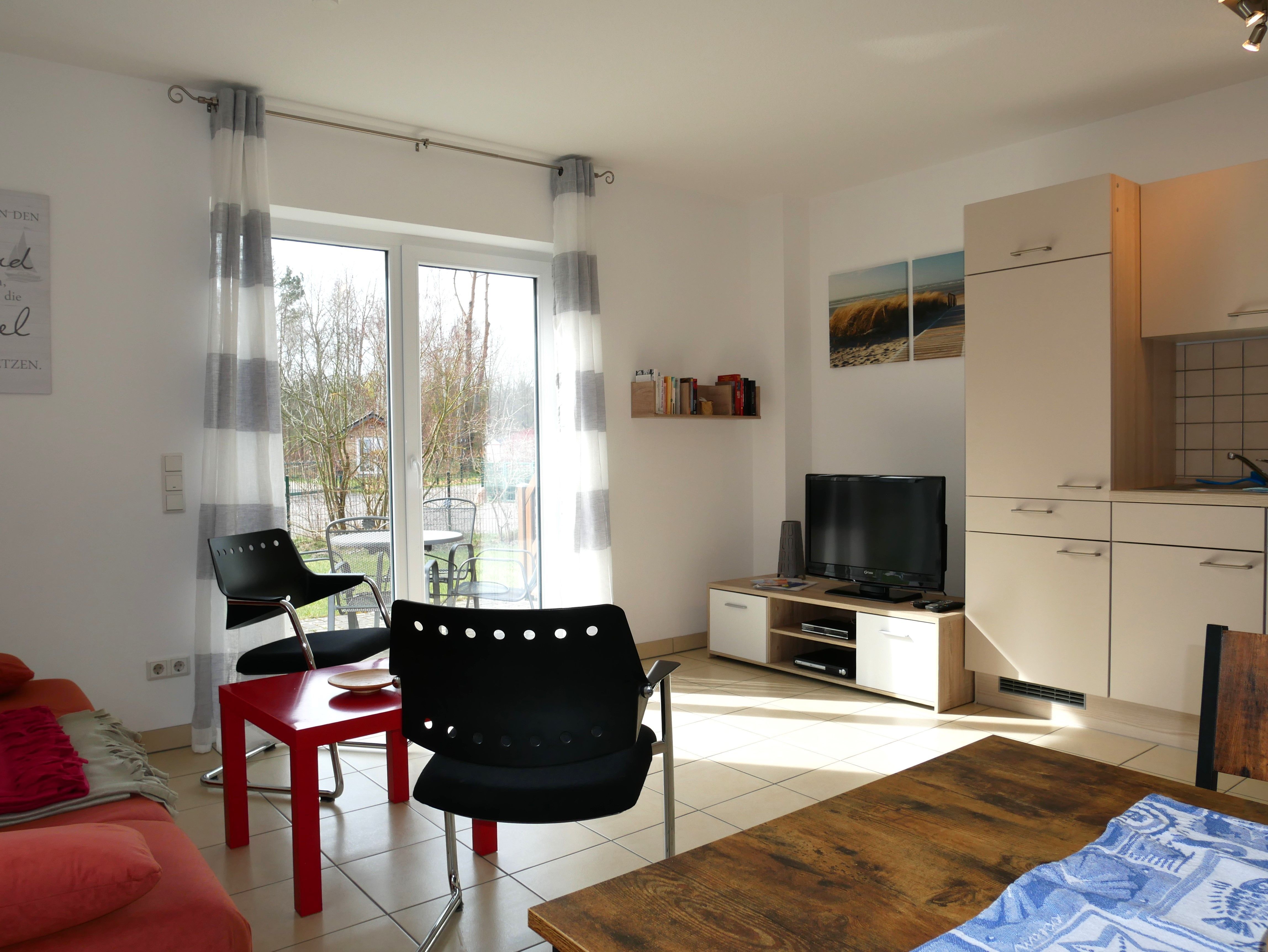 Der Wohnbereich für 4 Personen ist mit SAT-TV und DVD-Player ausgestattet.