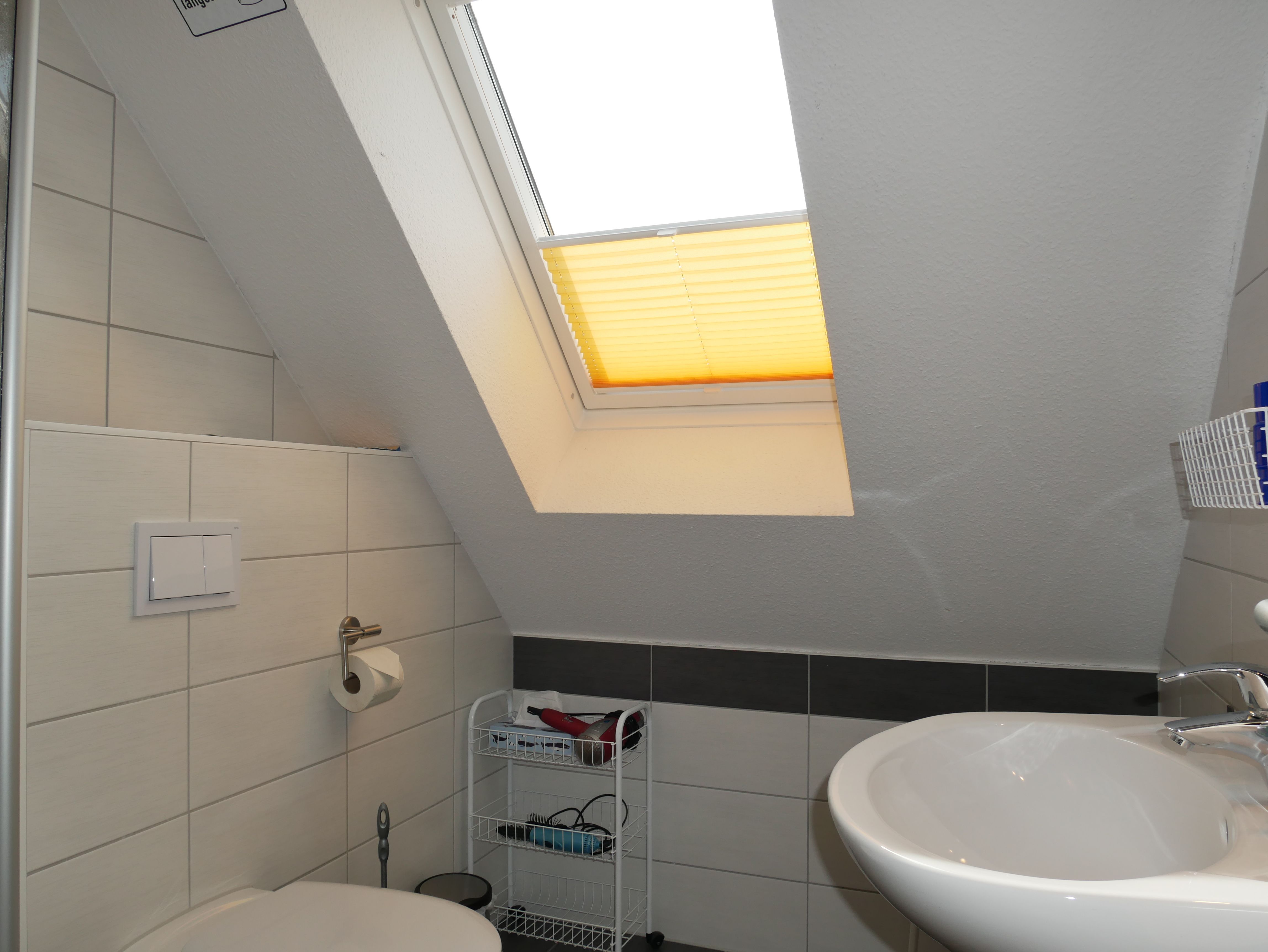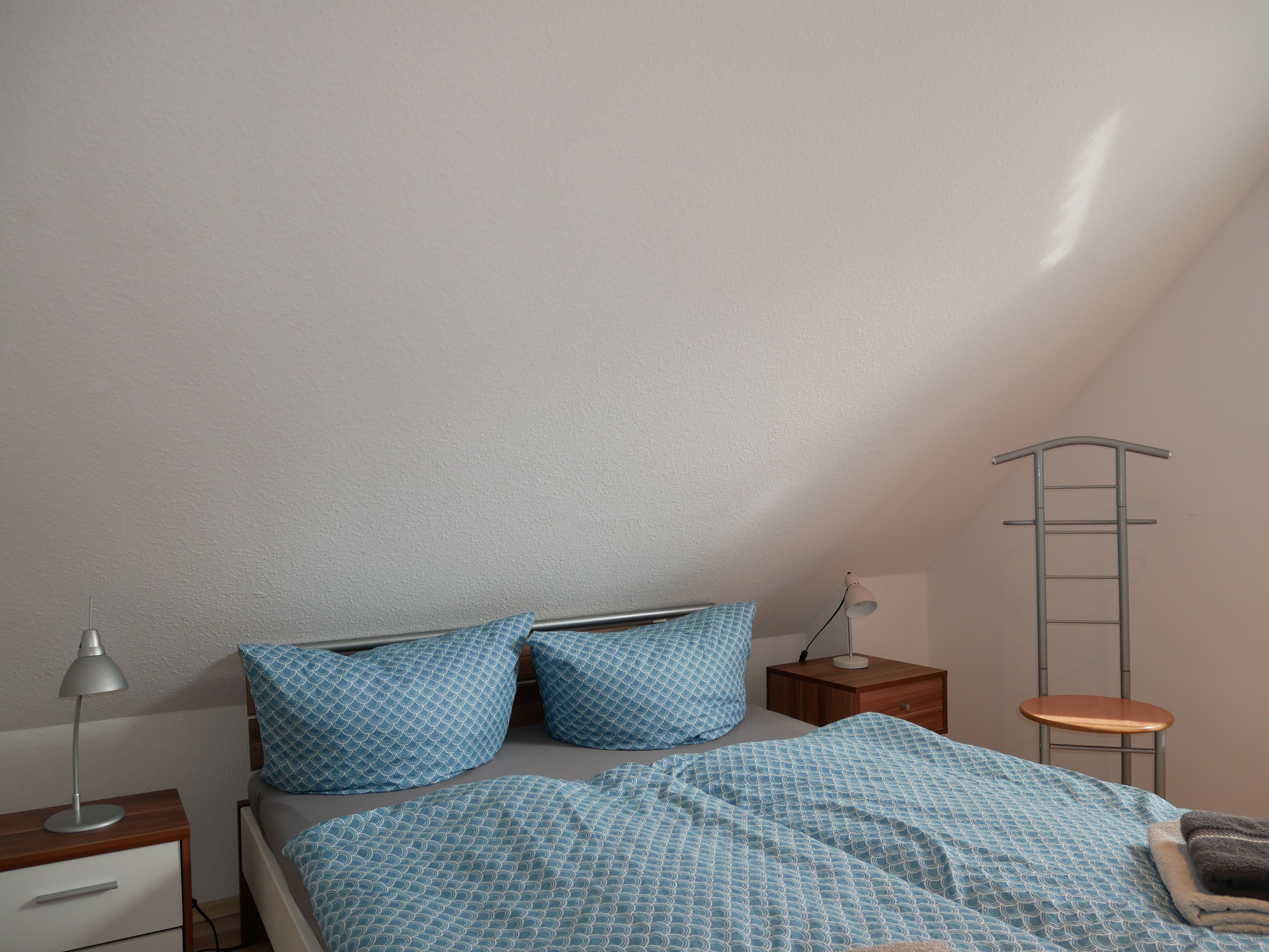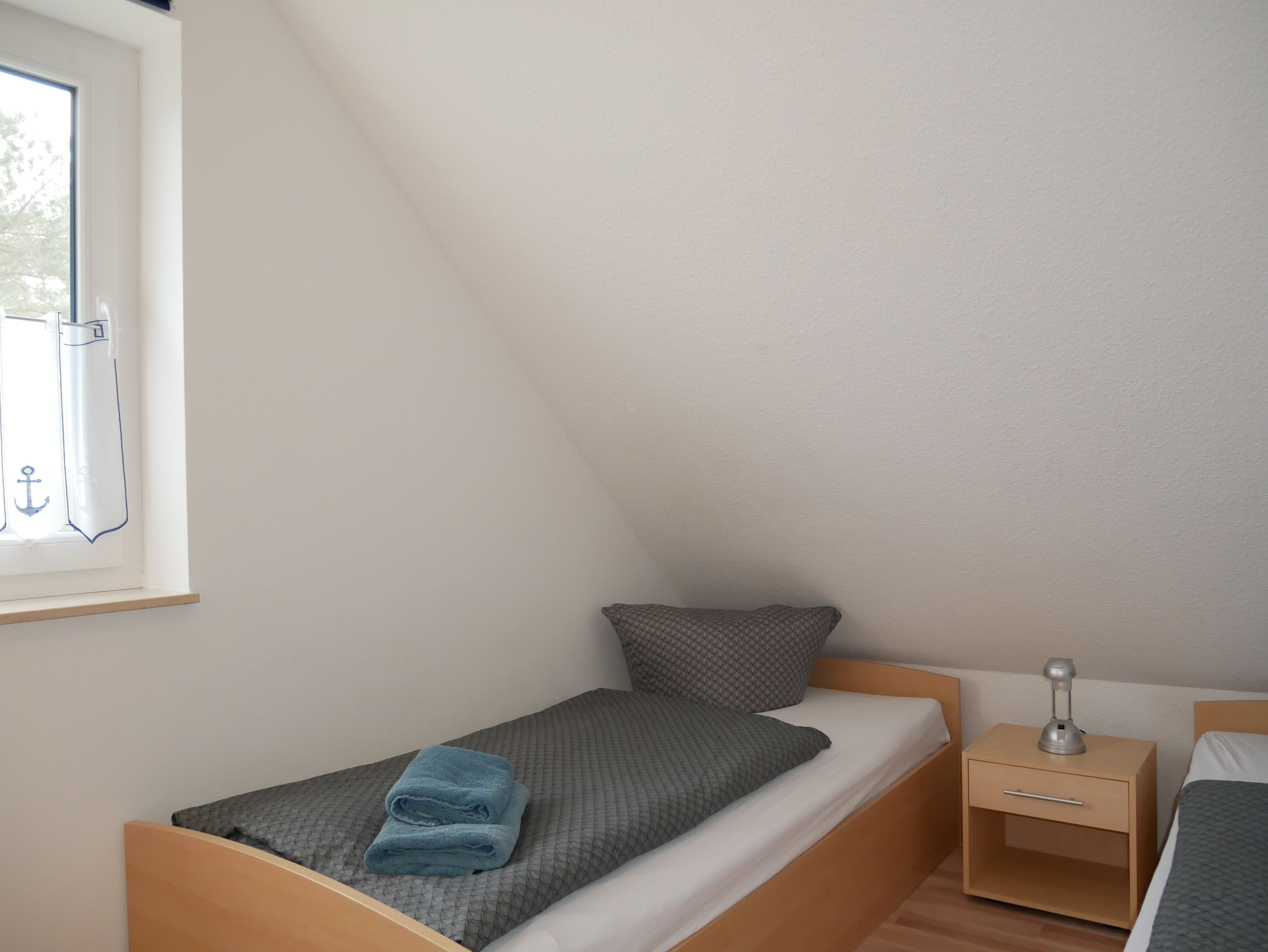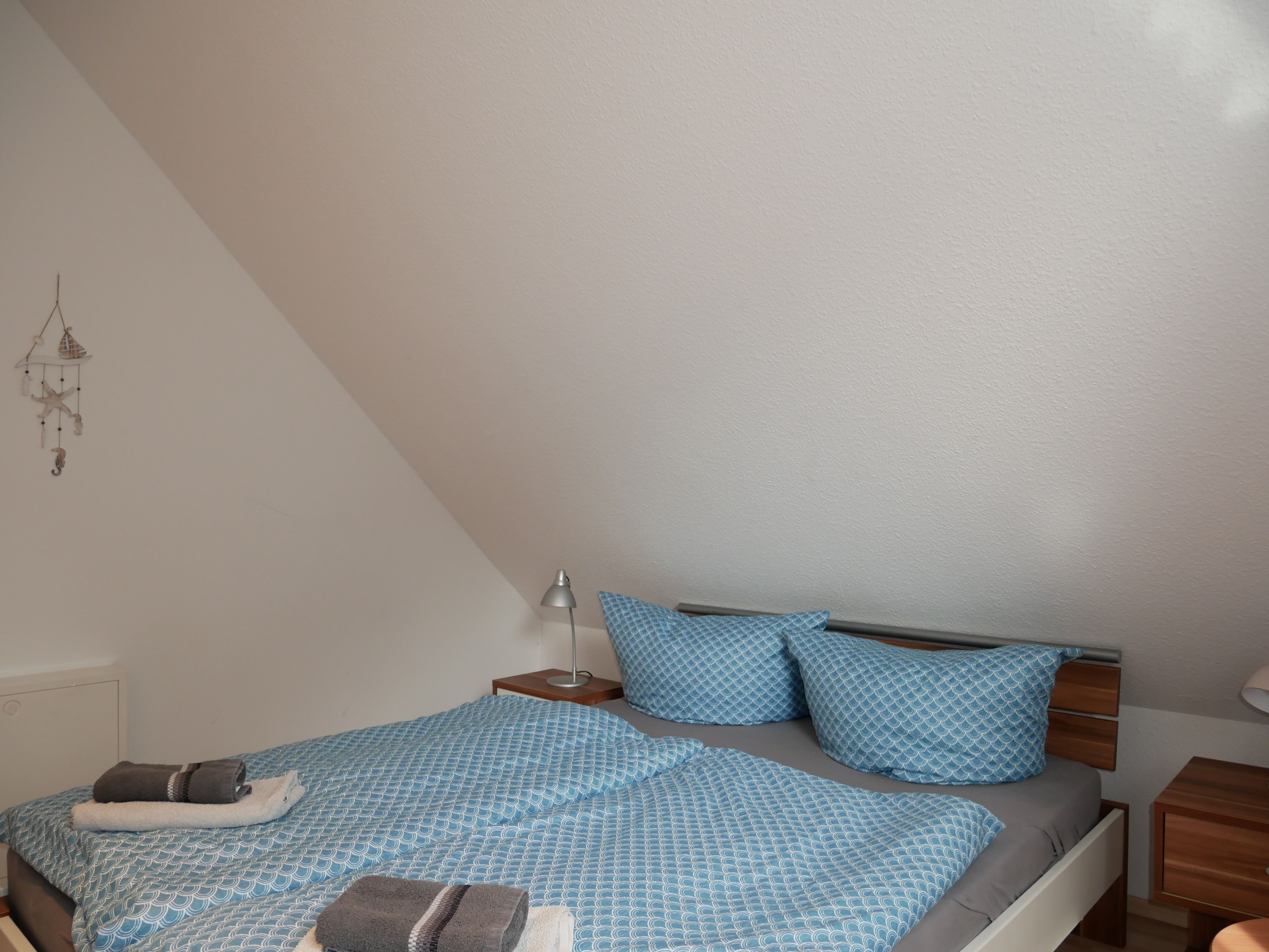 Das Obergeschoss verfügt über zwei mit Fliegenschutzgittern ausgestattete Schlafzimmer (1 x Doppelbett mit einteiliger Matratze :1,40 x 2,00m, 1 x zwei Einzelbetten: je 0,90 x 2,00m - je Bett eine 4-Jahreszeitenbettdecke und ein Kissen) sowie ein Bad mit Dusche und WC. Ein Haartrockner steht zur Benutzung bereit.