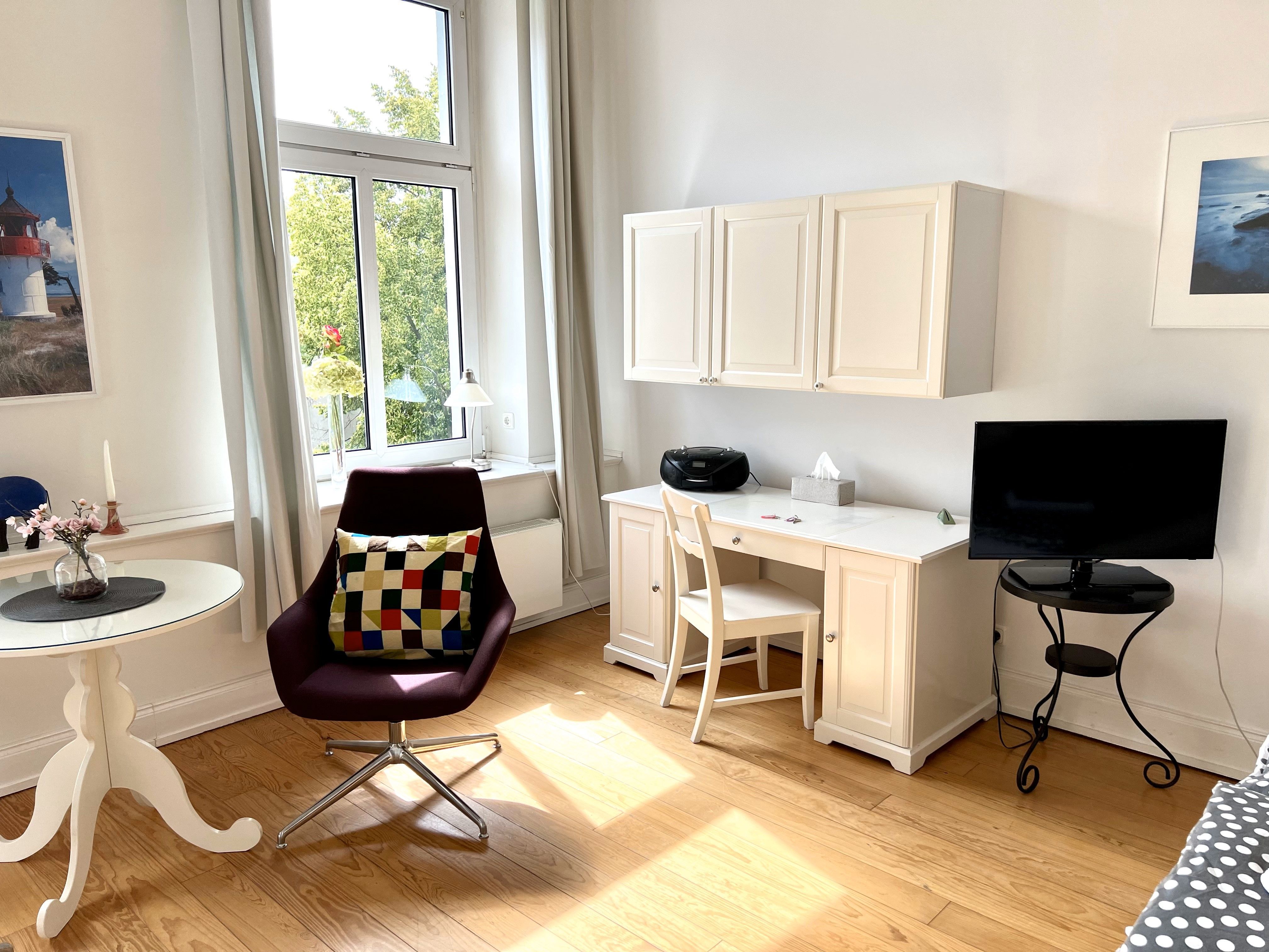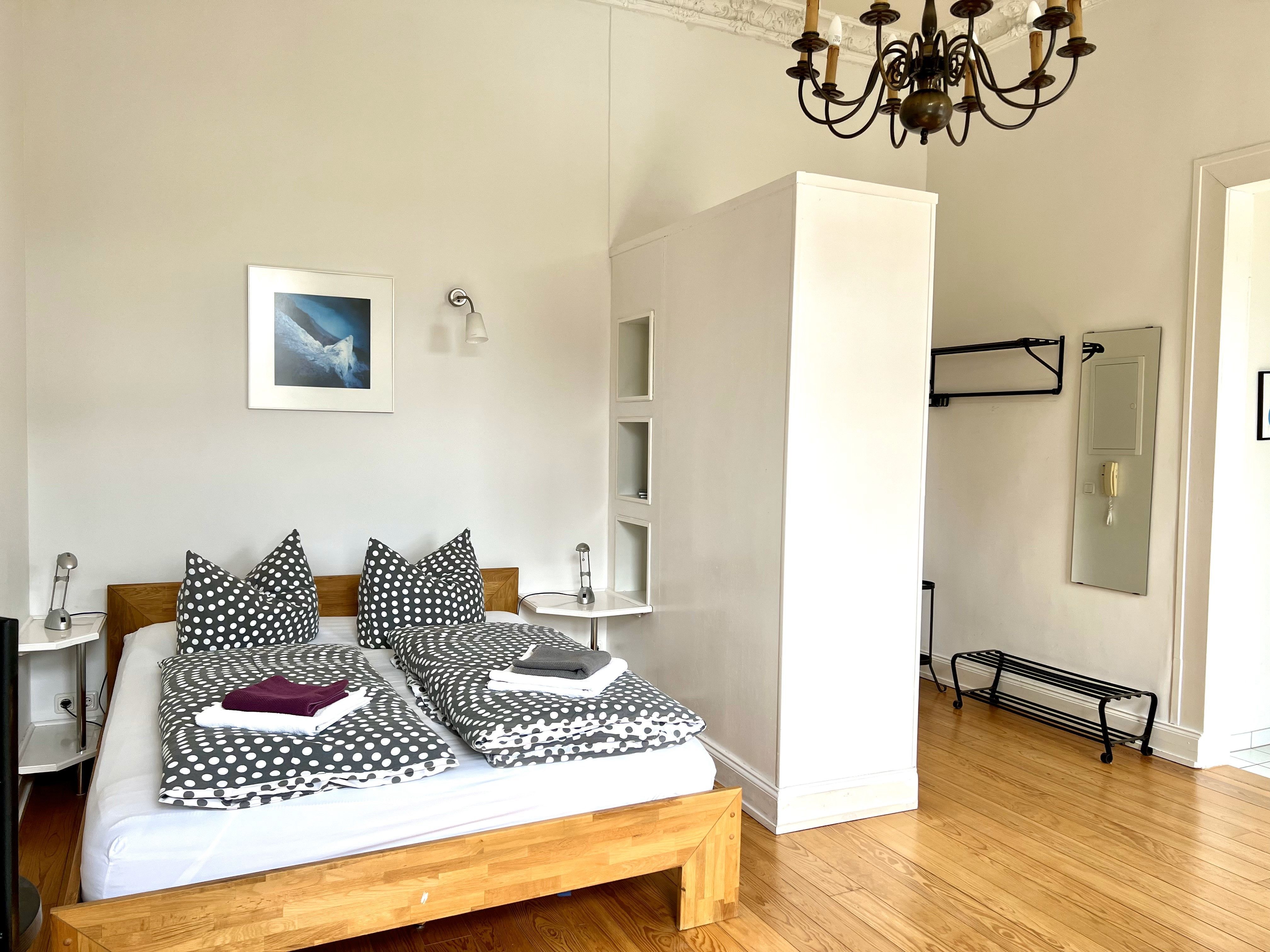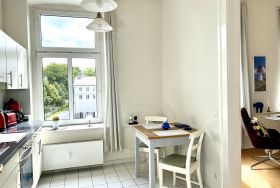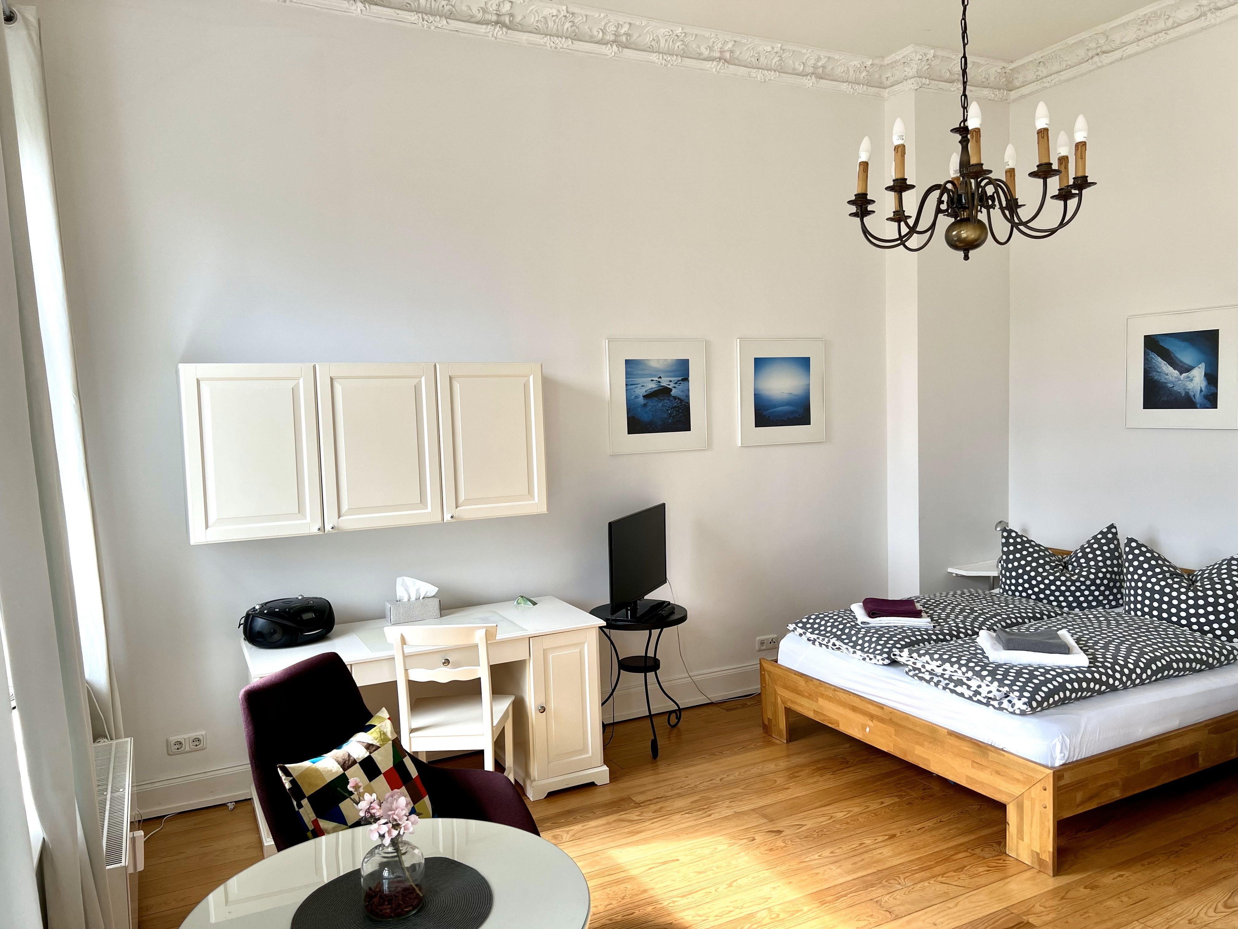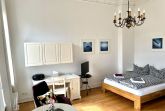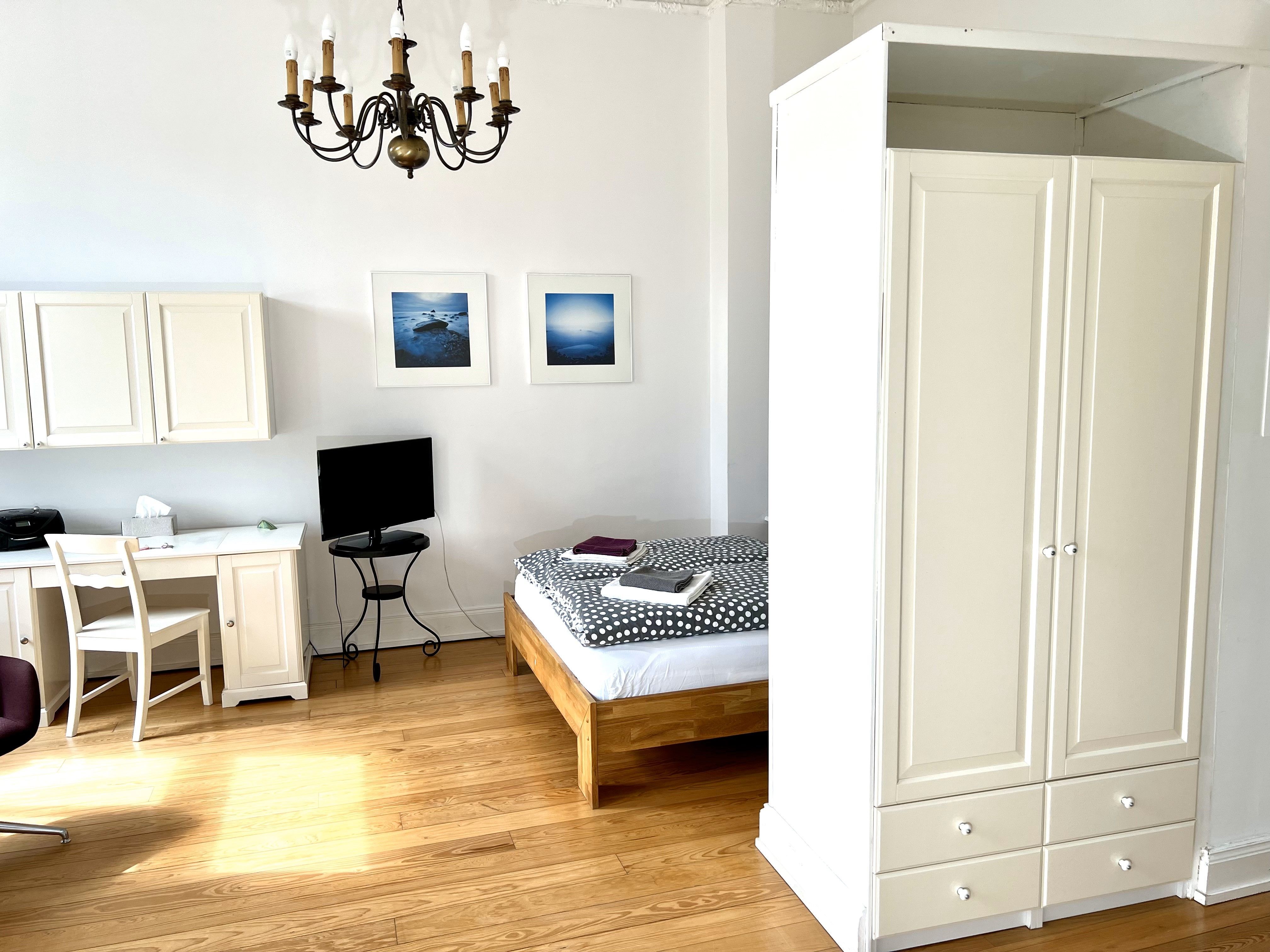 Die Wohnung ist insgesamt 37,4 qm groß und bietet ein Wohn-/Schlafzimmer mit einem Doppelbett (160 x 200 cm), Sitzecke und Arbeitsplatz, eine Küche mit Eßplatz und Dusche/WC. WLan kostenfrei.