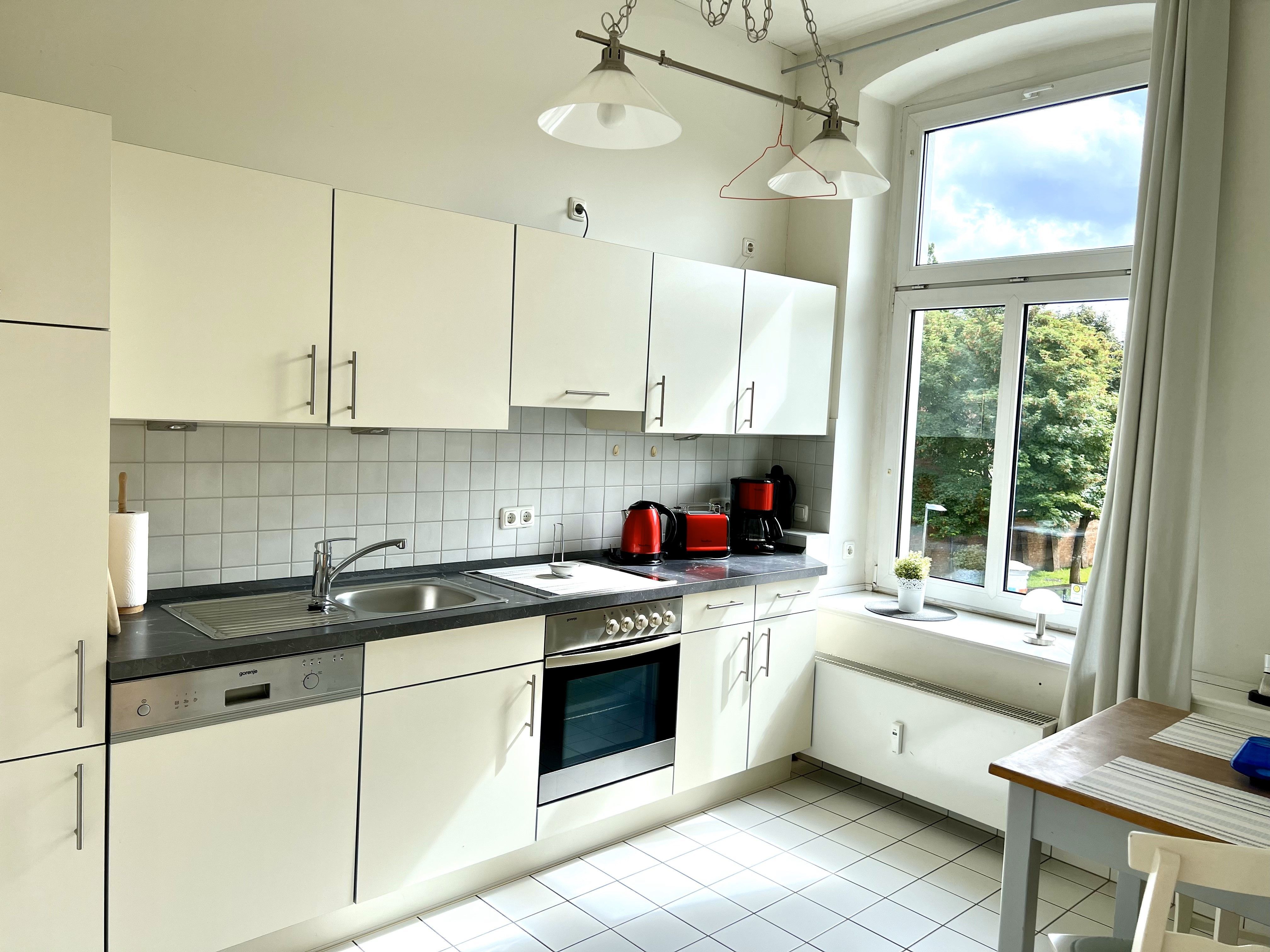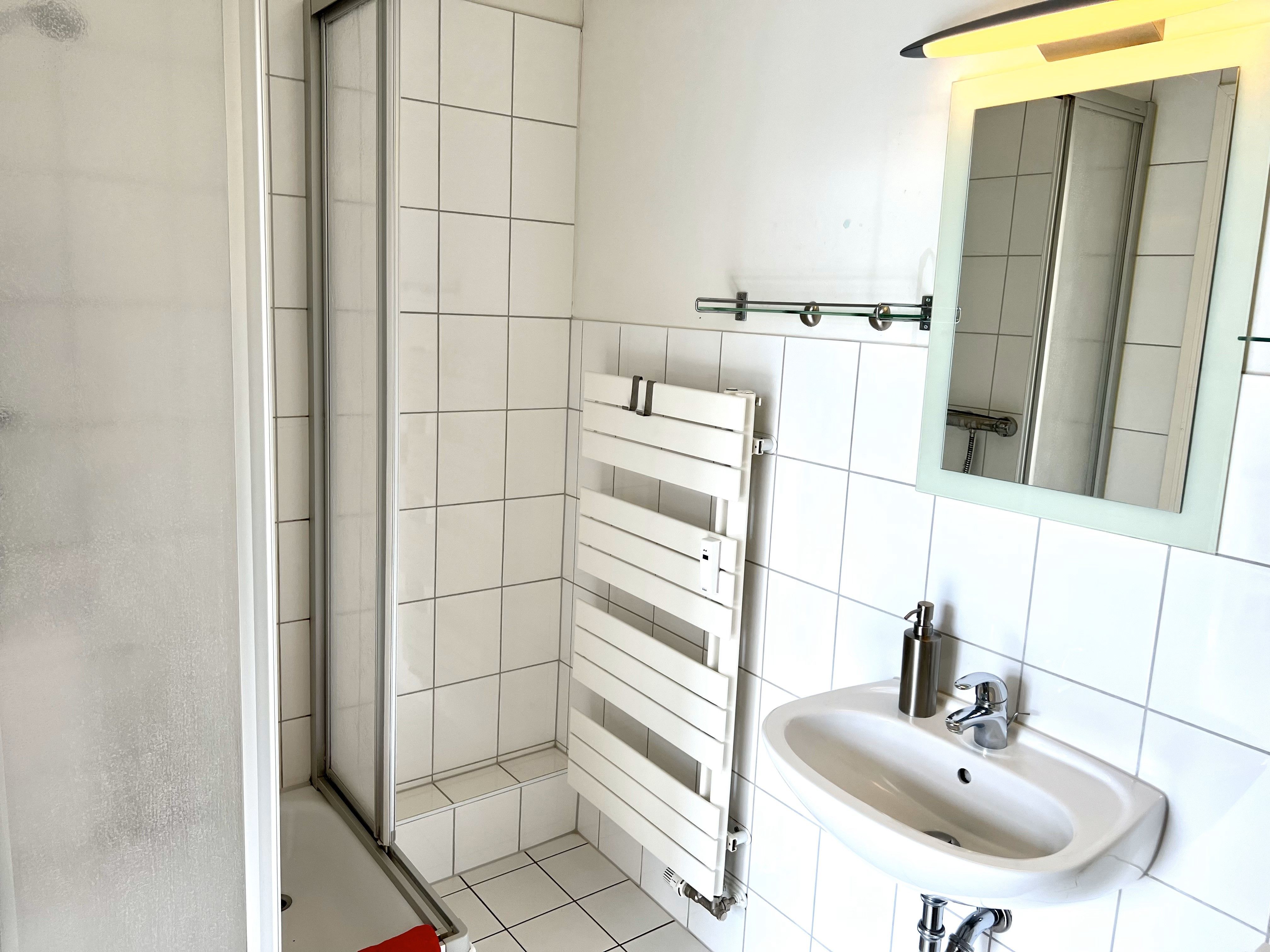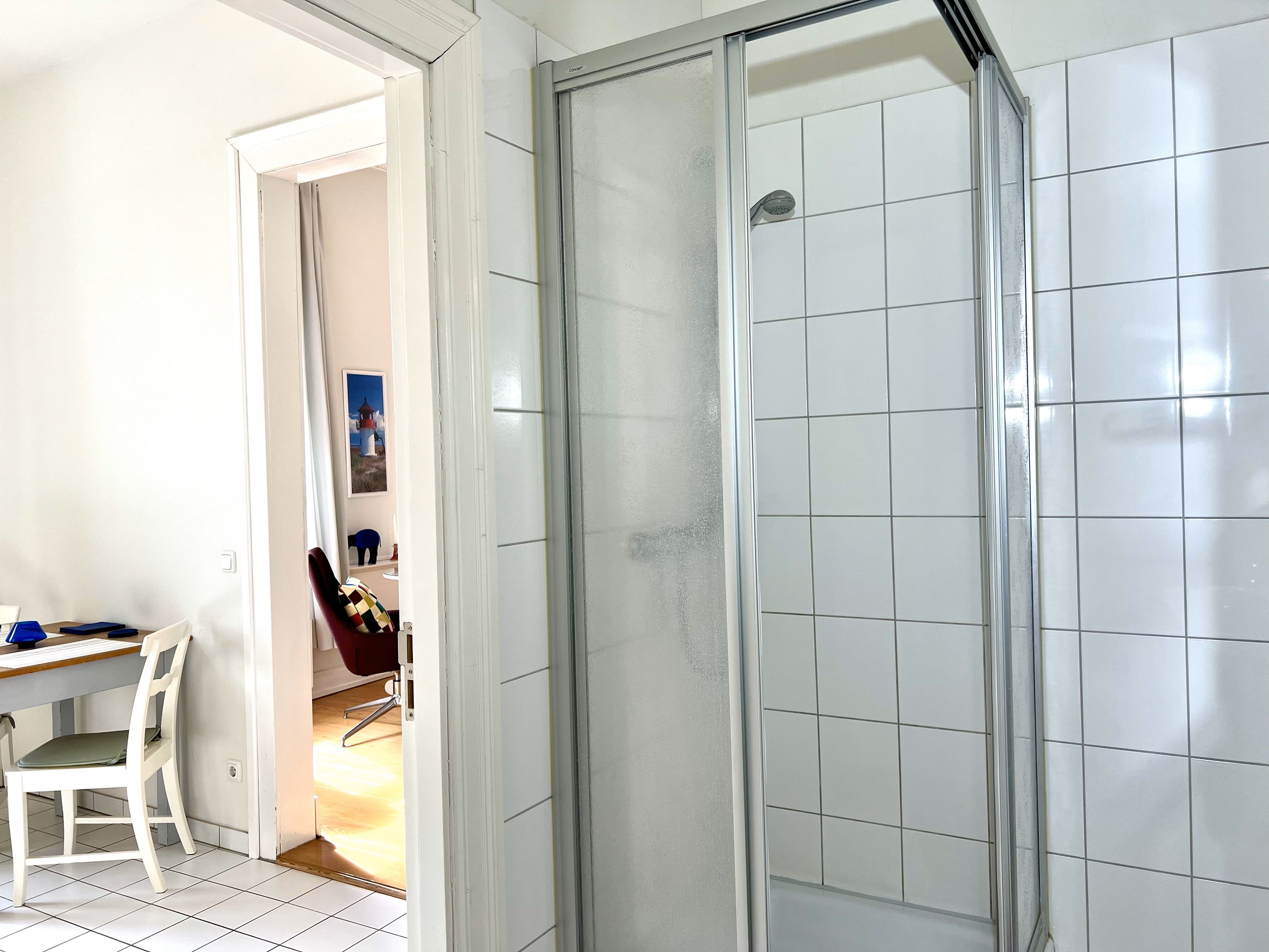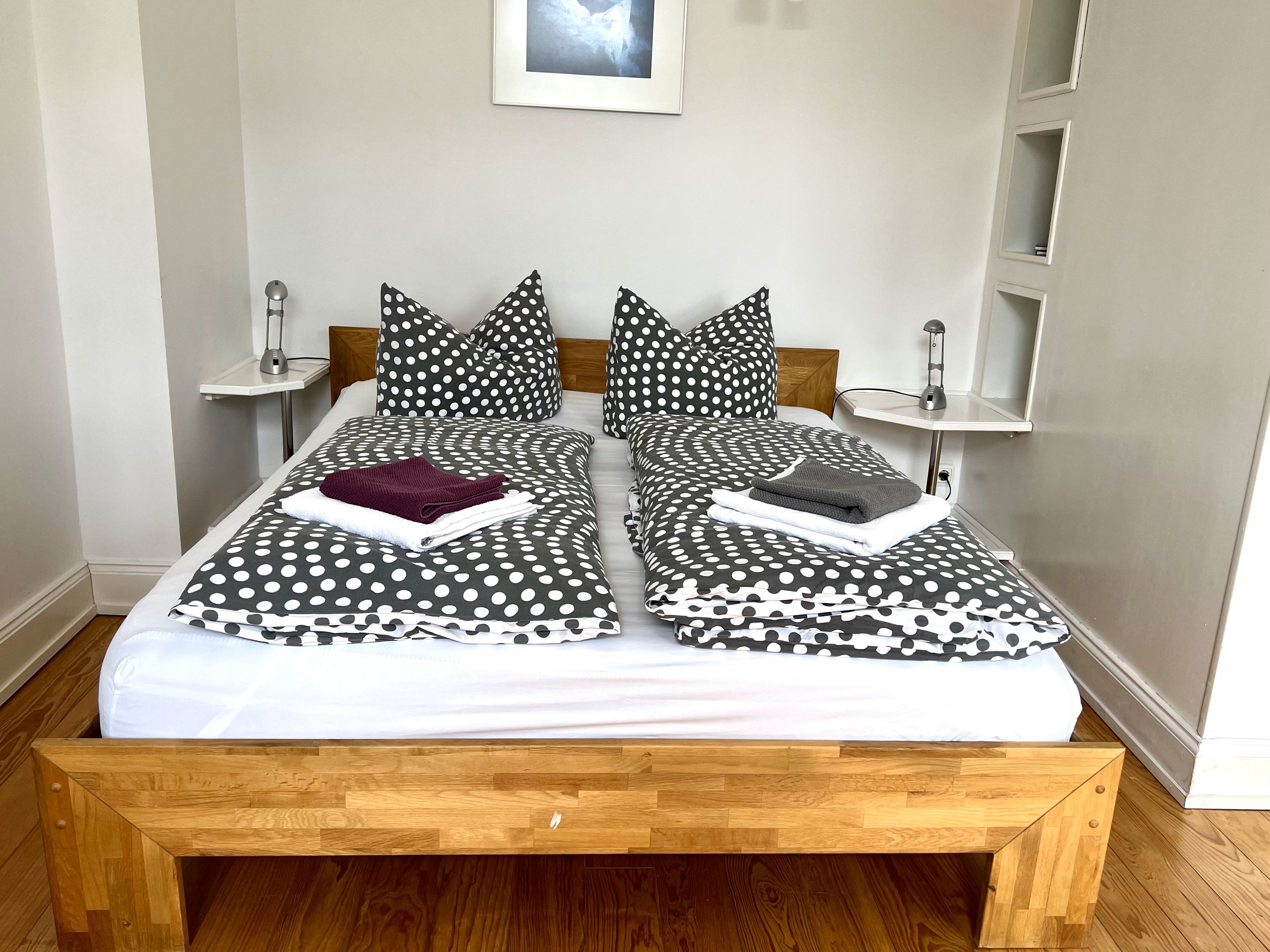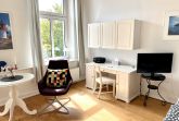 Die Wohnung ist insgesamt 37,4 qm groß und bietet ein Wohn-/Schlafzimmer mit einem Doppelbett (160 x 200 cm), Sitzecke und Arbeitsplatz, eine Küche mit Eßplatz und Dusche/WC. WLan kostenfrei.