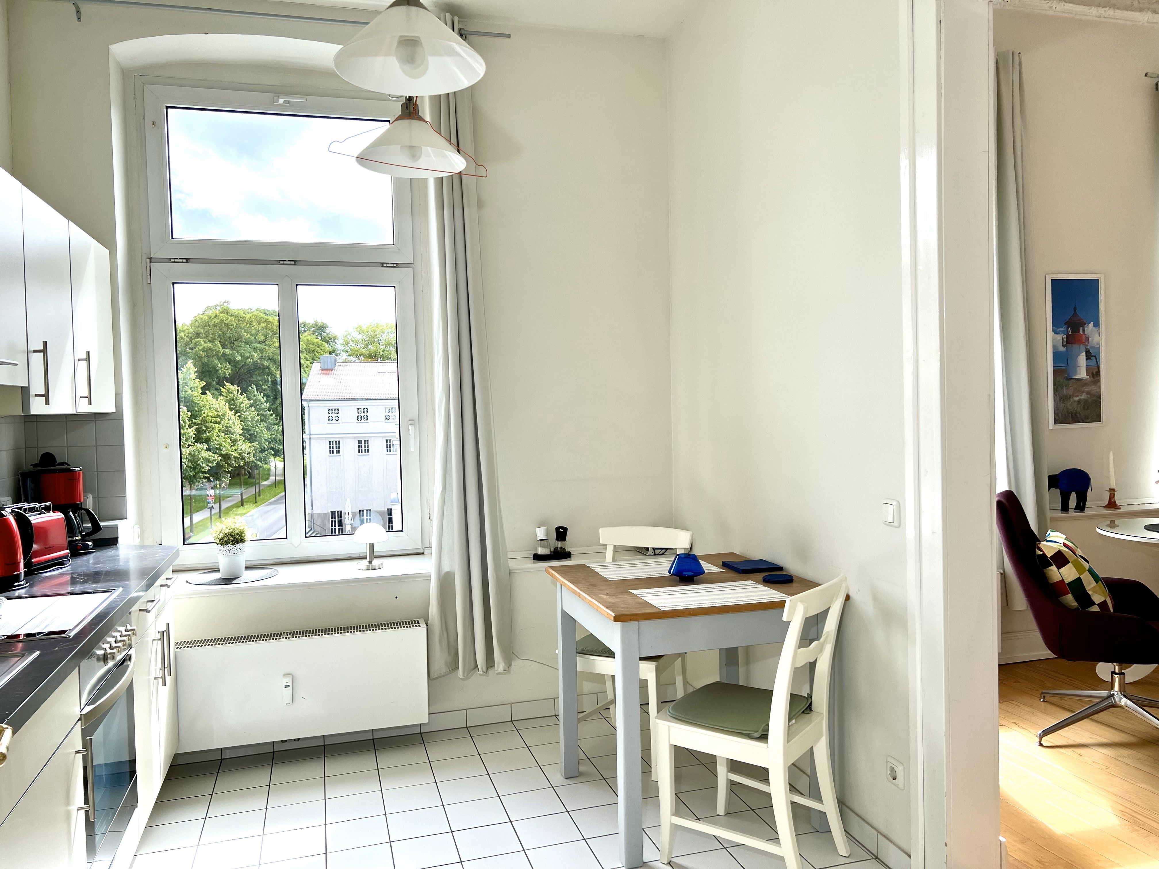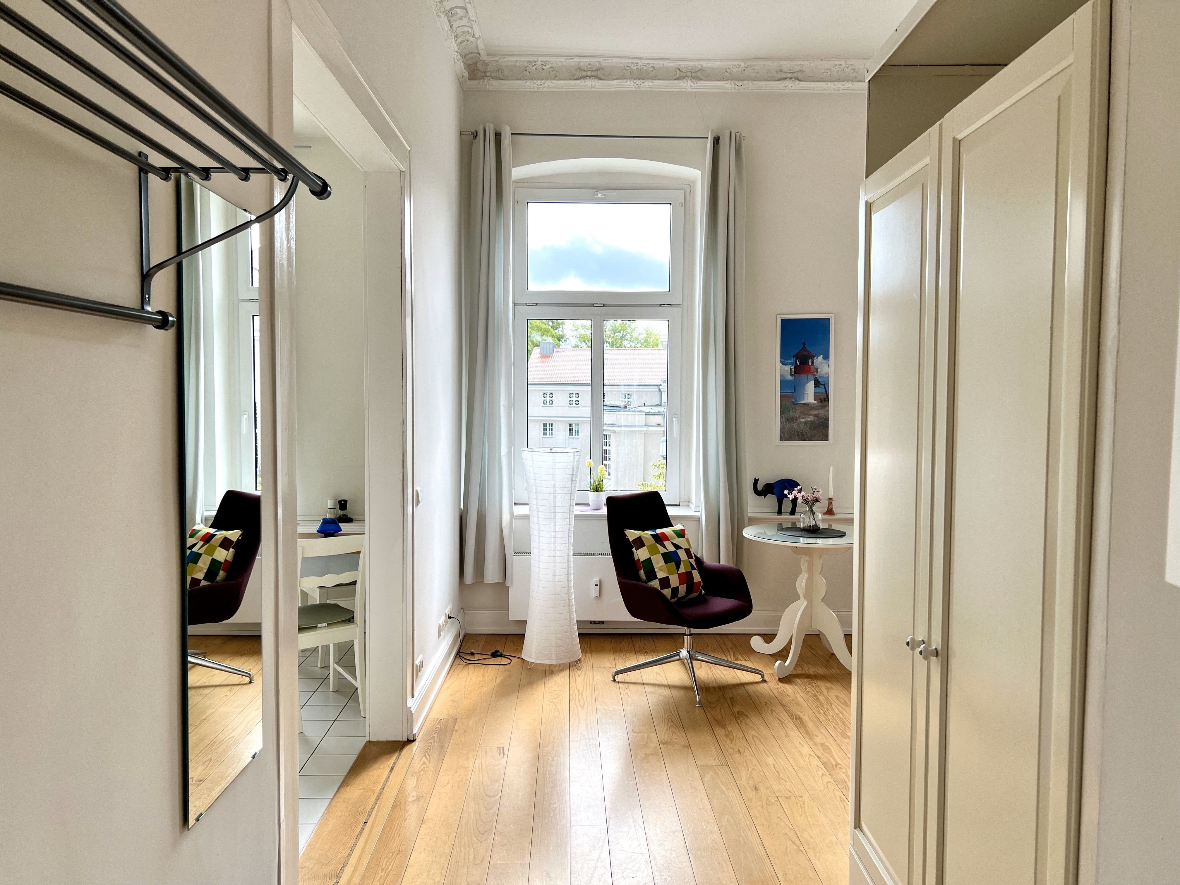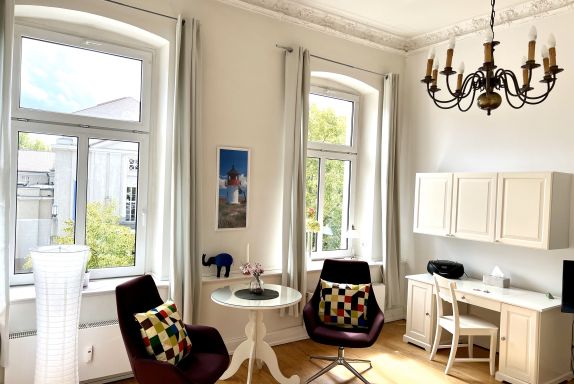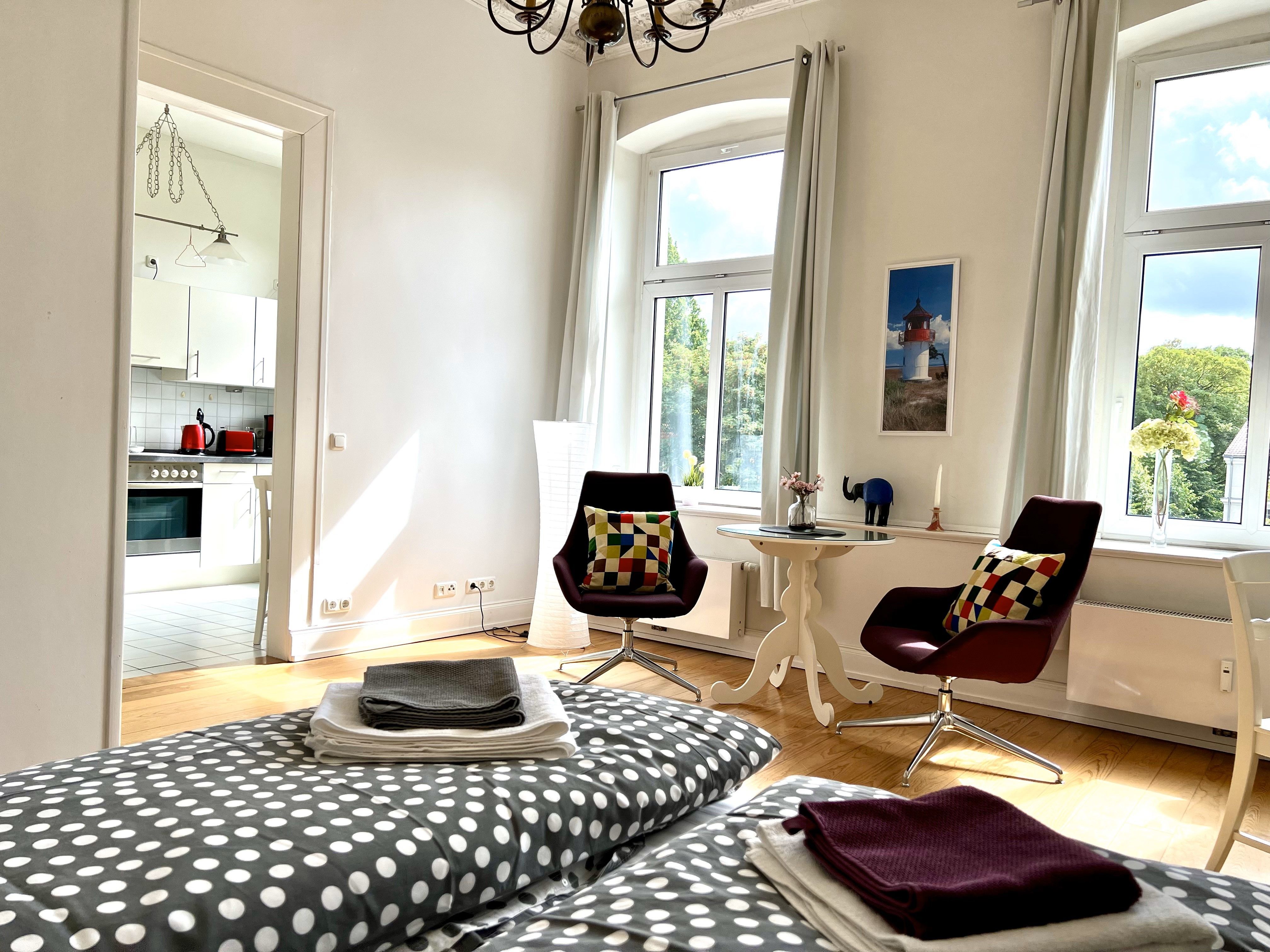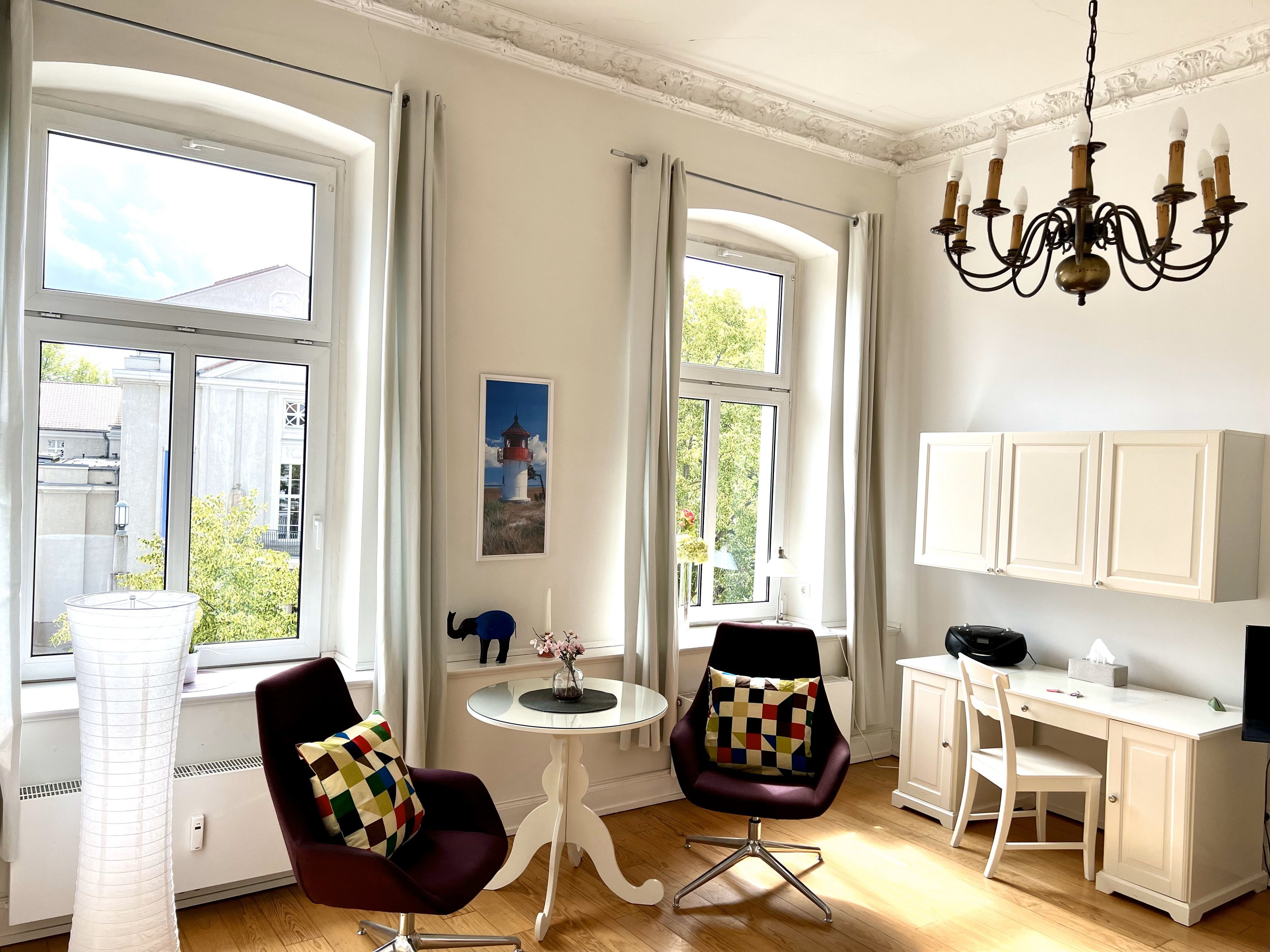 Das modern eingerichtete, markante Jugendstil-Haus liegt auf der Altstadtinsel und am Strelasund, umgeben vom frisch renovierten Theater, vom Kniepertor und von der mittelalterlichen Stadtmauer.