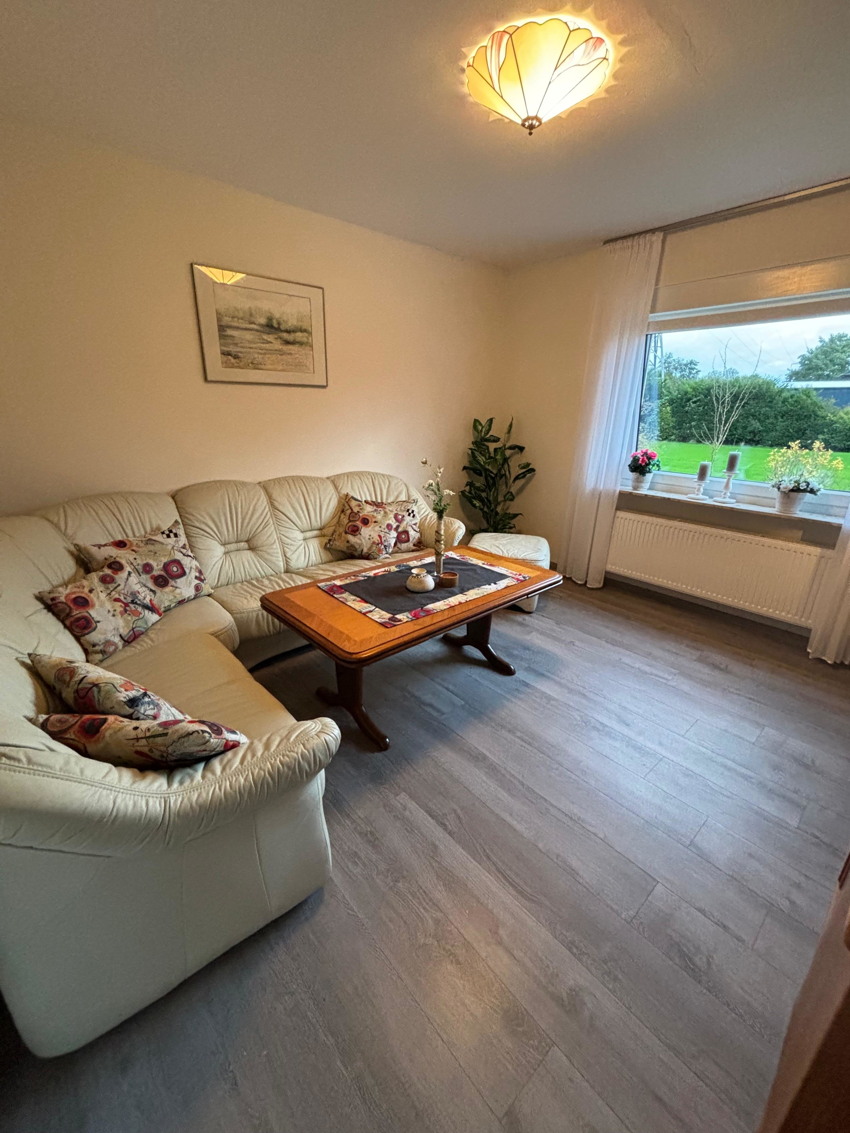 Die voll ausgestattete Küche lädt zu gemeinsamen Kochabenden ein, während die ruhige Lage für erholsame Nächte sorgt. Trotz der idyllischen Umgebung erreichen Sie das Zentrum schnell, wo zahlreiche Freizeitmöglichkeiten auf Sie warten. Vom großzügigen Garten aus können Sie den herrlichen Blick über die Felder genießen. Der Garten ist mit einer Terrasse sowie Tischen und Stühlen ausgestattet, sodass Sie bei schönem Wetter wunderbar im Freien entspannen können.