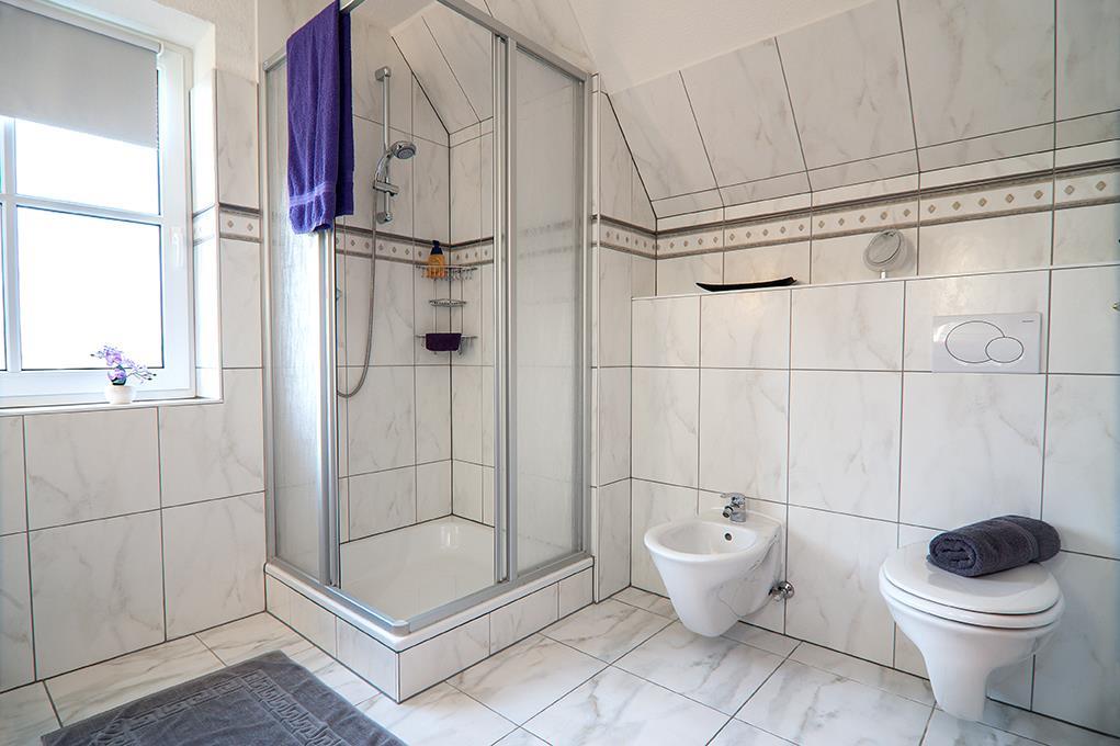 Ein großes Badezimmer mit Dusche, 2 Waschtischen und WC (1xBidet), sowie ein separates Gäste-WC sind vorhanden.