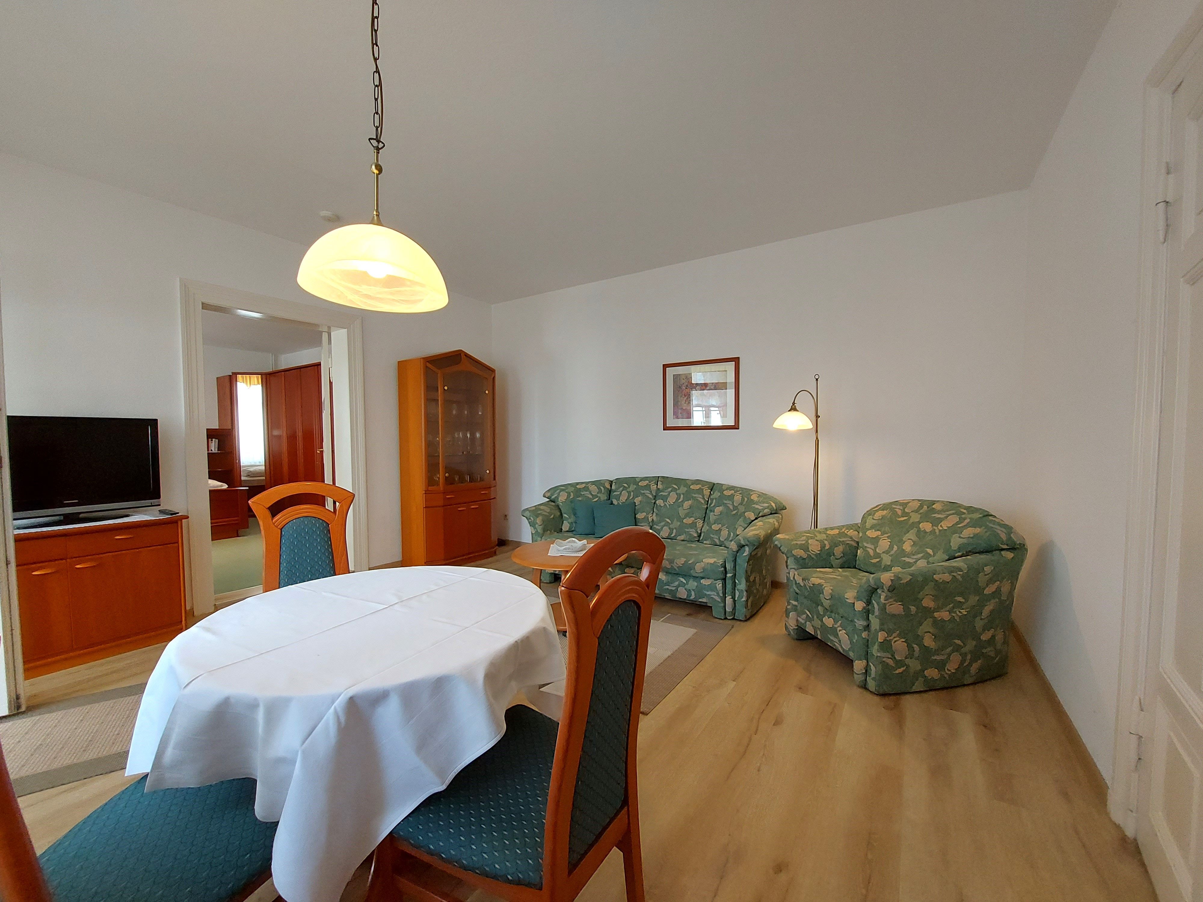Die Ferienwohnung 10 befindet sich in Hochparterre des Hauses und verfügt über einen Meerblick. Sie teilt sich auf in ein Eingangsbereich mit einer Küche. Die Küche ist ausgestattet mit Herd, Backofen, Spülmaschine, Kühlschrank mit Gefriermöglichkeit, Mikrowelle, Kaffeemaschine, Wasserkocher und Toaster. Das Wohnzimmer verfügt über eine gemütliche Couch, Sessel, Flachbildfernseher und über einen Essbereich.