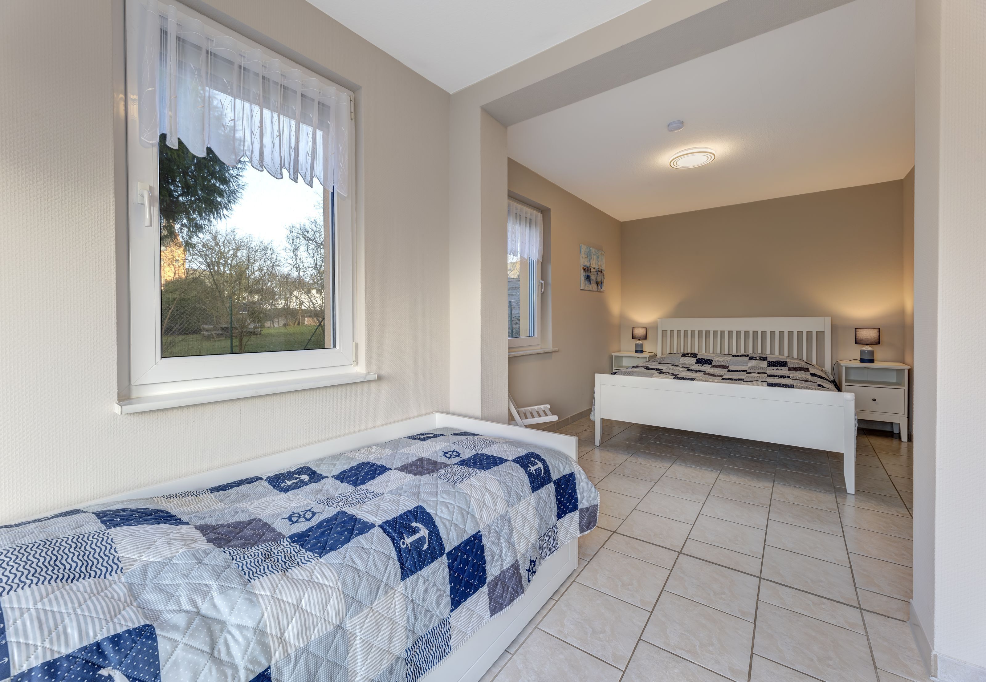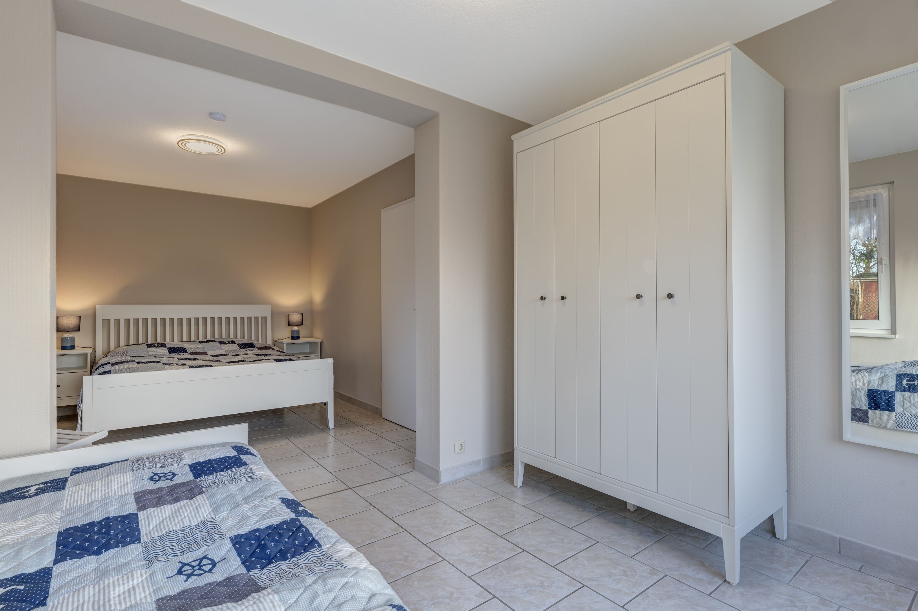 Es bietet Zugang zum Schlafzimmer mit Doppelbett und Einzelbett.