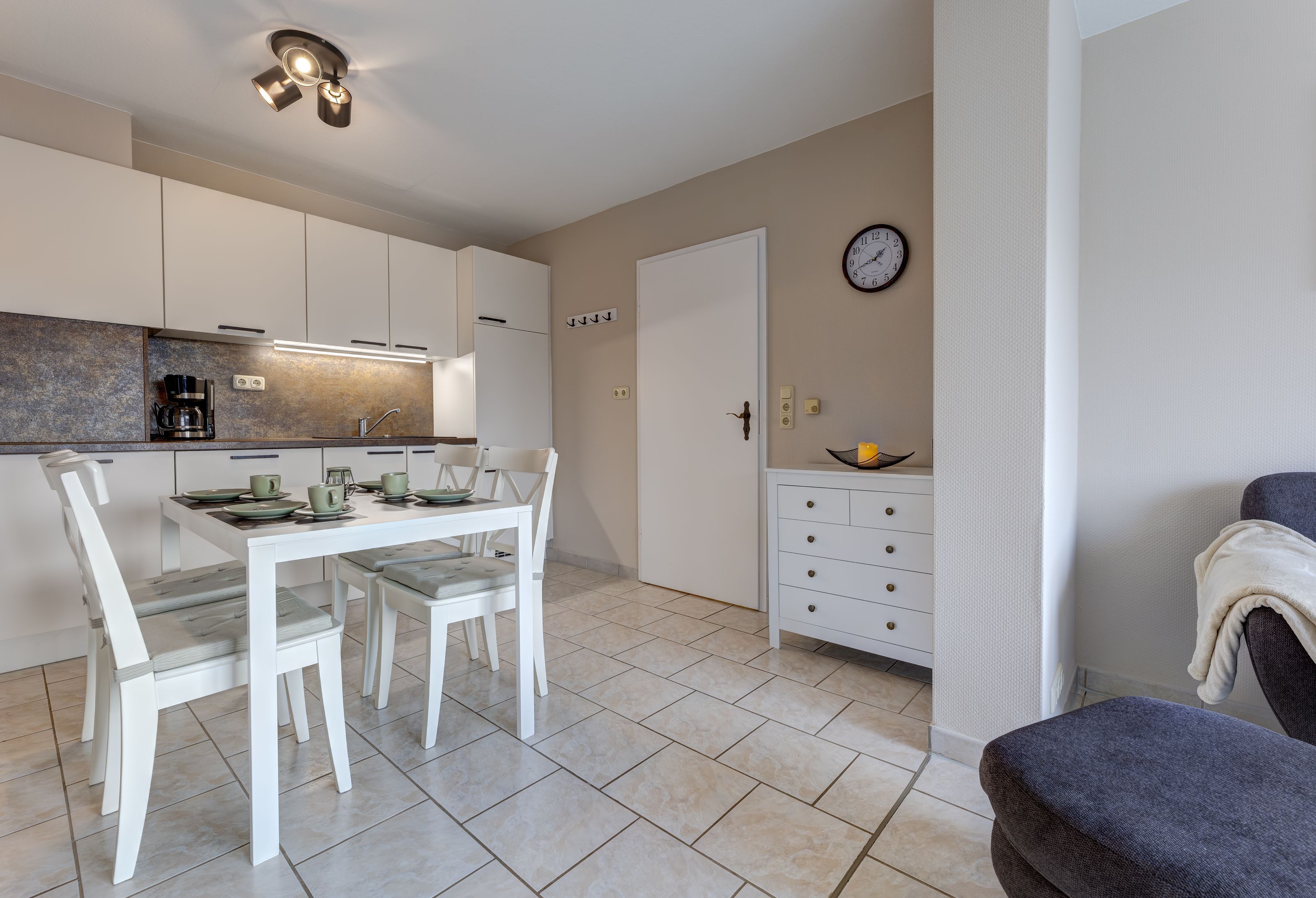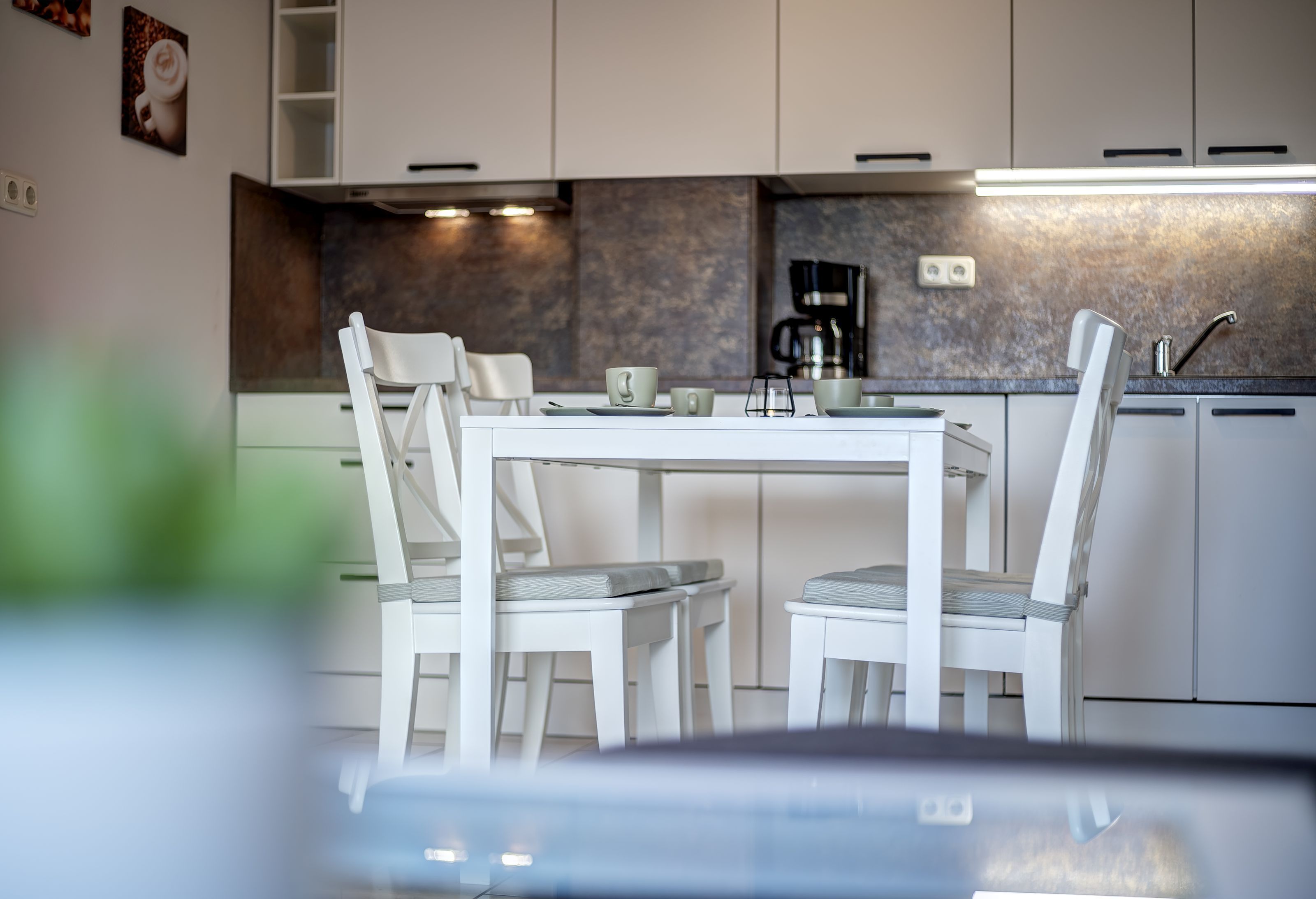 Im jeweils großzügigen Wohn-/Esszimmer finden Sie eine gemütliche Couchecke und einen schönen Essbereich. Die komplett ausgestattete Einbauküche verfügt über Spülmaschine, Induktionskochfeld mit Dunstabzugshaube, Kühlschrank mit Gefrierfach, Kaffeemaschine, Toaster und Wasserkocher.