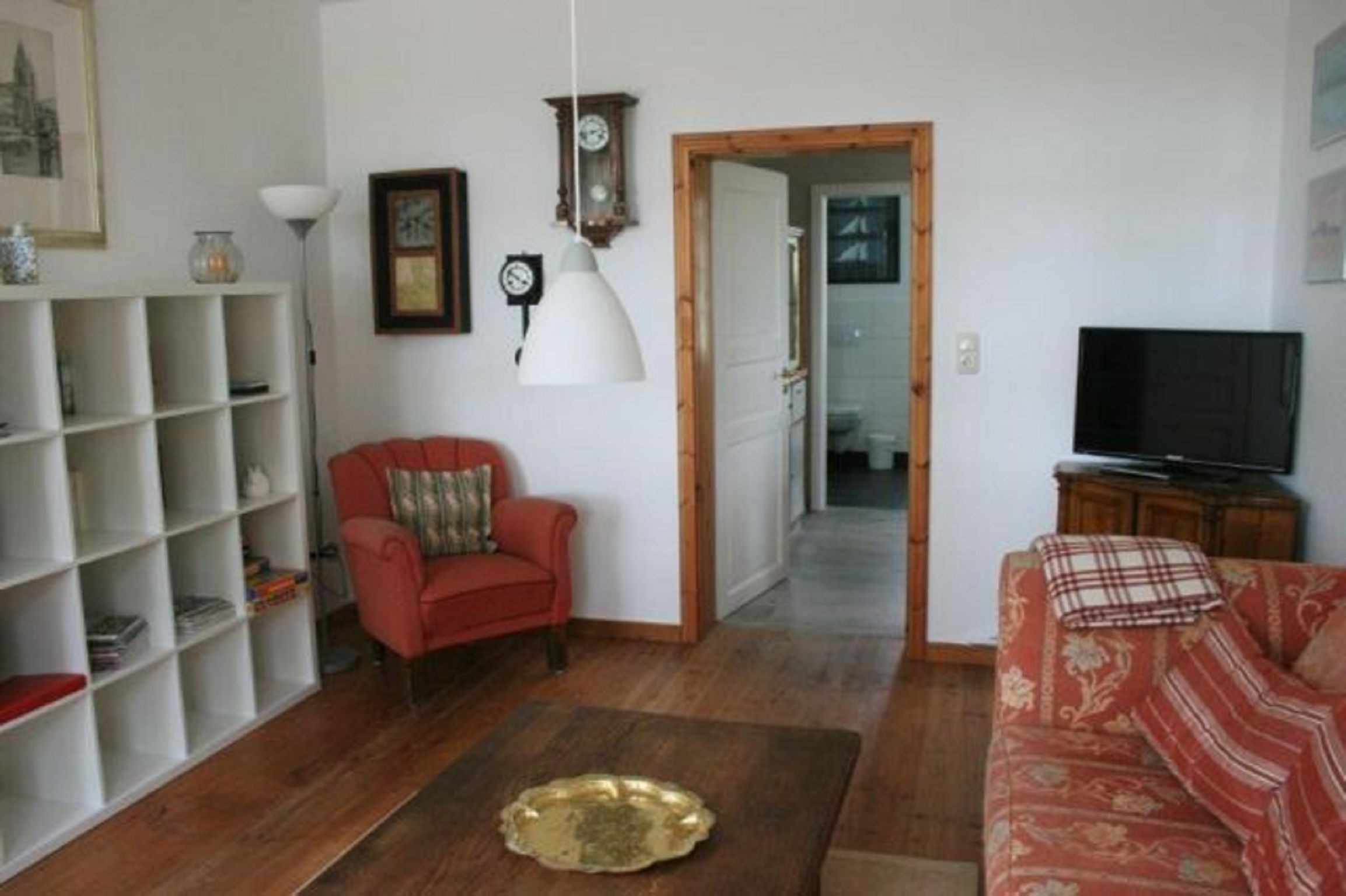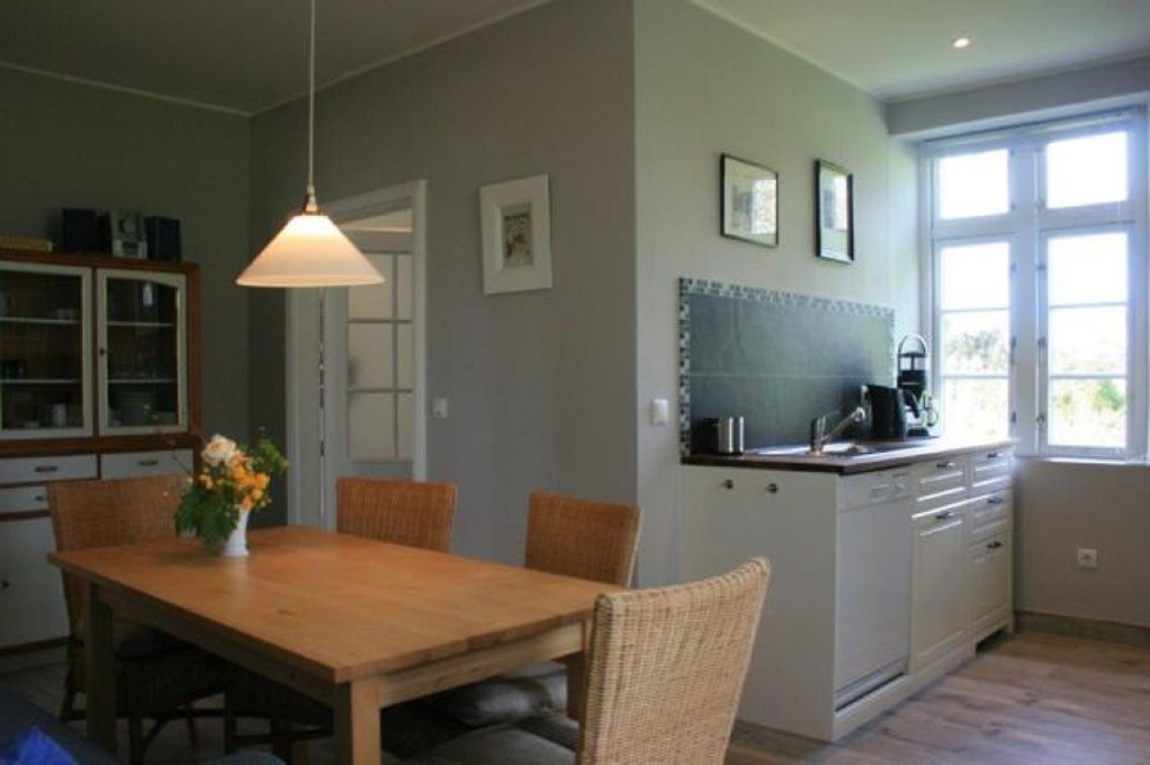 Die Wohnung liegt parterre und wird über den Garten betreten. Sie besteht aus zwei Schlafzimmern, einem Badezimmer, einem Wohnzimmer sowie einem kombinierten Ess- und Küchenbereich.