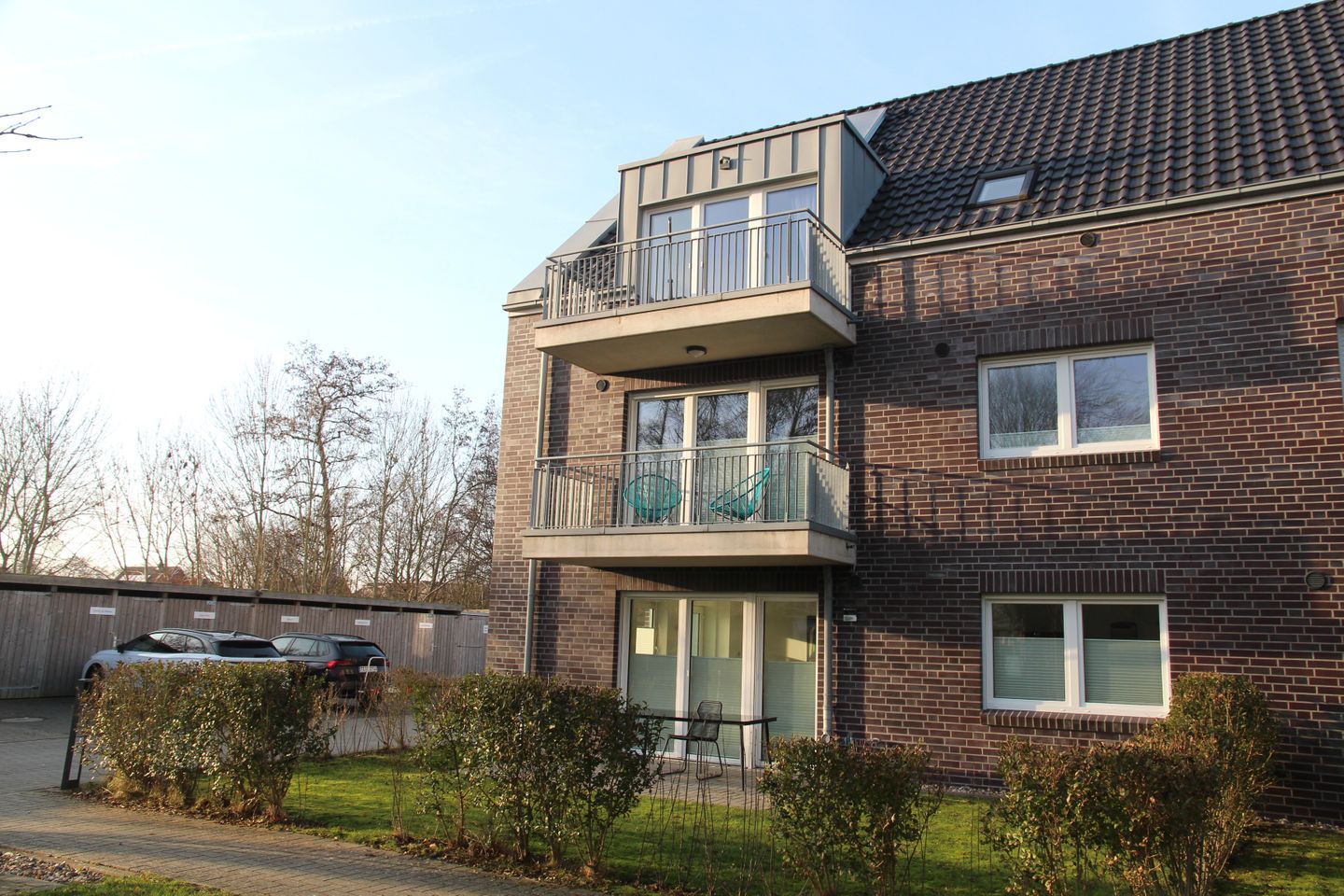 Ein PKW-Einstellplatz und ein davor liegender Außenabstellraum mit Stromanschluss für mitgebrachte Fahrräder gehören ebenfalls zur Wohnung.