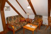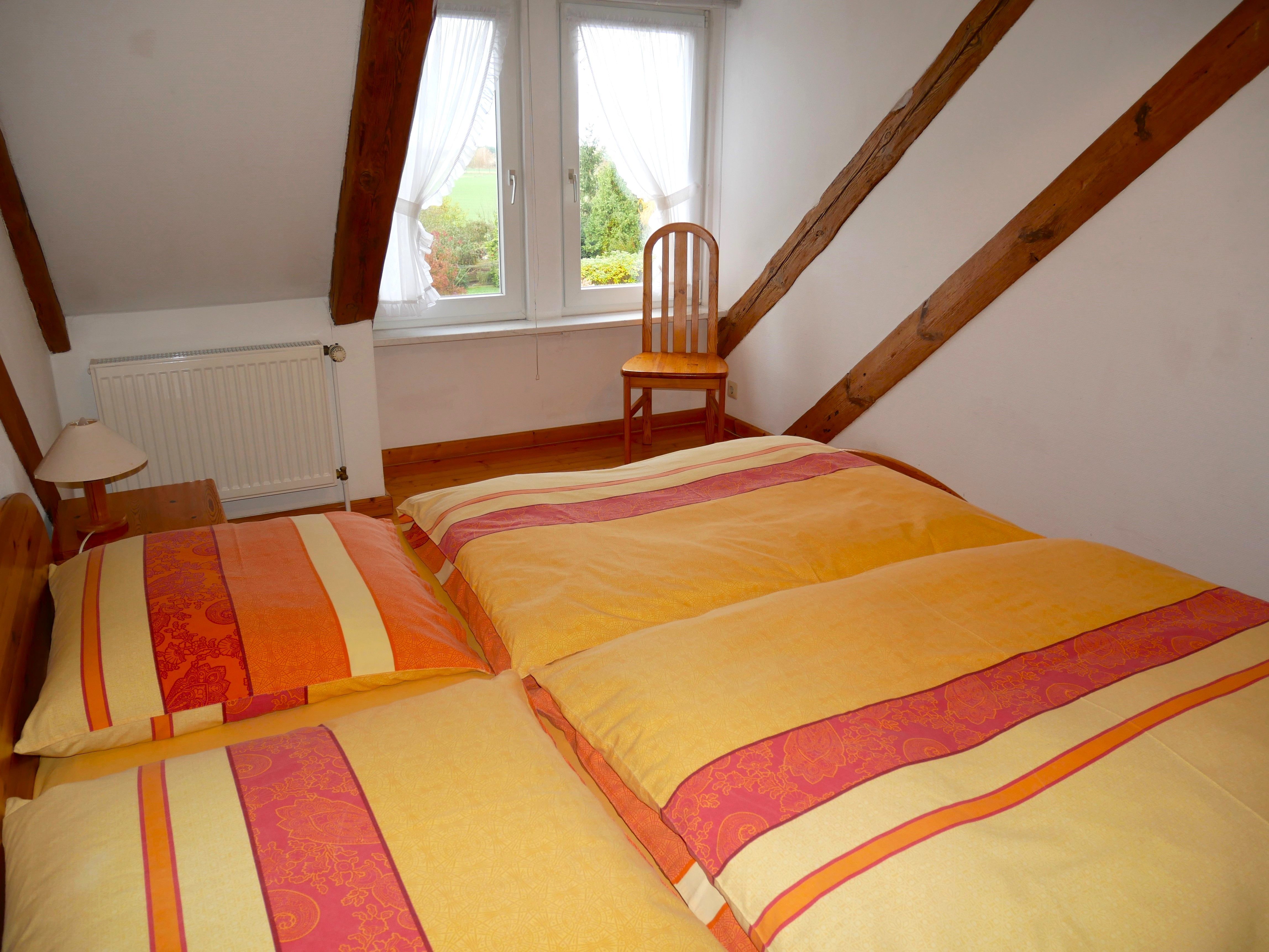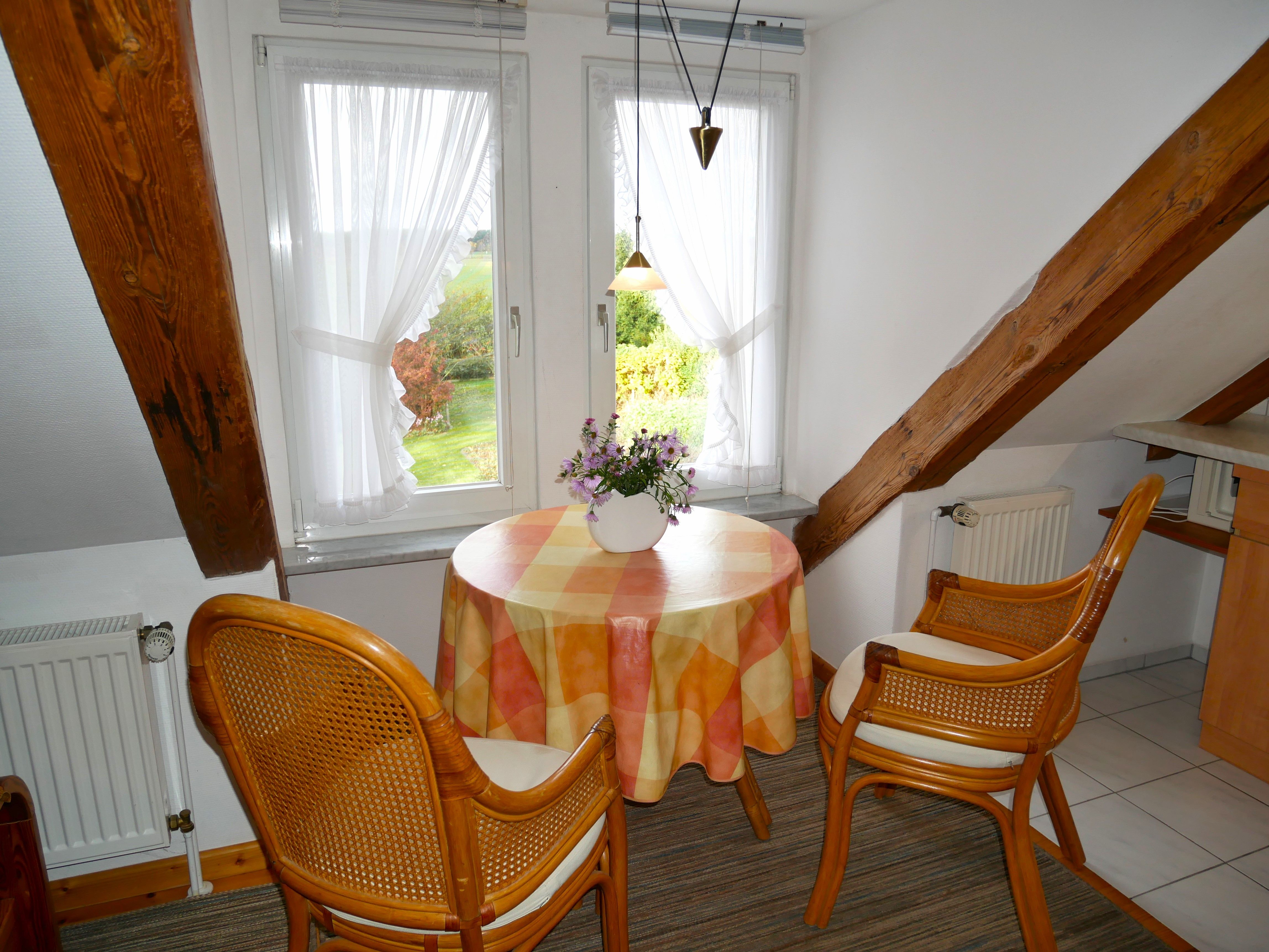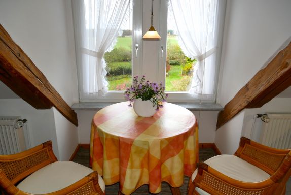 Die 35 qm große komfortable Ferienwohnung befindet sich im 1. Obergeschoss ist für bis zu 3 Pers. (2 Erw. + 1 Kind max. 3 Jahre) geeignet und bietet einen herrlichen Ausblick in unseren Garten sowie in die offene Landschaft mit Feldern, Wiesen, Wald und Oderhaff.